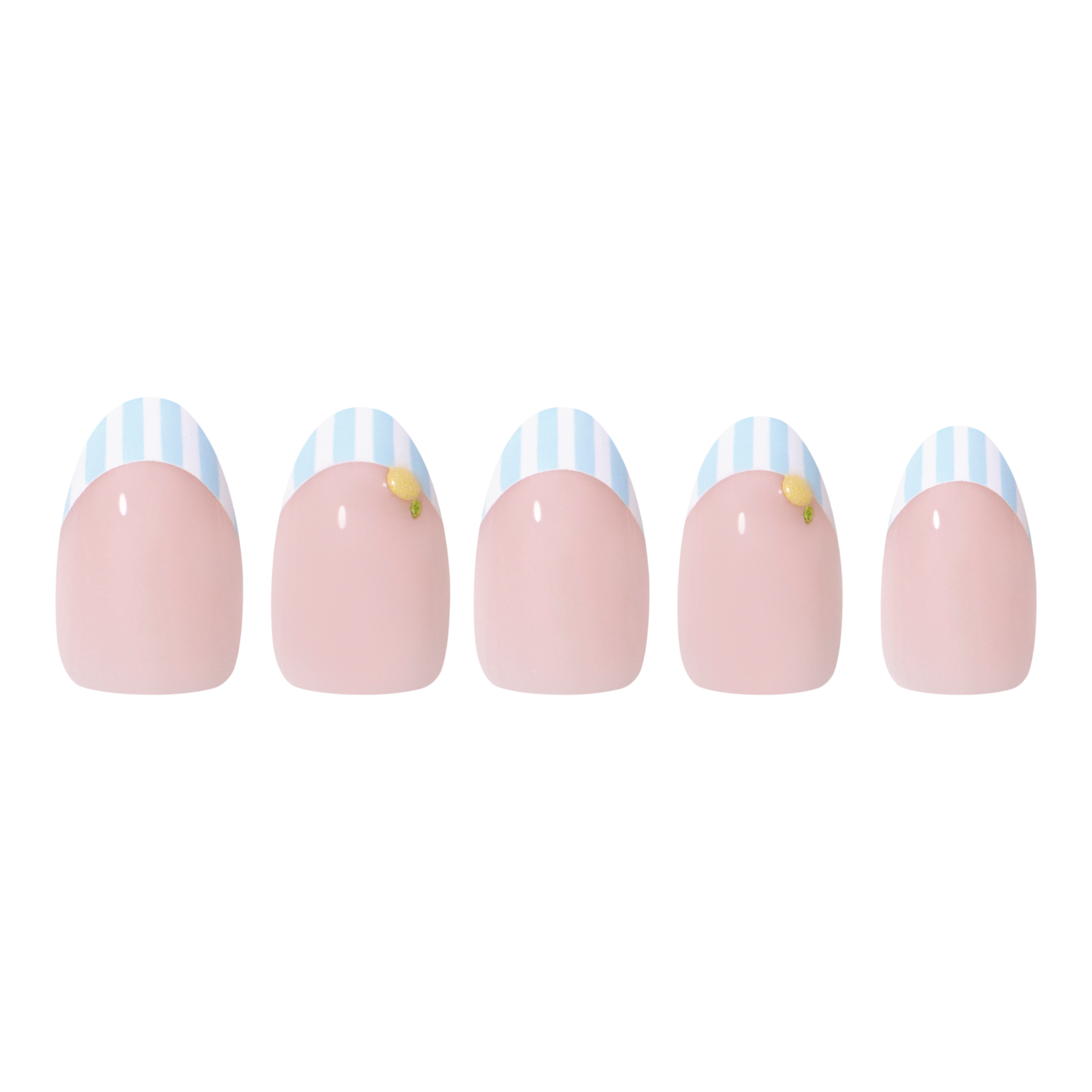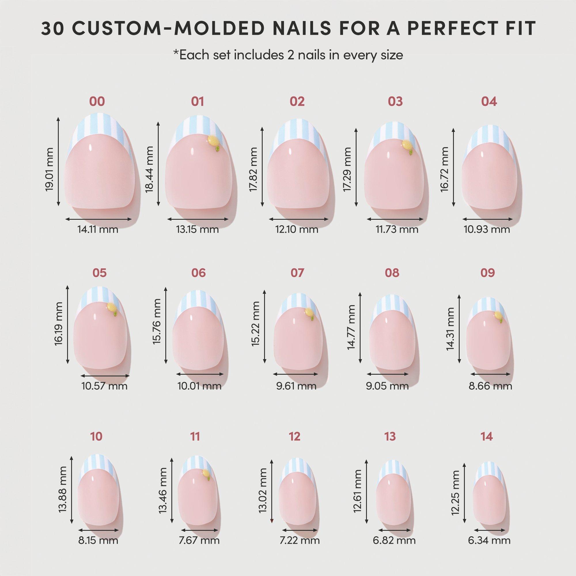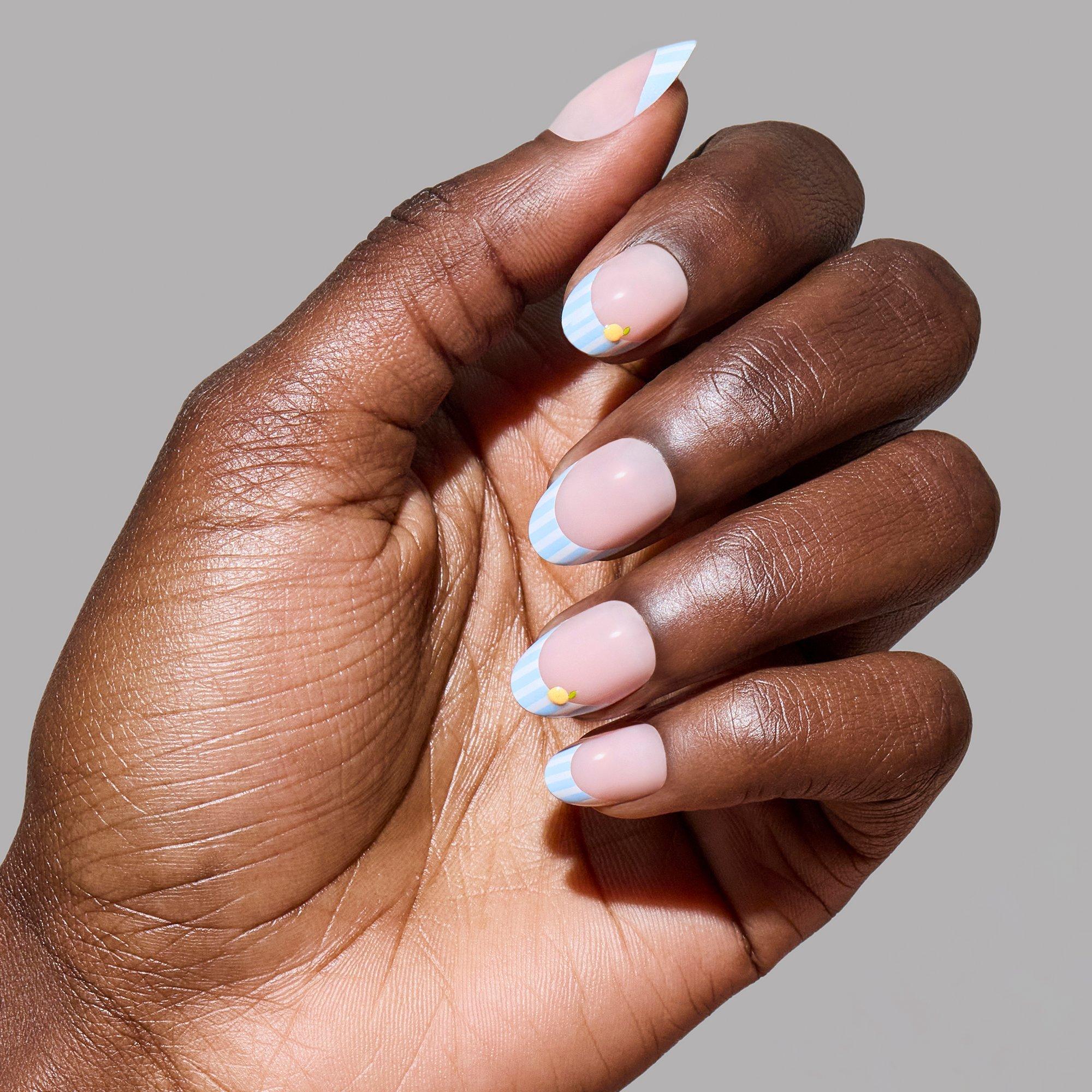 Channel sun-soaked Italian days. Glamnetic’s Summer Fresco Press-On Nail Set features a semi-sheer base with striped blue French tips and dainty lemon accents. Finished with sleek gloss and protective UV top coats, these short oval nails offer salon-quality durability wherever summer takes you.