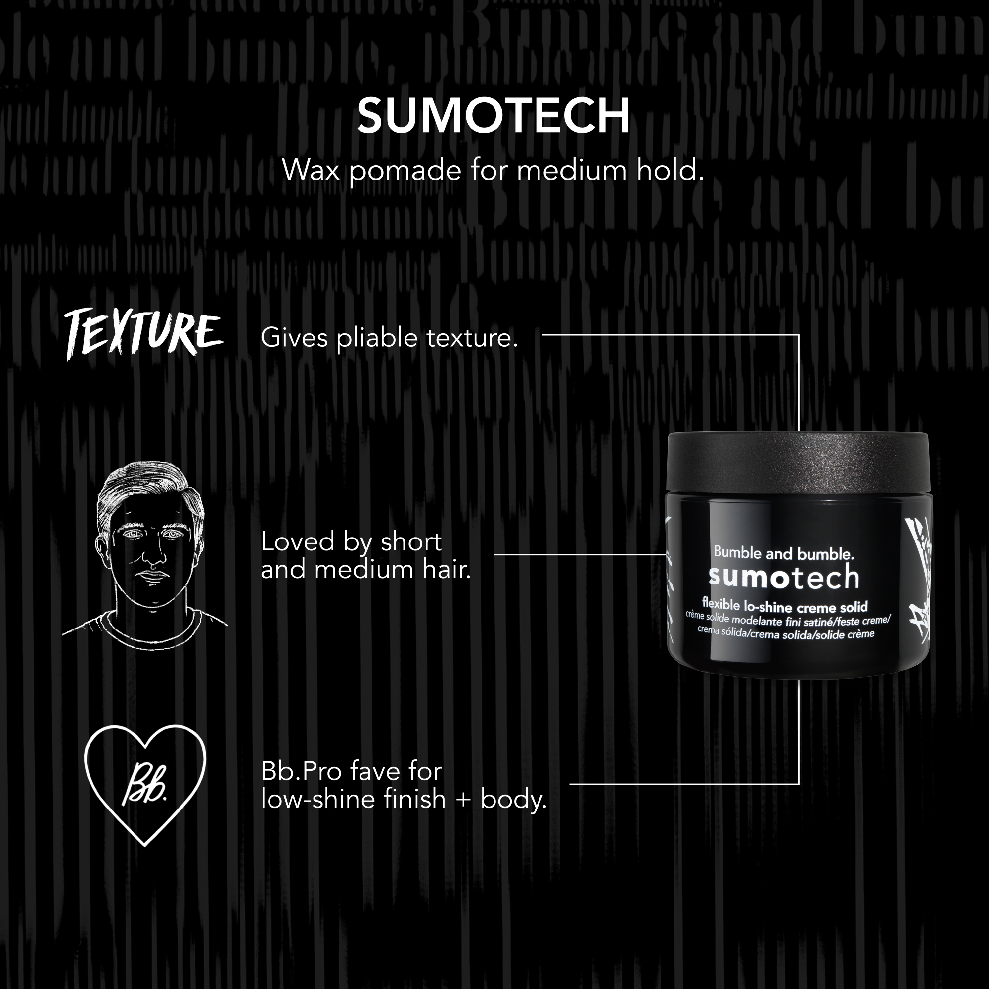 Bumble and bumble Sumotech Flexible Hold Cream Solid is part wax, part paste, part cream - providing pliable texture and flexible hold. This short hair styling product also gives looks a lo-shine finish and body.