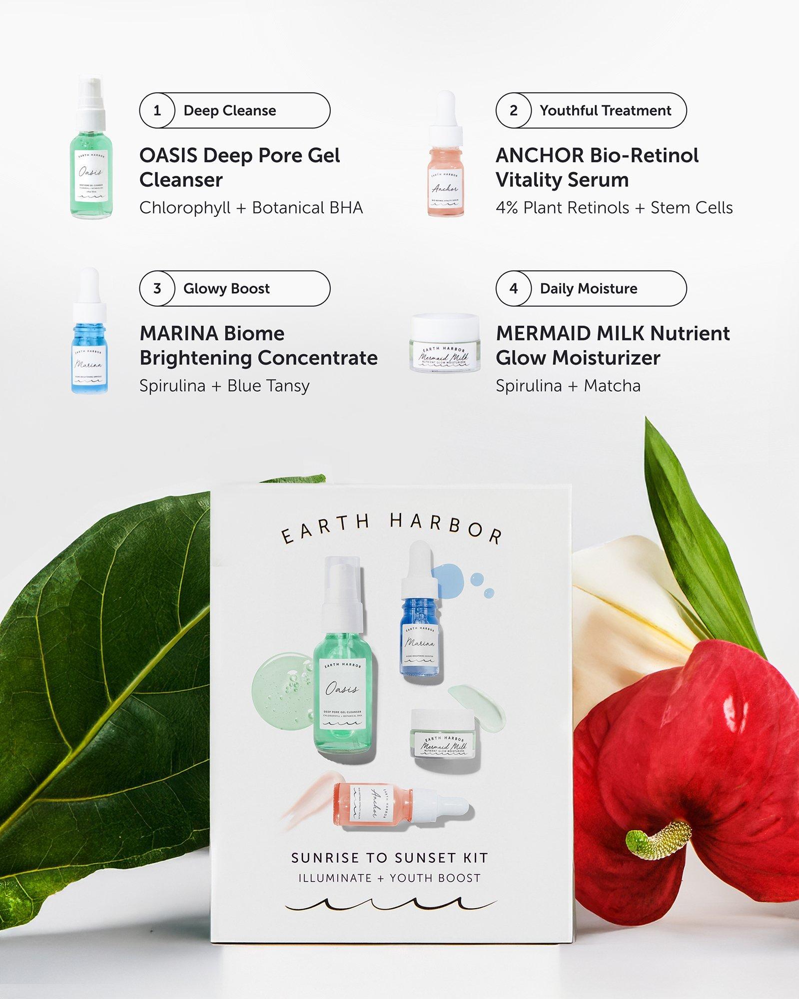 Earth Harbor's Sunrise to Sunset Natural Skincare Kit provides powerful skin revitalization with the youth boosting ritual of Oasis Deep Pore Gel Cleanser, Anchor Bio-Retinol Vitality Serum, Marina Biome Brightening Ampoule, and Mermaid Milk Nutrient Glow Moisturizer.