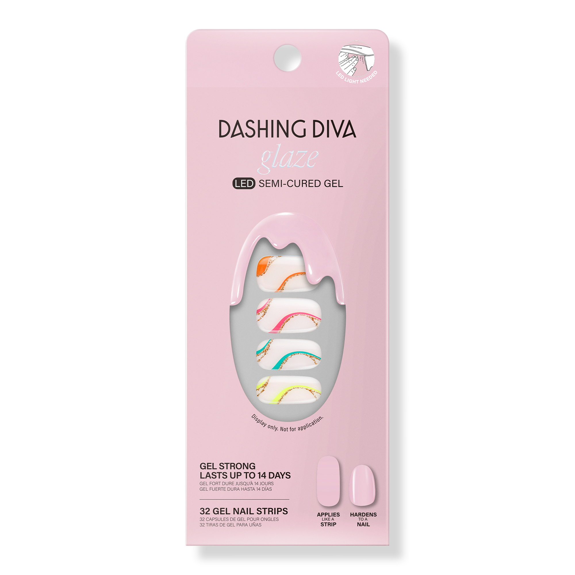 Get the pro-finish and sculpted effect of a salon gel manicure at home with ease with Dashing Diva's Suns Out Swirl GLAZE. GLAZE innovation is a semi-cured gel strip that cures under an LED lamp, delivering salon results: molded shape, mega volume, mirror shine that's gel strong for up to 14 days.
