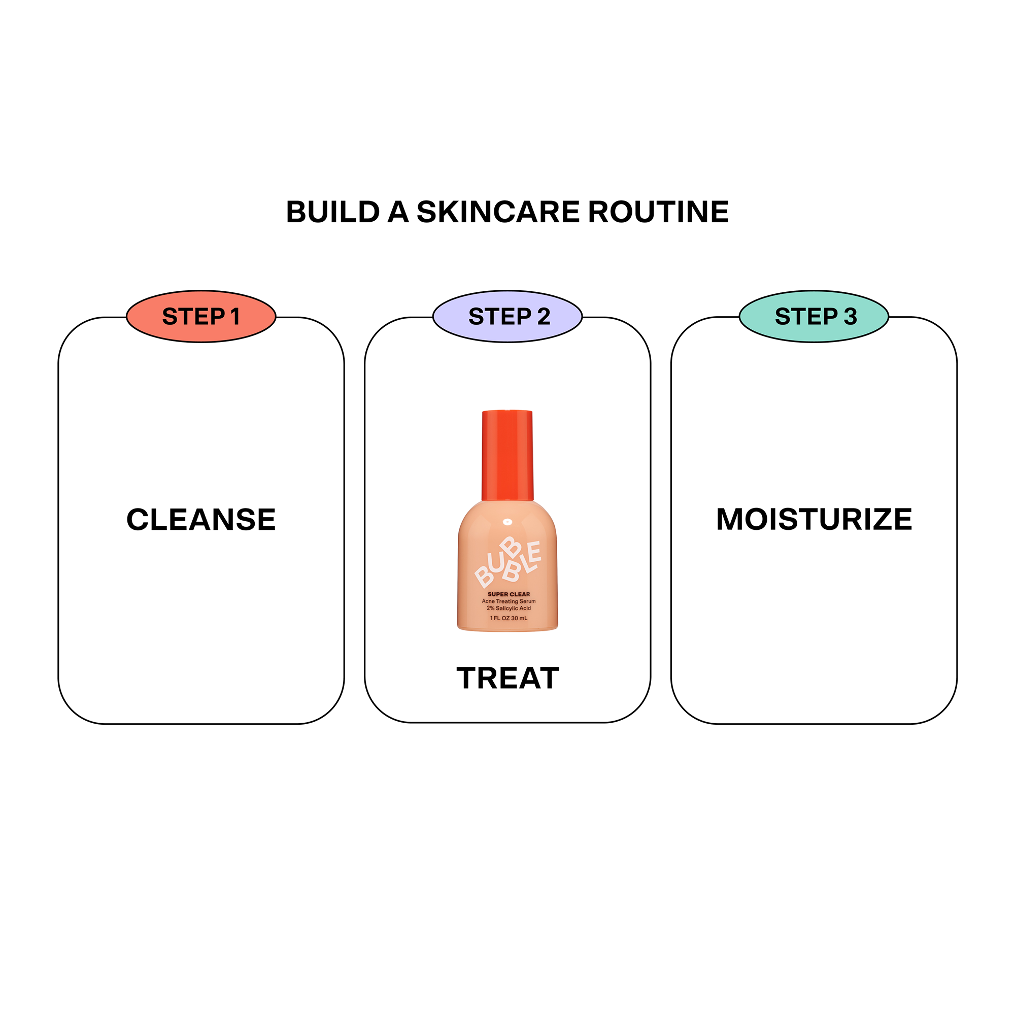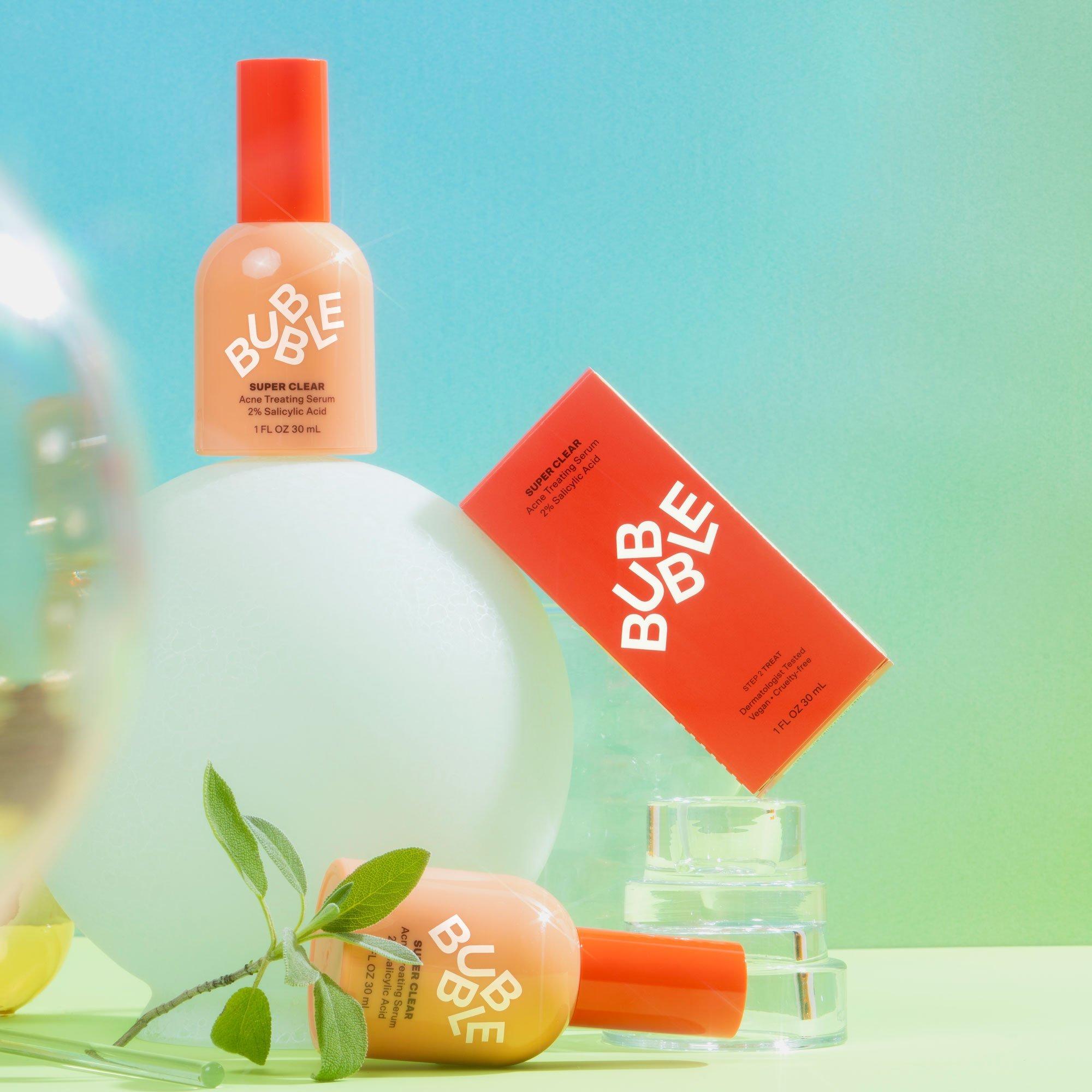 Bubble's Super Clear Acne Treating Serum is a daily acne-treating serum that stops acne before it starts using a powerful combo of 2% Salicylic Acid and willow bark extract to help clear clogged pores and breakouts without causing irritation for visibly clearer, calmer, less congested skin.
