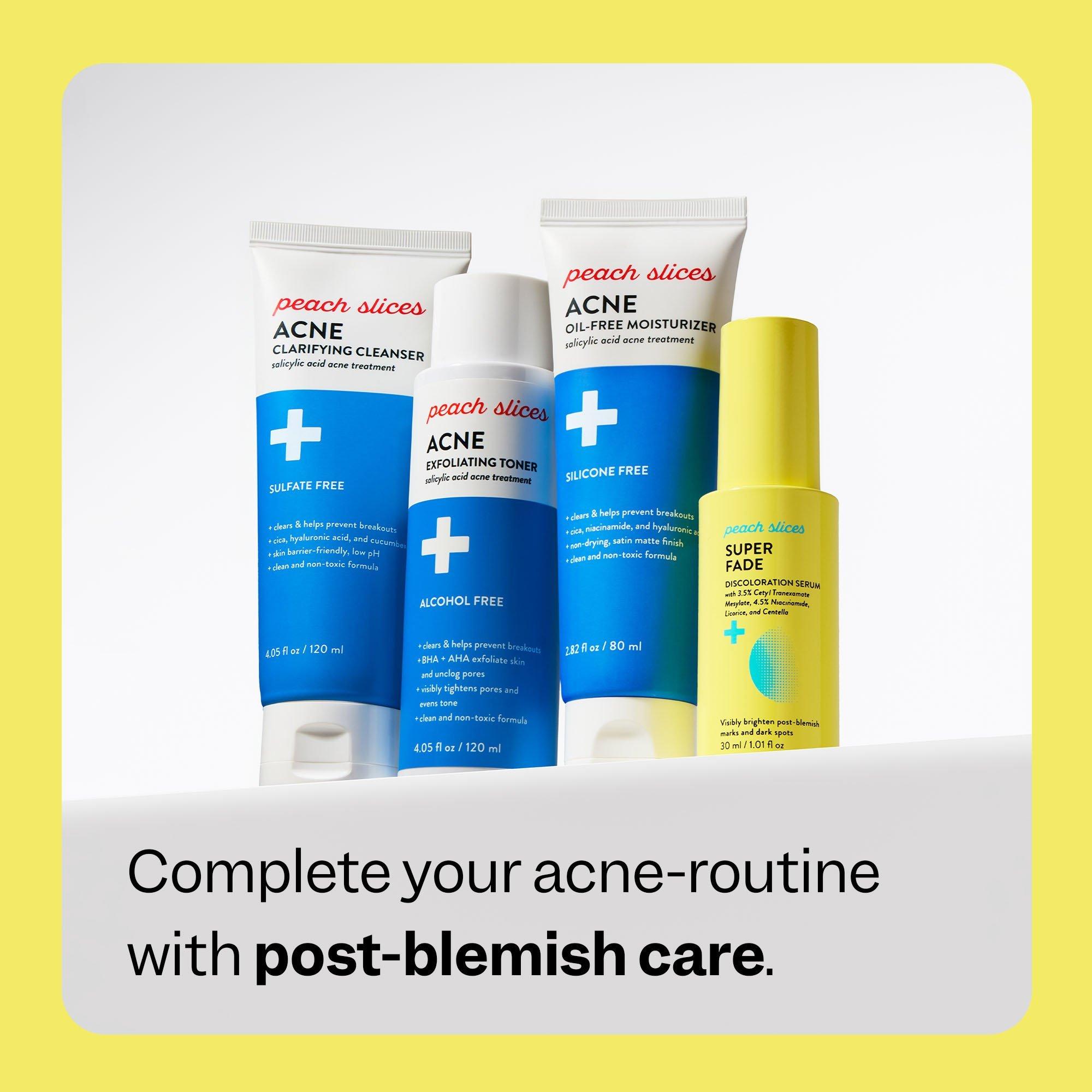 Peach Slices Super Fade Discoloration Serum visibly brightens dark spots and evens skin tone—fast. A potent blend of 3.5% tranexamic acid, 4.5% niacinamide, and licorice visibly improves post-blemish marks and hyperpigmentation. Soothing centella, allantoin, and panthenol visibly calm skin.