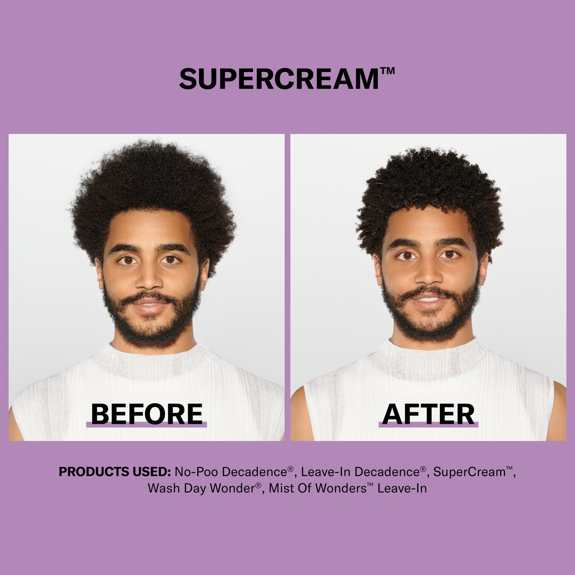 Meet DevaCurl's superhero styler, SUPERCREAM Infused Definer Hydra-Definition Blend Multitasking Styler. This multitasking, ultra-rich cream with a hydra-definition blend provides coarse curls with smoothness, shape, shine and frizz control.