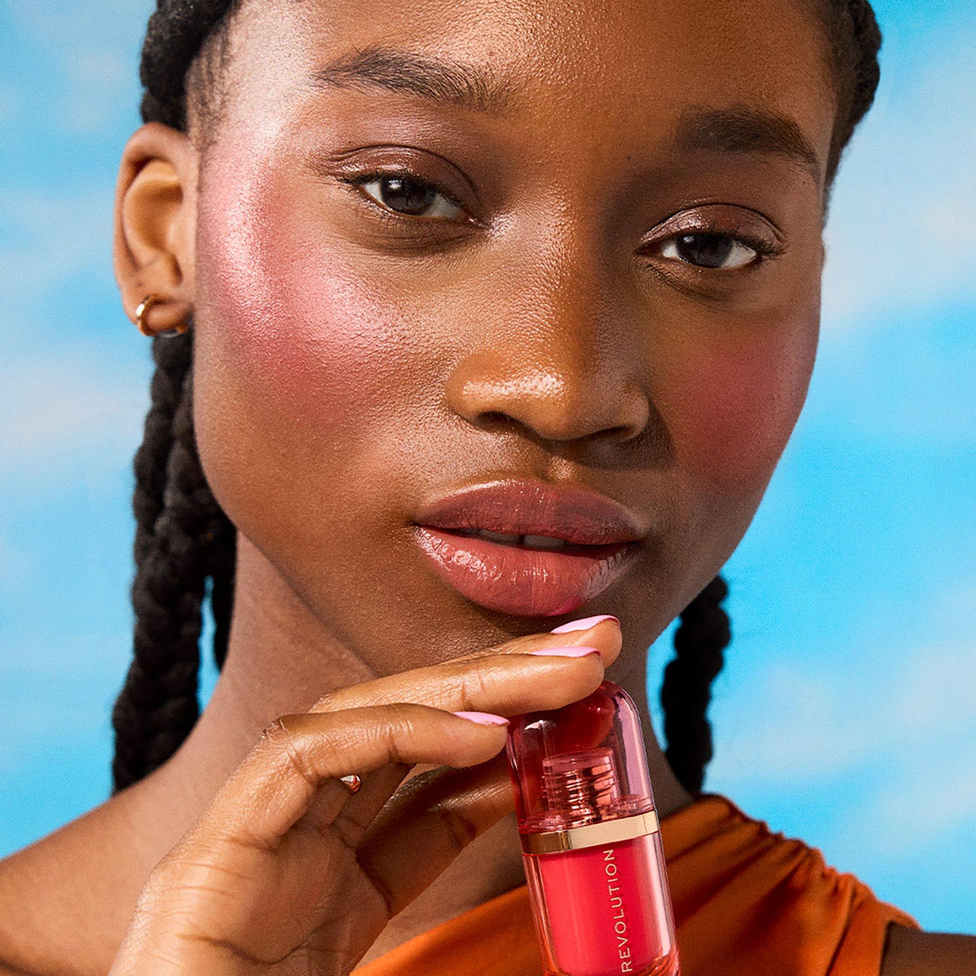 Grab, dab & go with Revolution Beauty Super Dewy Blush Burst, a bitesize burst of juicy color. The hybrid skin-loving serum formula is bursting with peptides and hyaluronic acid for a hydrated, plumped cheek effect.