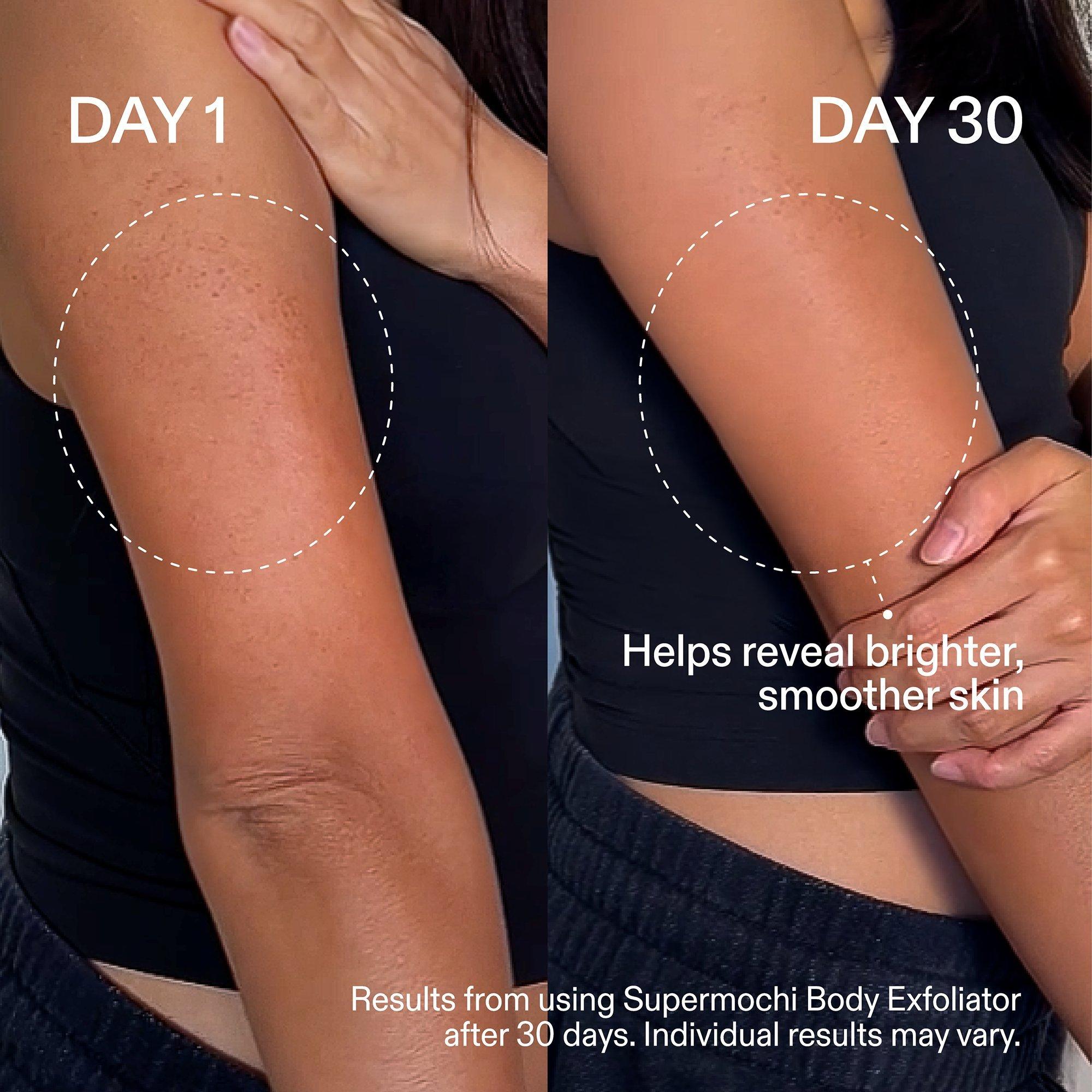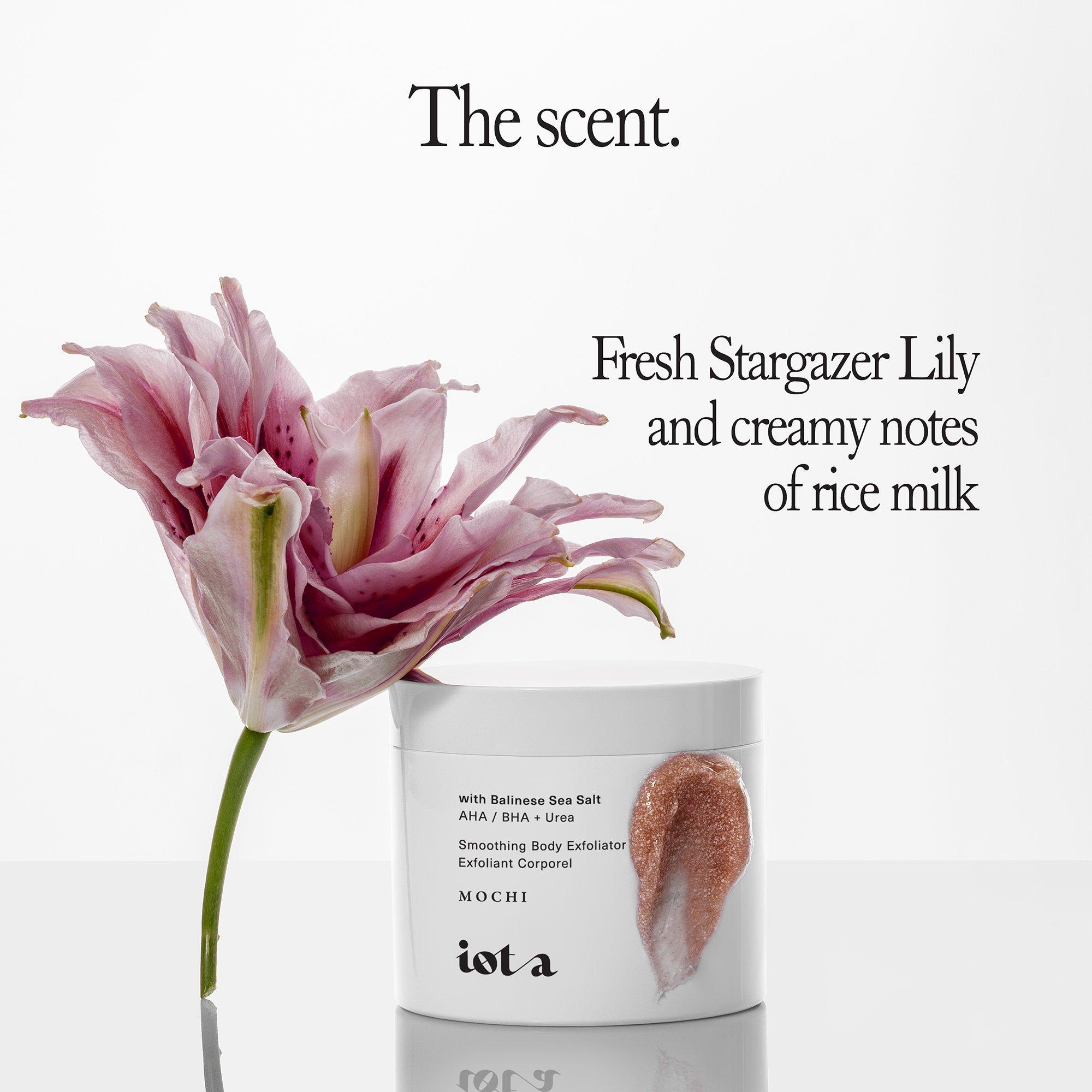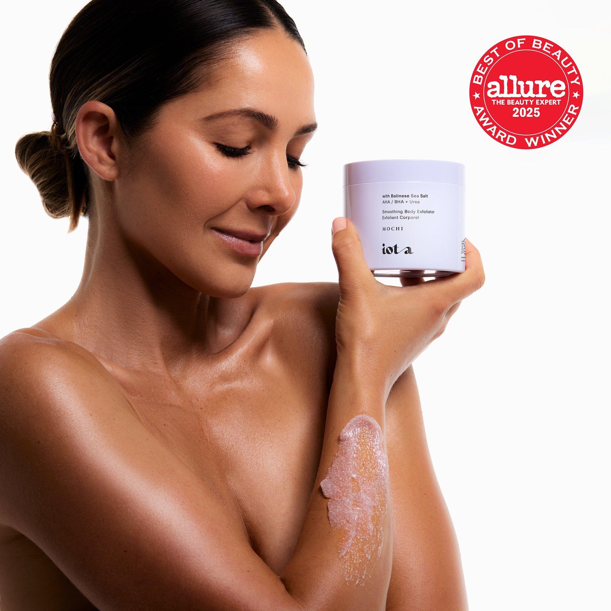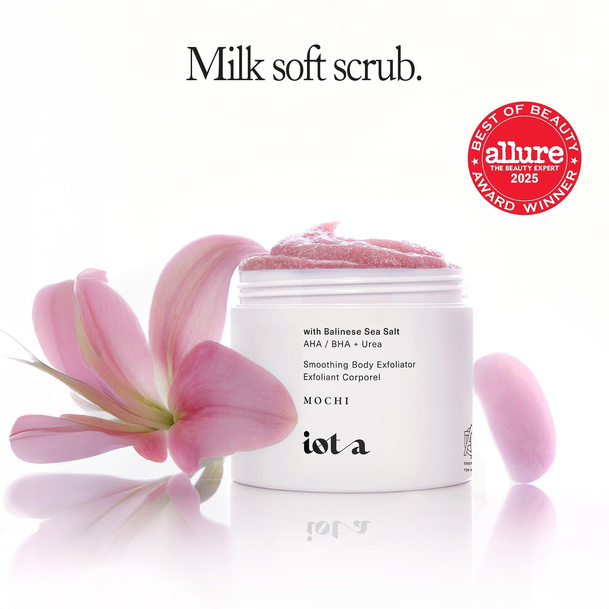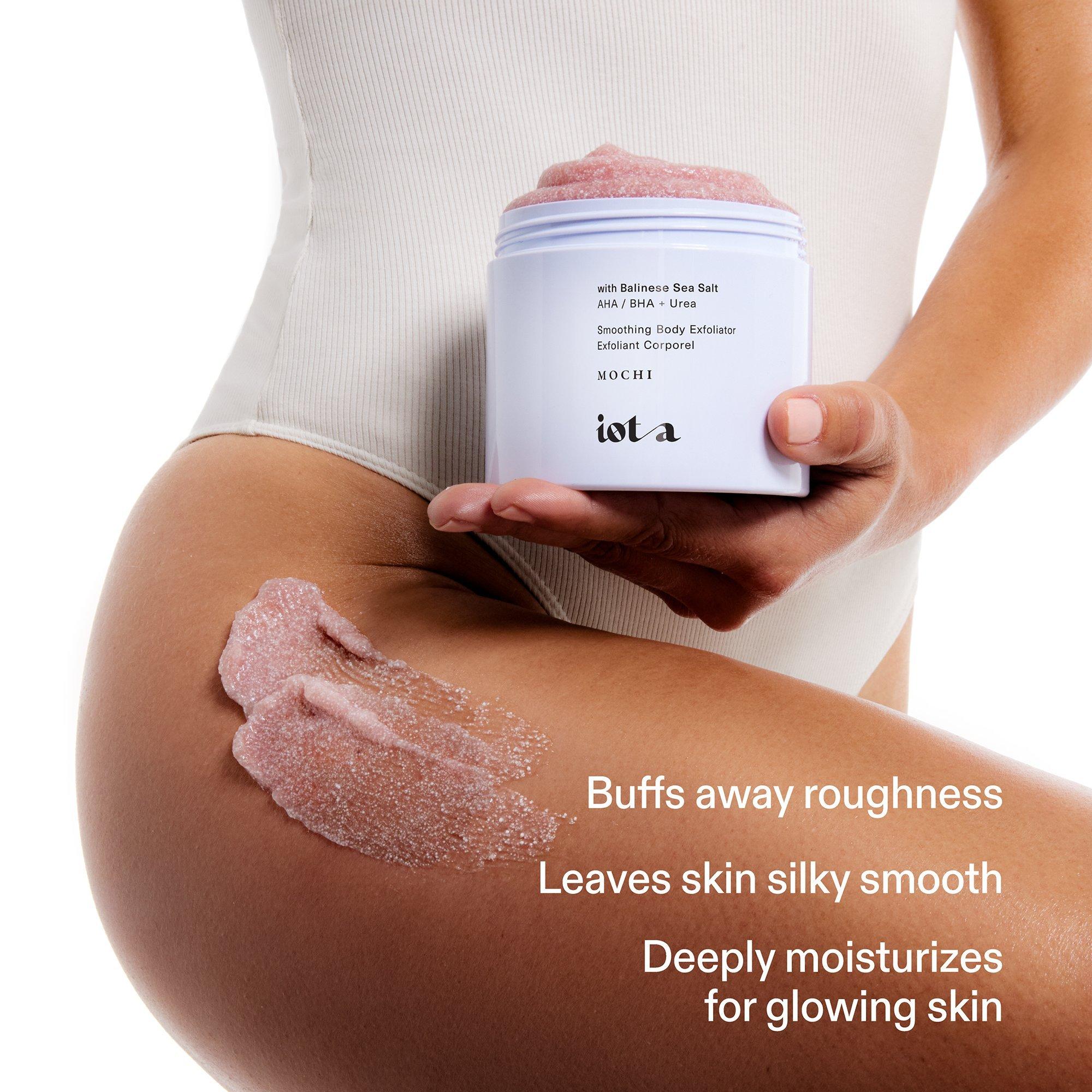 iota's Supermochi Smoothing Body Exfoliator is a gentle, AHA-boosted scrub that buffs away roughness to reveal incredibly brighter, smoother skin.