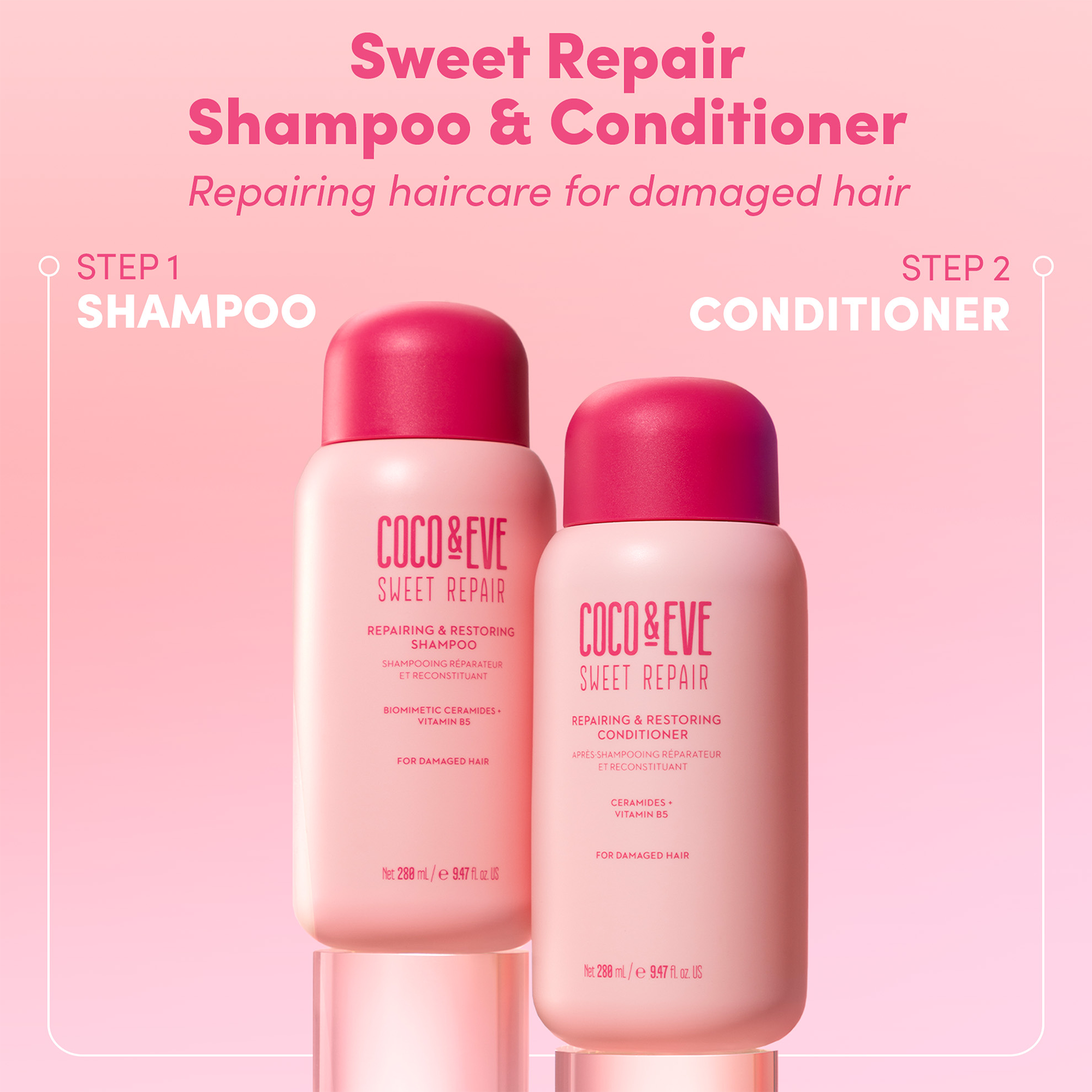 Coco & Eve Sweet Repair Repairing & Restoring Shampoo cleanses, strengthens and rejuvenates damaged hair. Formulated with Vitamin B5 and Biomimetic Ceramides, hair is nourished, hair cuticle is protected for reduced hair damage and fewer split ends.