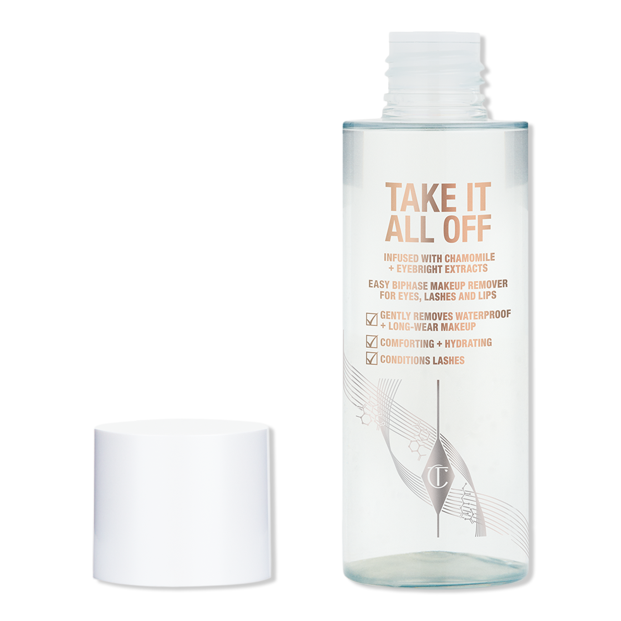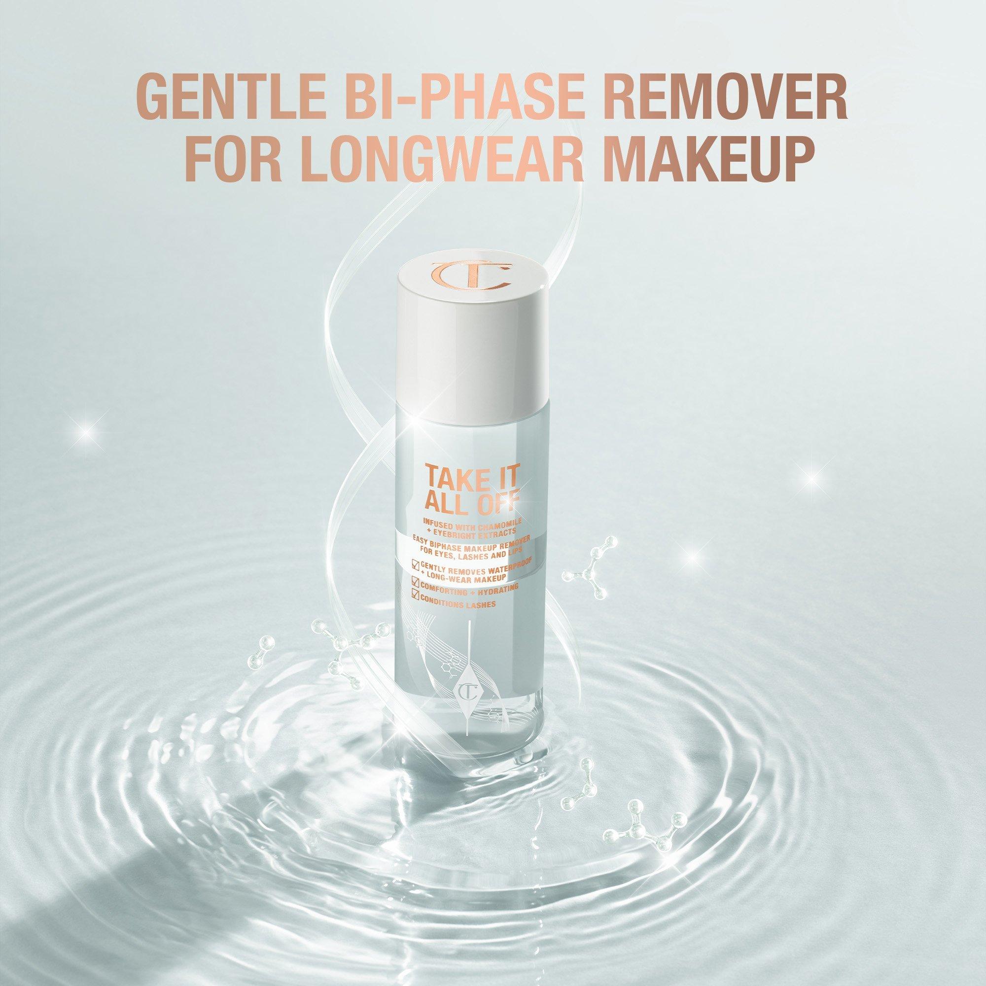 Charlotte Tilbury's Take It All Off Longwear Makeup Remover is a gentle, bi-phase formula for eyes, lashes, and lips that effortlessly removes long-wear and waterproof makeup.