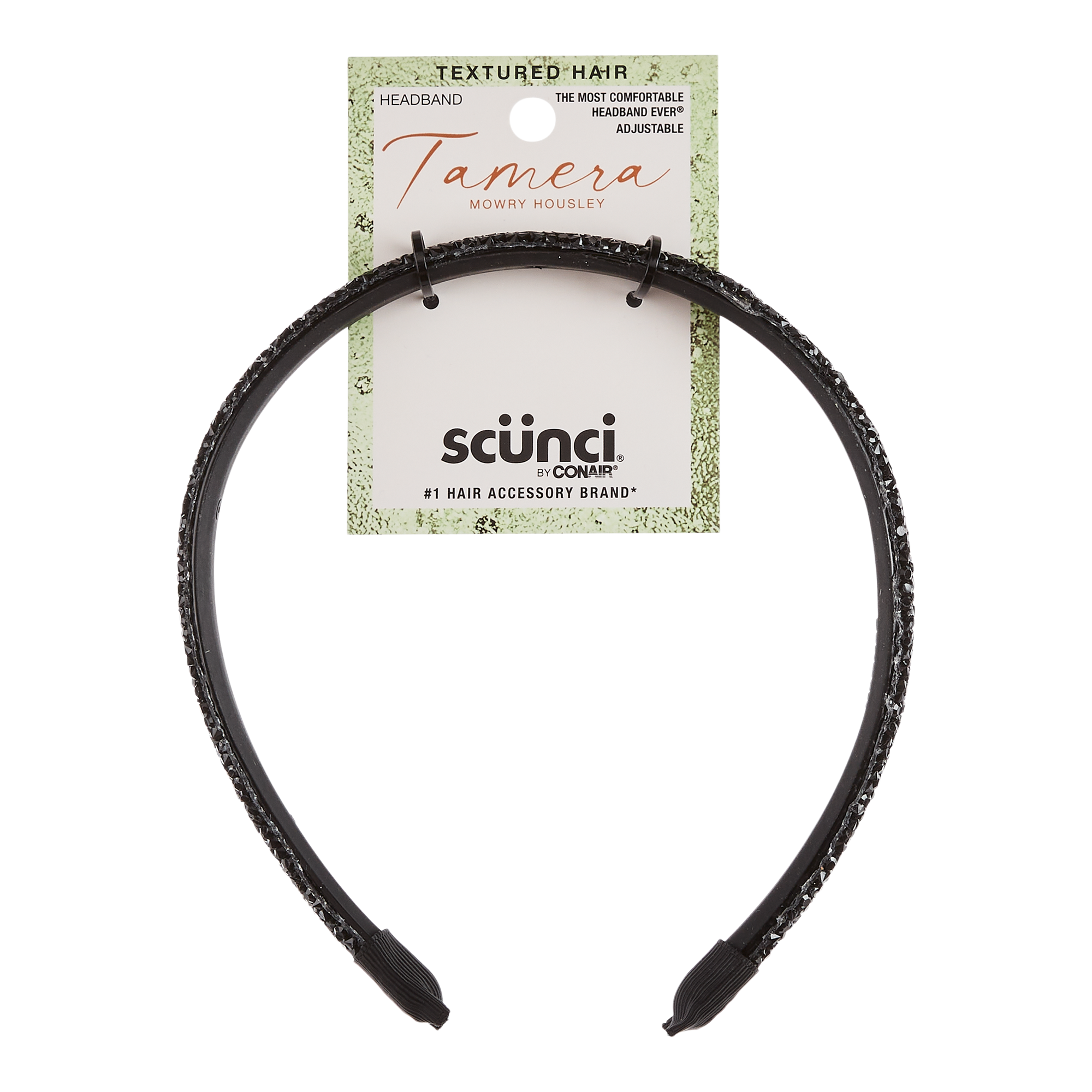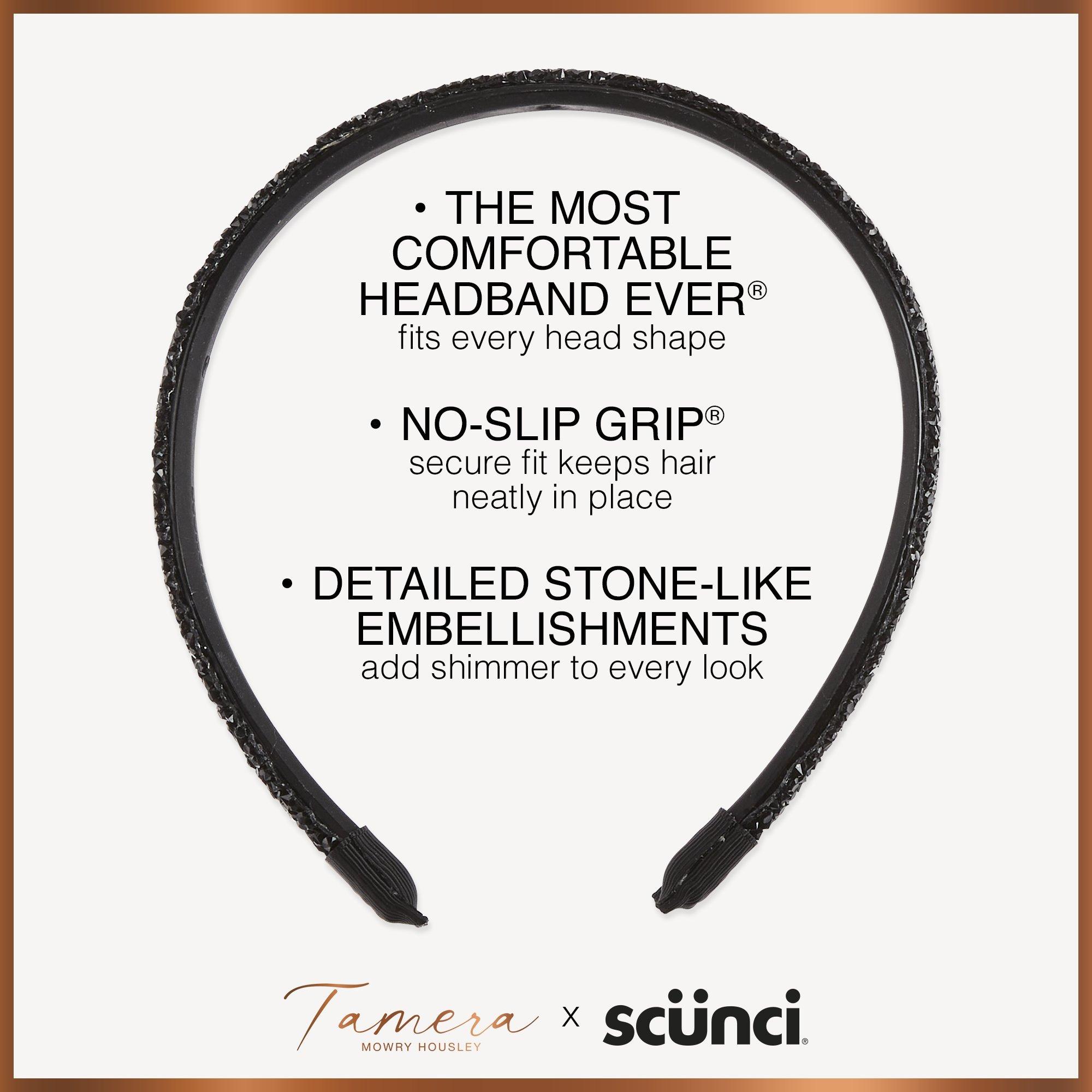 Meet your new go-to hair accessory: The Most Comfortable Headband Ever from Tamera Mowry Housley x scünci. This black beauty with shimmering stone embellishments bends to fit any head shape, ensuring a secure, no-slip grip all day long.