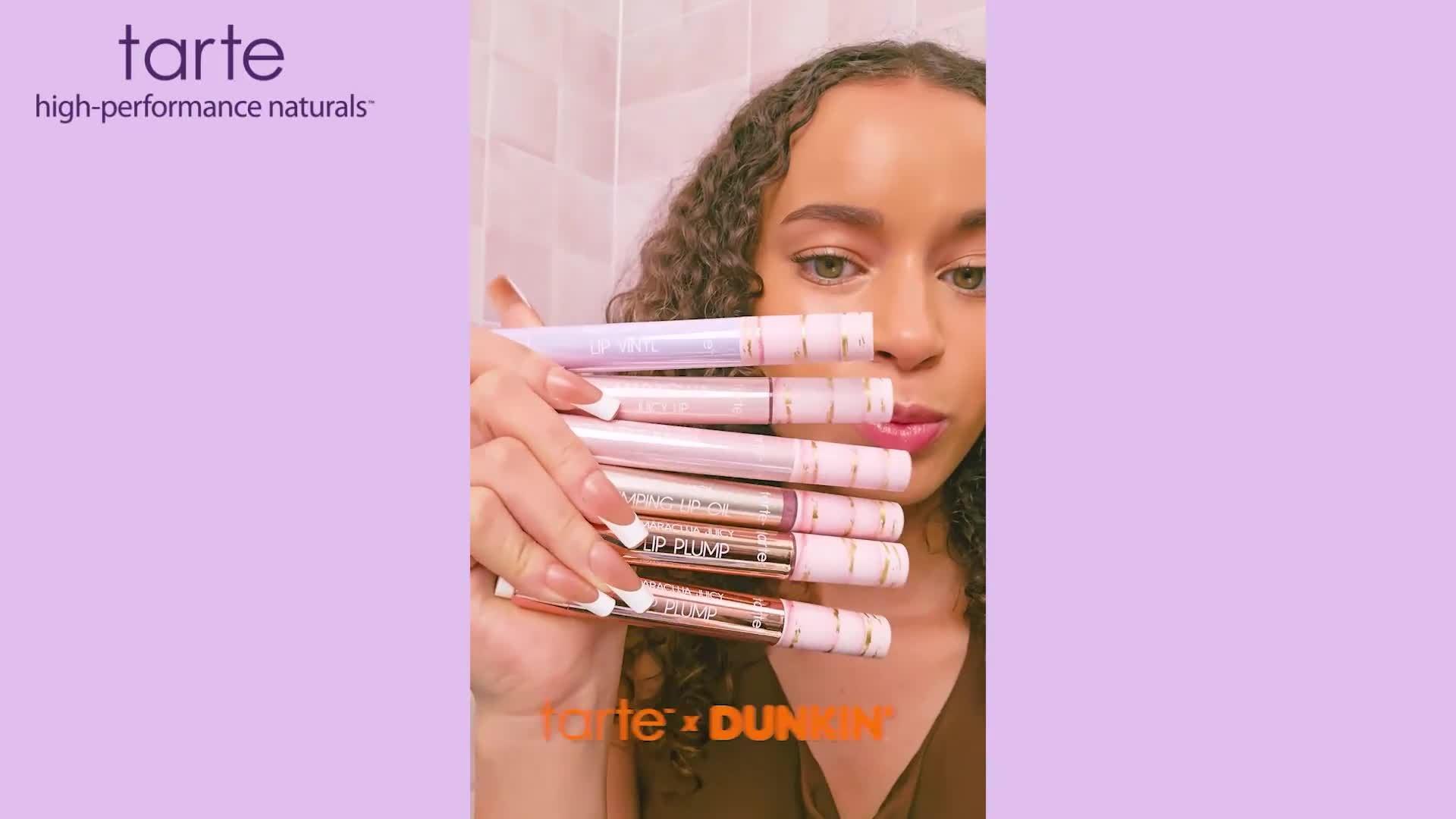 This limited-edition tarte x Dunkin' Vanilla Icing Maracuja Juicy Lip Balm features a delicious vanilla icing scent + mauve shade.
