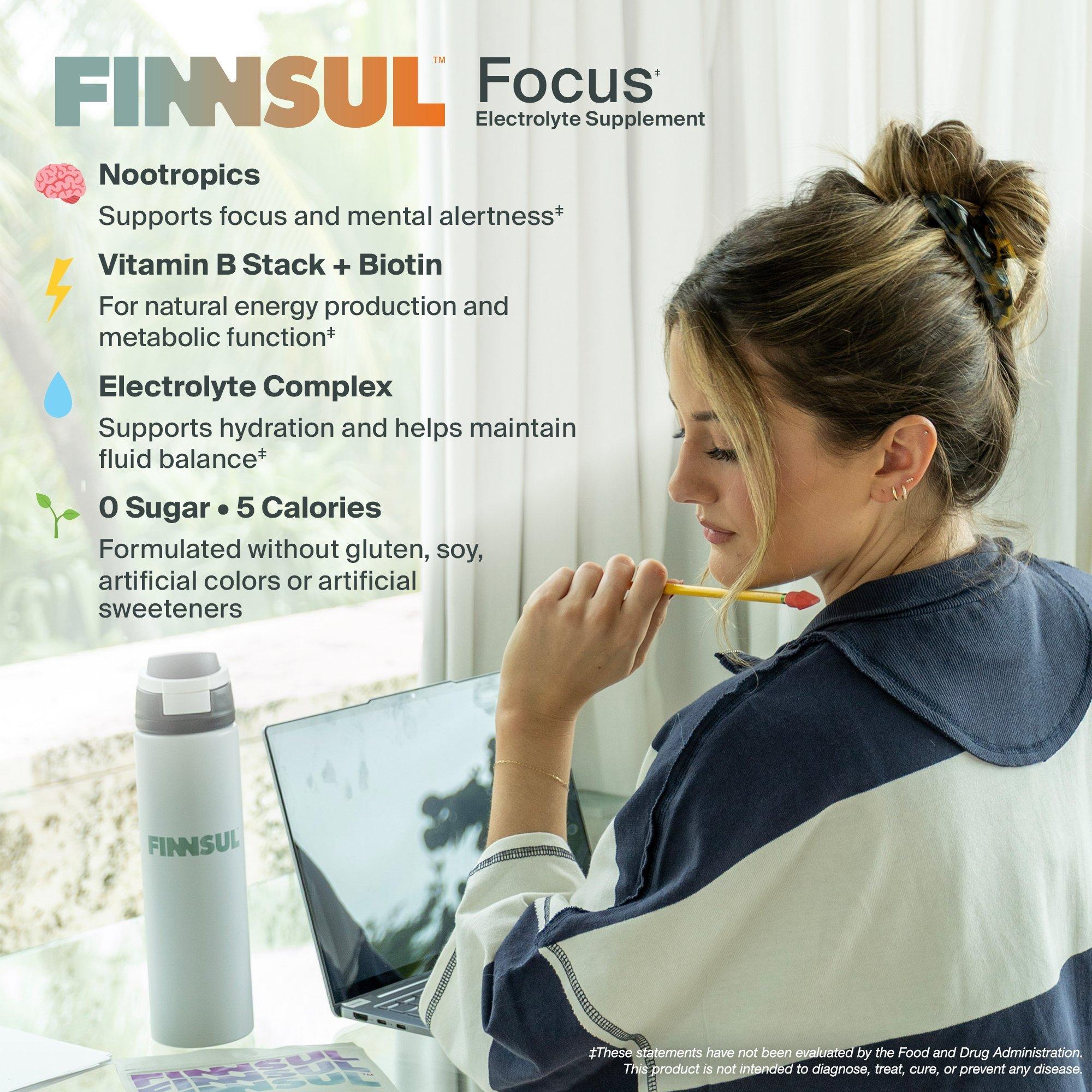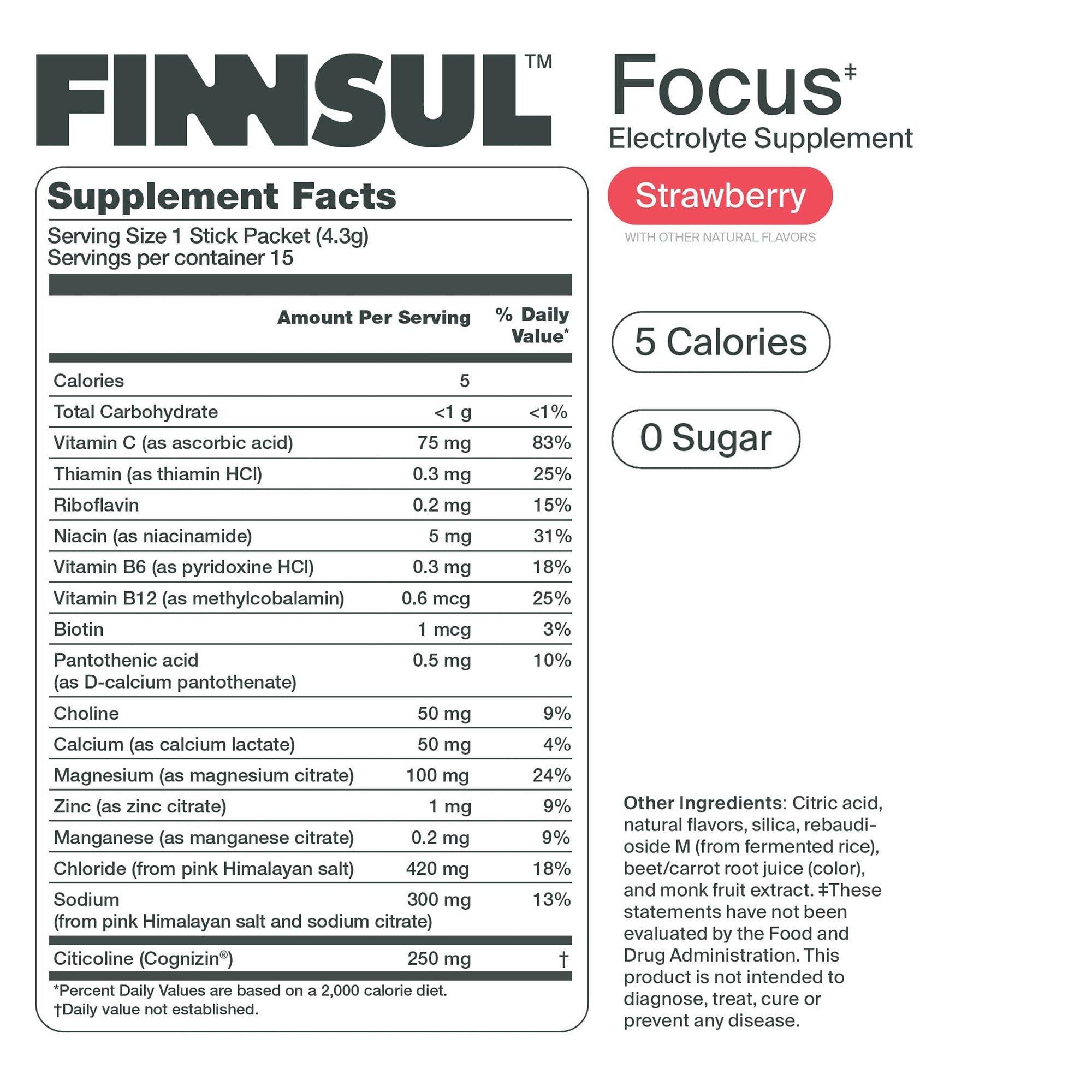 FINNSULTM Focus* Electrolyte Supplement: Add 1 stick packet to 16 Fl. Oz. of water \& mix thoroughly before drinking.
