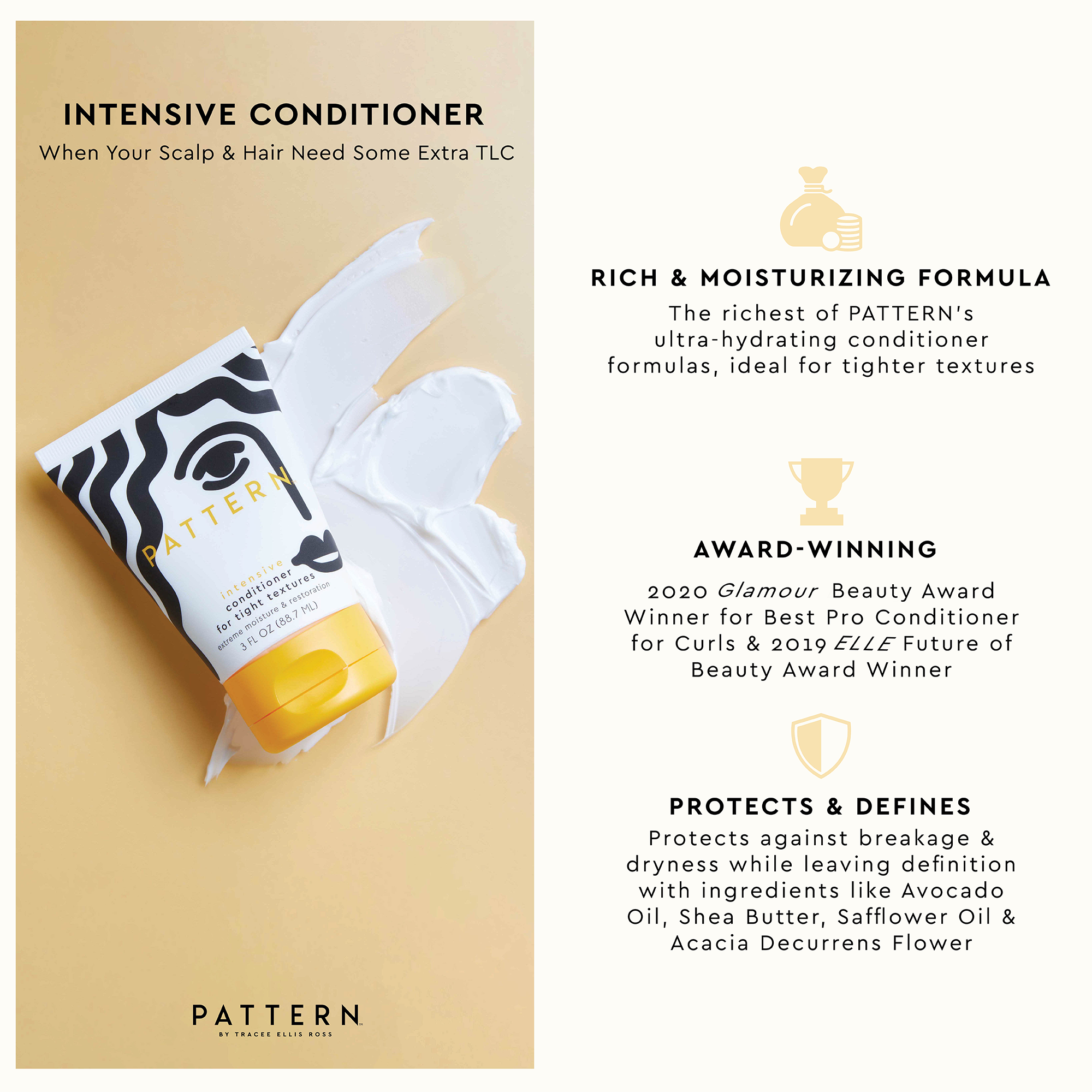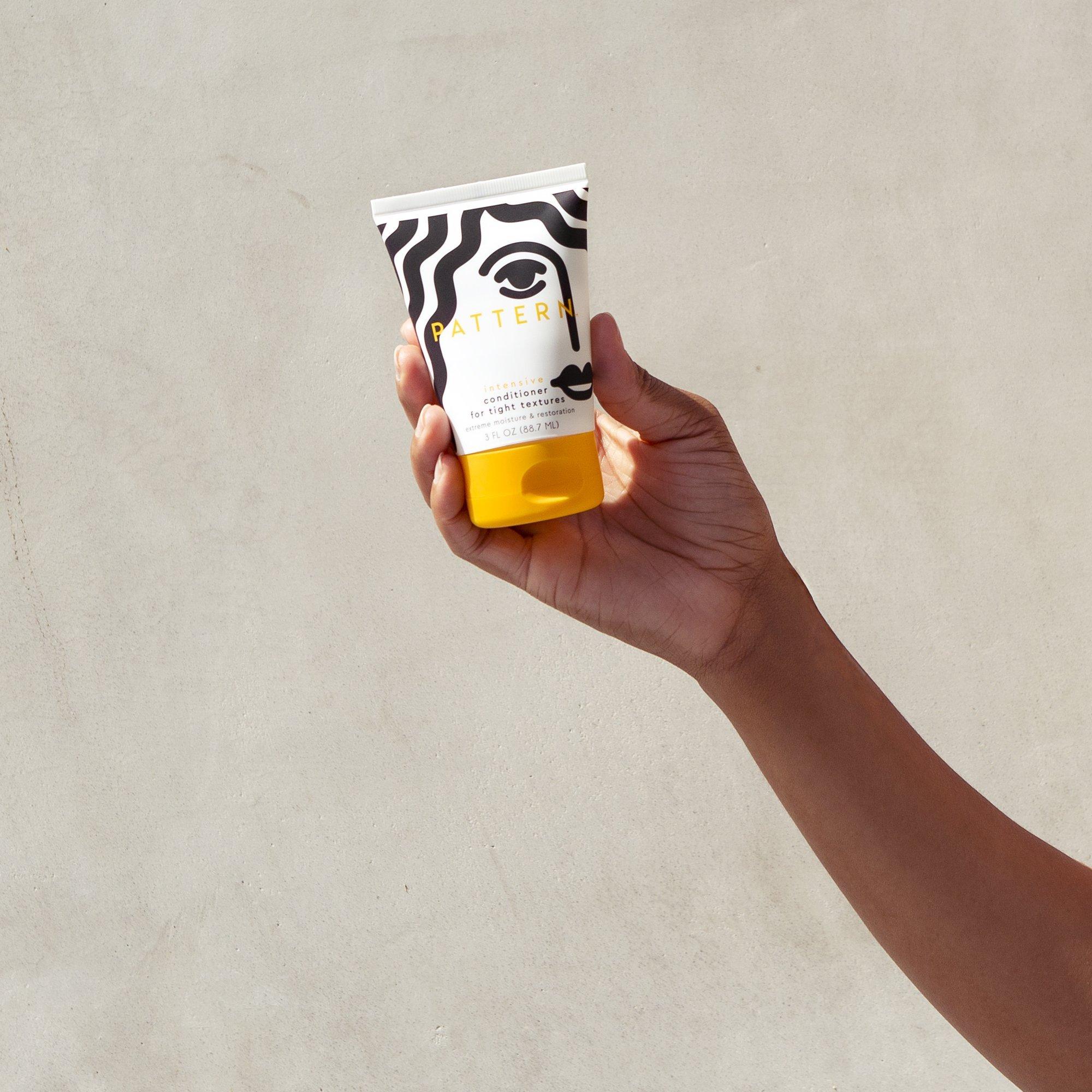 • Intensive Conditioner: Apply to wet hair from roots to ends. For extra dense curls or long hair, section with PATTERN Hair Clip while conditioning to ensure every strand gets the love it deserves. Use PATTERN Shower Brush or fingers to help detangle and bring curls together. Rinse thoroughly.