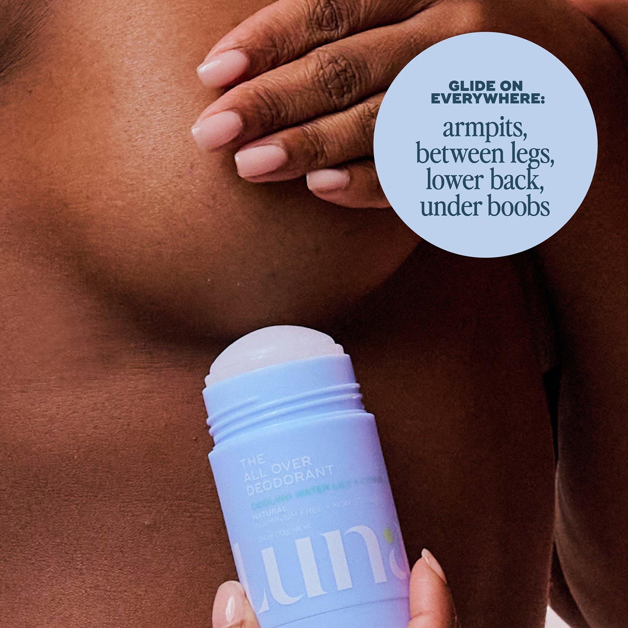 Luna Daily’s The All Over Deodorant is a natural aluminum free + non staining, pH-balanced body deodorant stick. Glides smoothly onto skin for all day odor protection.