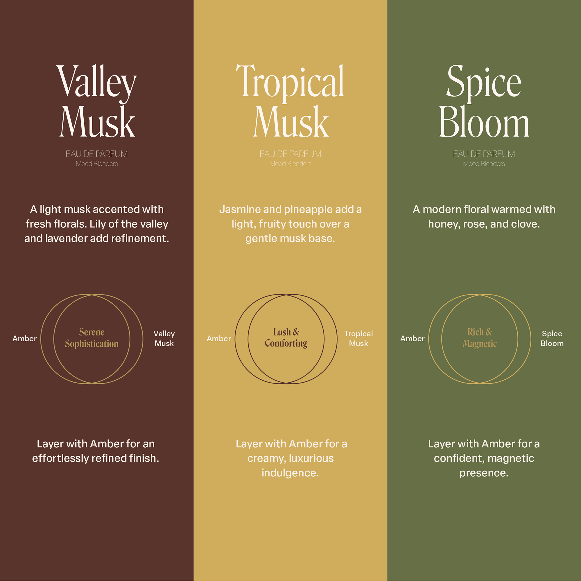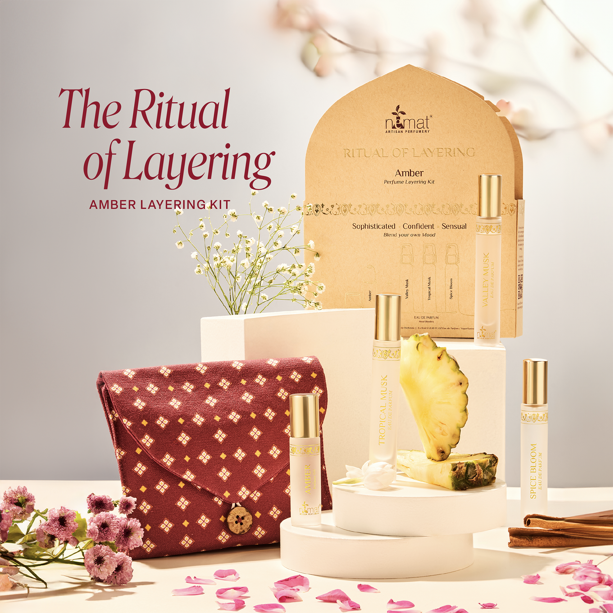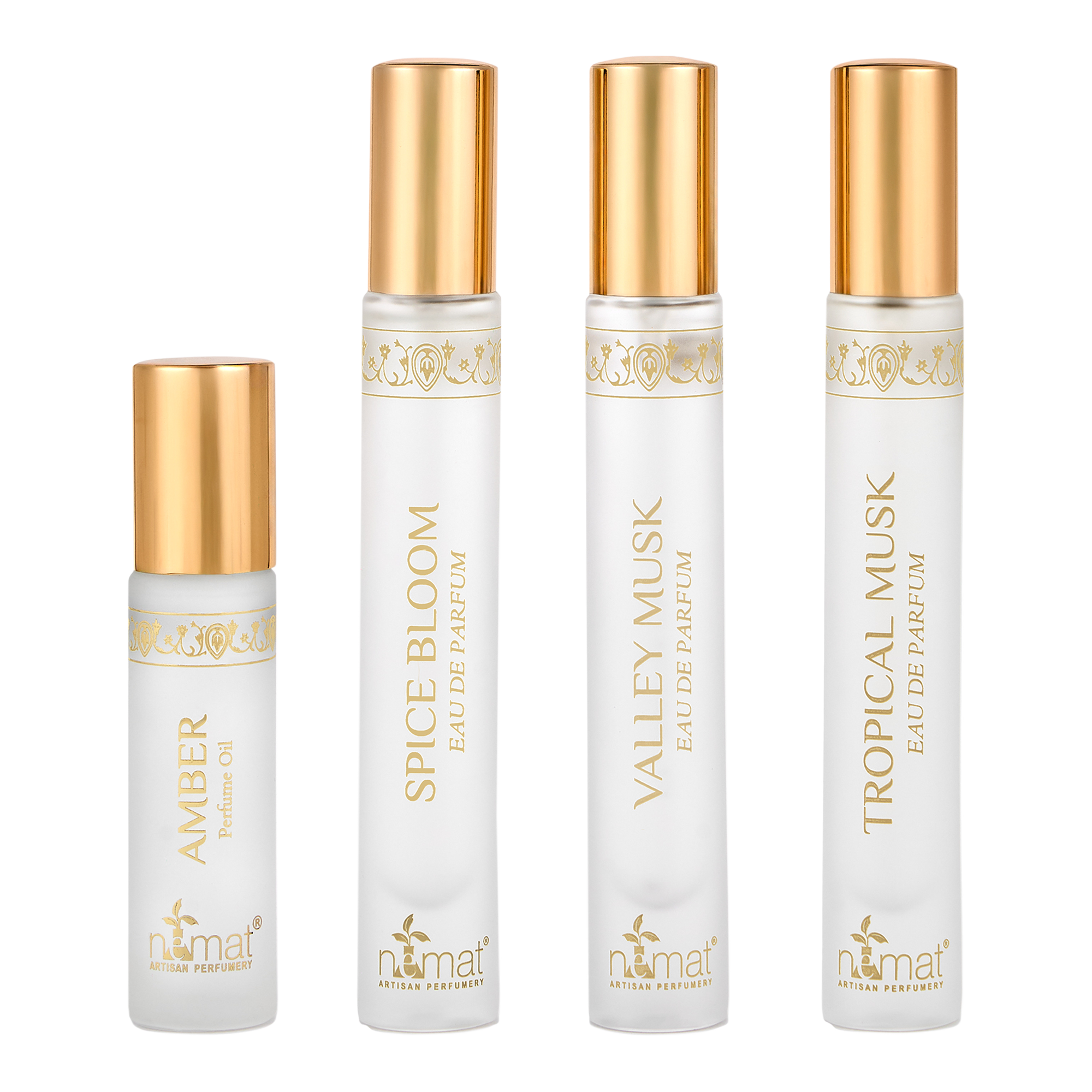 Nemat’s Amber Perfume Layering Kit starts with the Amber Perfume Oil, a musky skin-scent base layer. Layer with the EDP mood blenders - Valley Musk, Tropical Musk, and Spice Bloom for scents that shift from soft and elegant to bold, confident, and sensual.