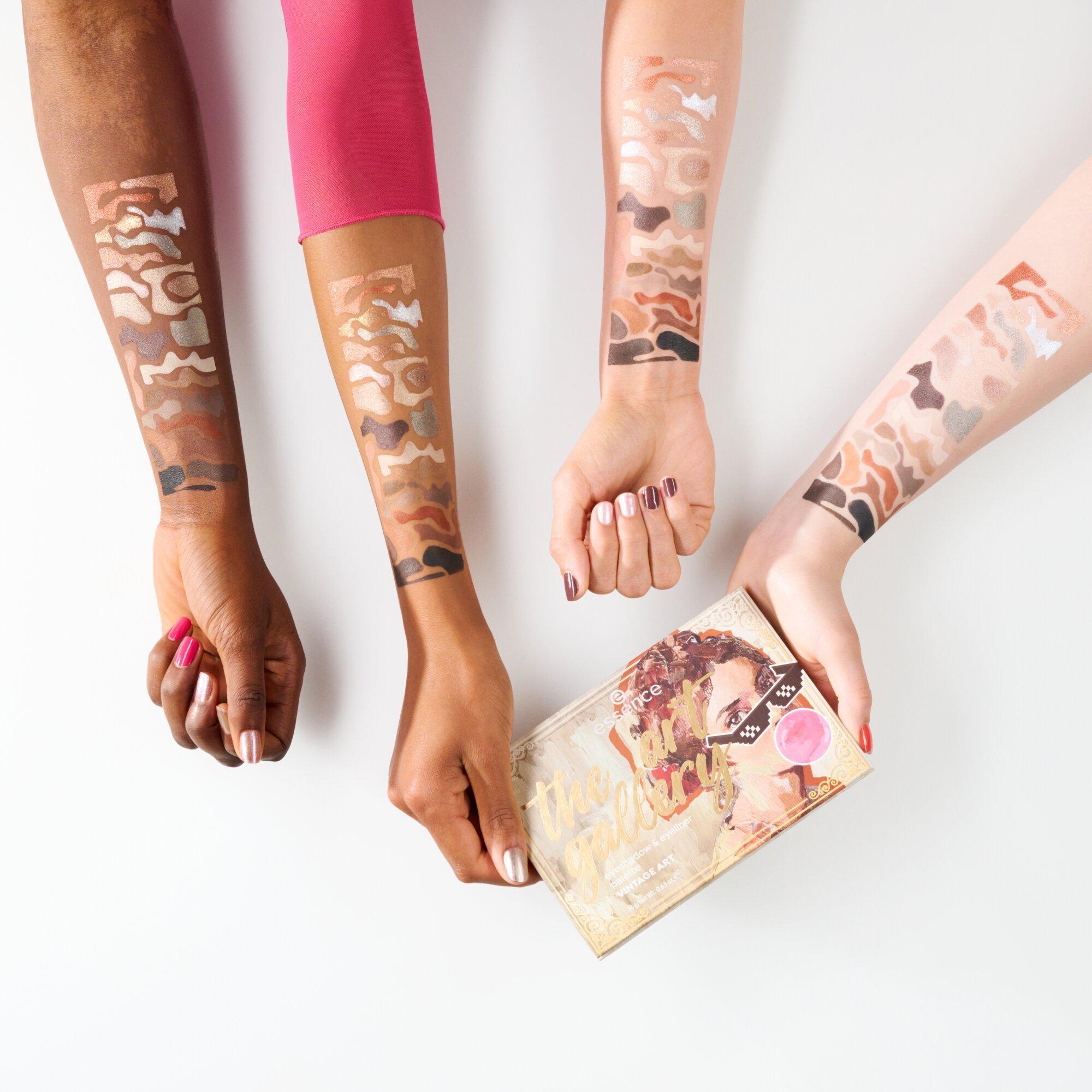 Essence The Art Gallery Vintage Art Eyeshadow & Eyeliner Palette features 22 unique eyeshadow shades & 2 water-activated cake eyeliners. The shades range from warm to cool tones, with a mix of matte, shimmery & metallic textures making it easy to create any look!
