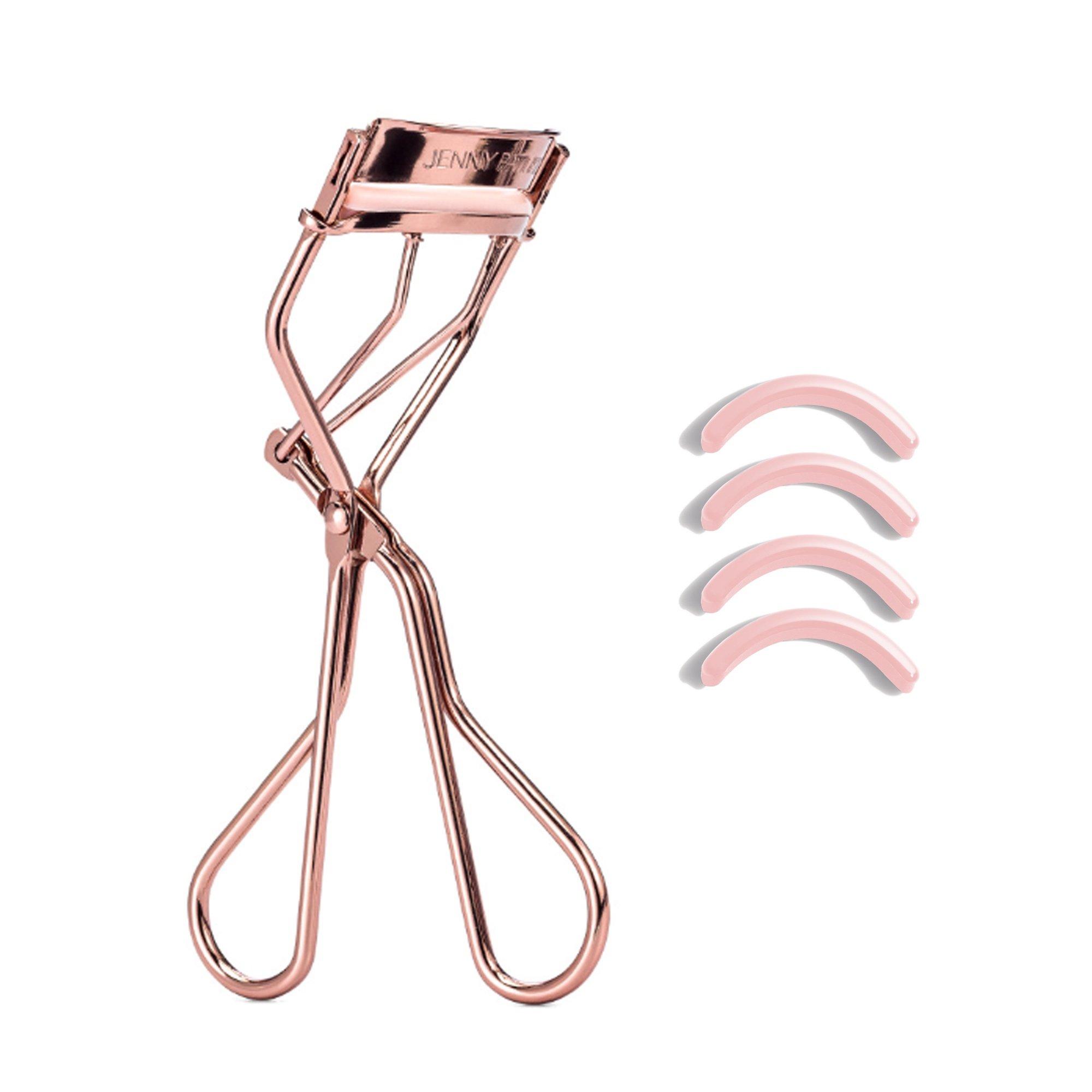 A custom eyelash curler designed for hooded and deep-set eyes, with a flatter curve and upright angle to limit pinching and lift lashes into an open, elongated swoosh. Finished in dark rose gold with a pink pad. Includes four extra silicone pads.