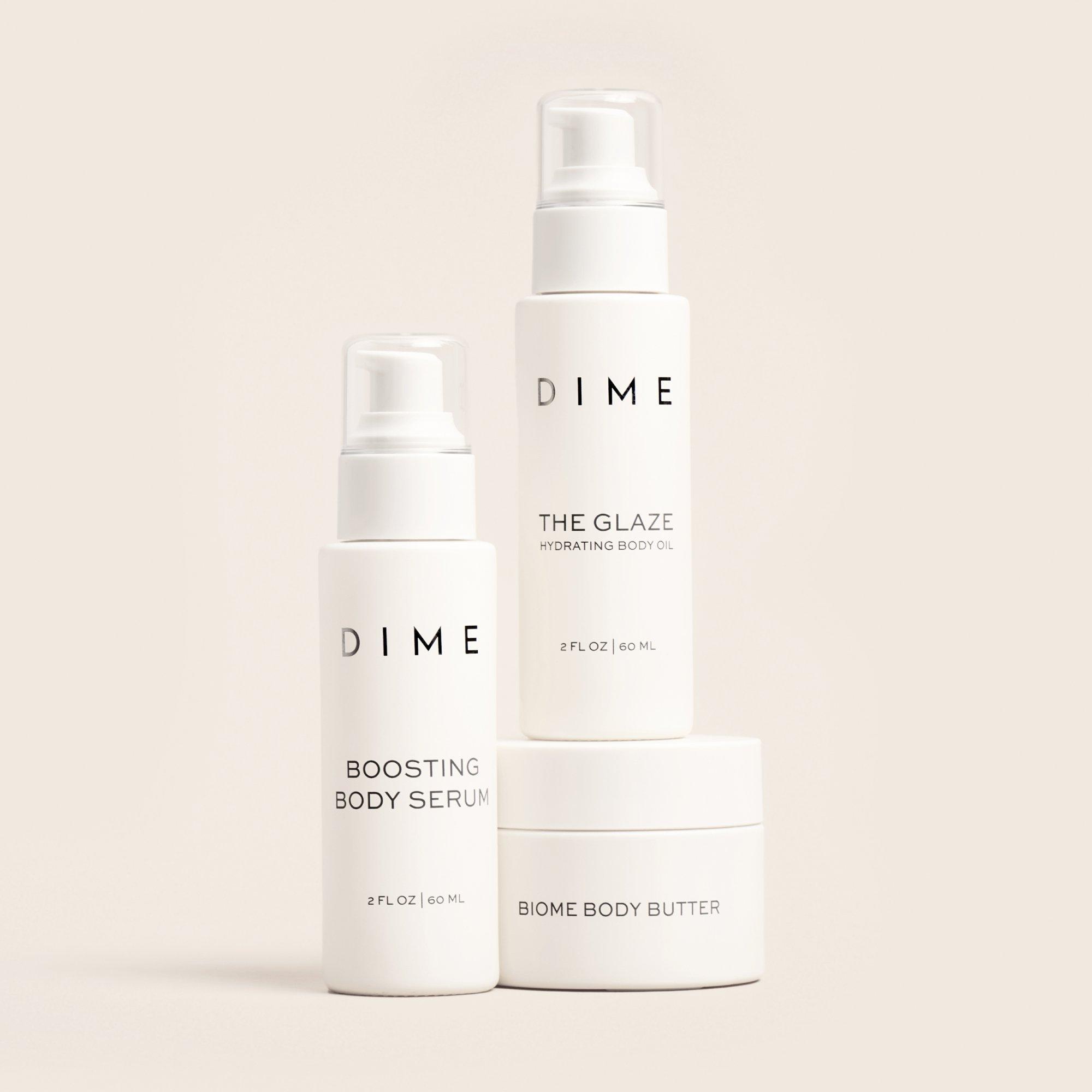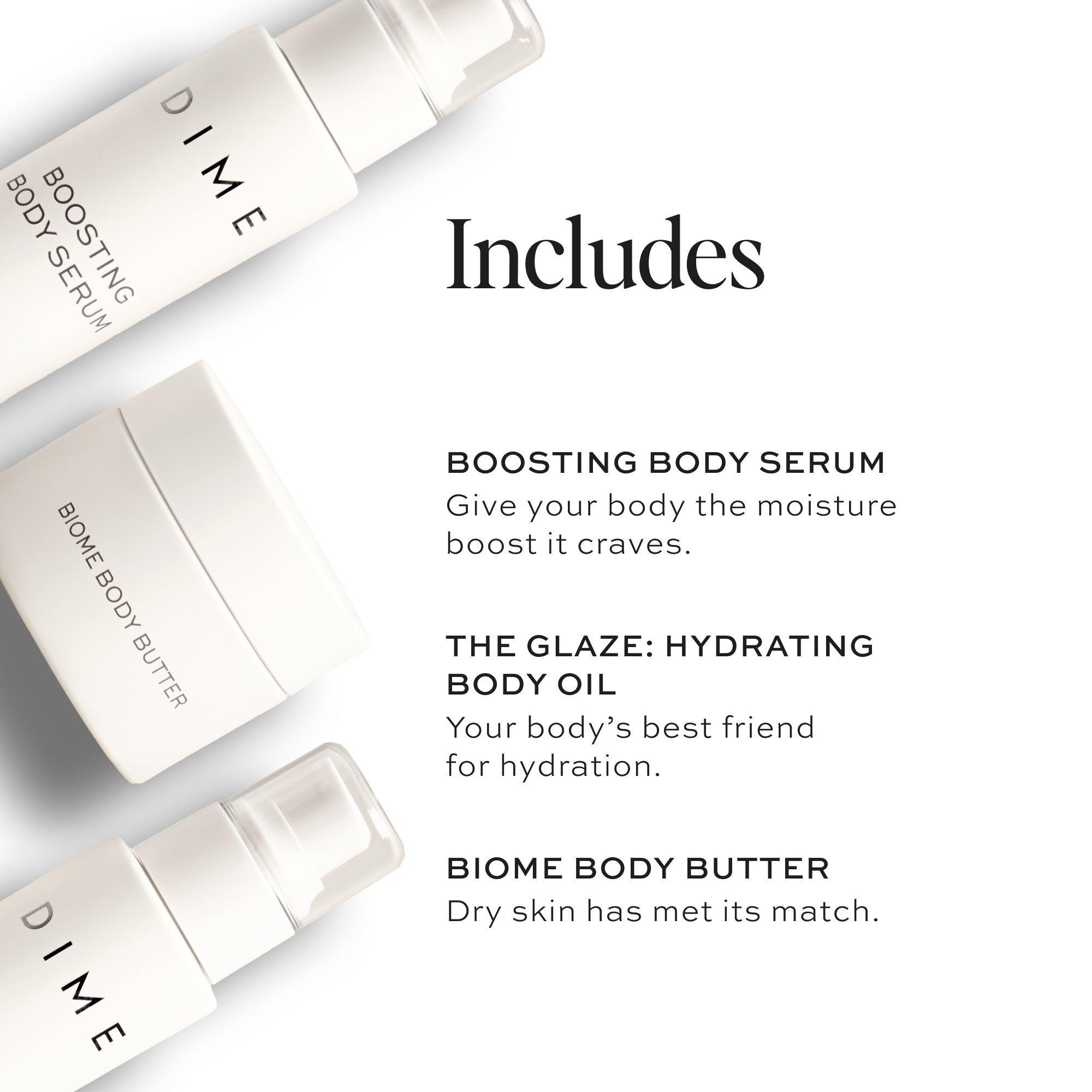 The perfect body care set for every[body]. Conveniently packaged in travel-size minis, it features DIME’s Boosting Body Serum, The Glaze: Hydrating Body Oil, and Biome Body Butter. This luxurious trio helps deliver deep moisture and nutrients for smooth, hydrated skin.