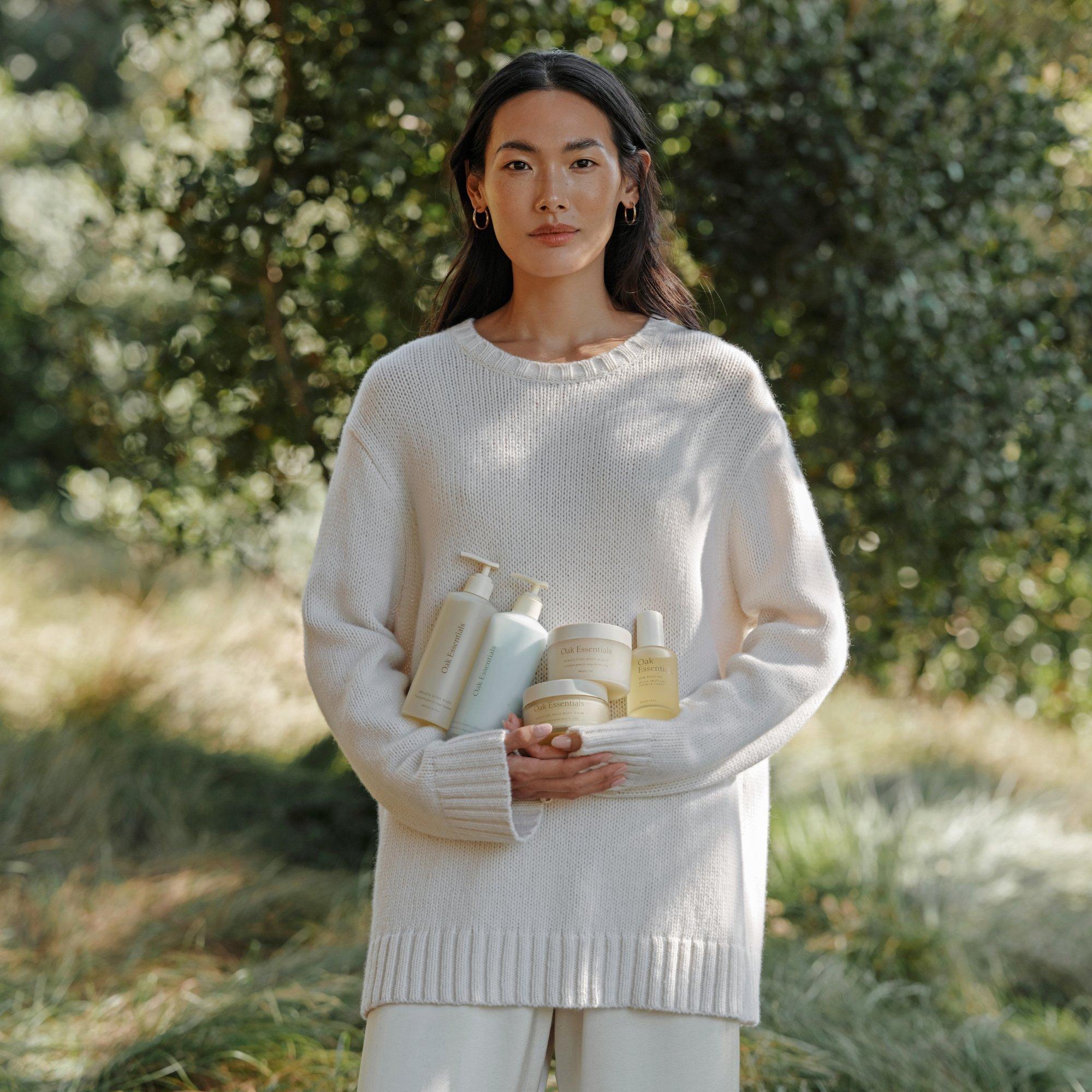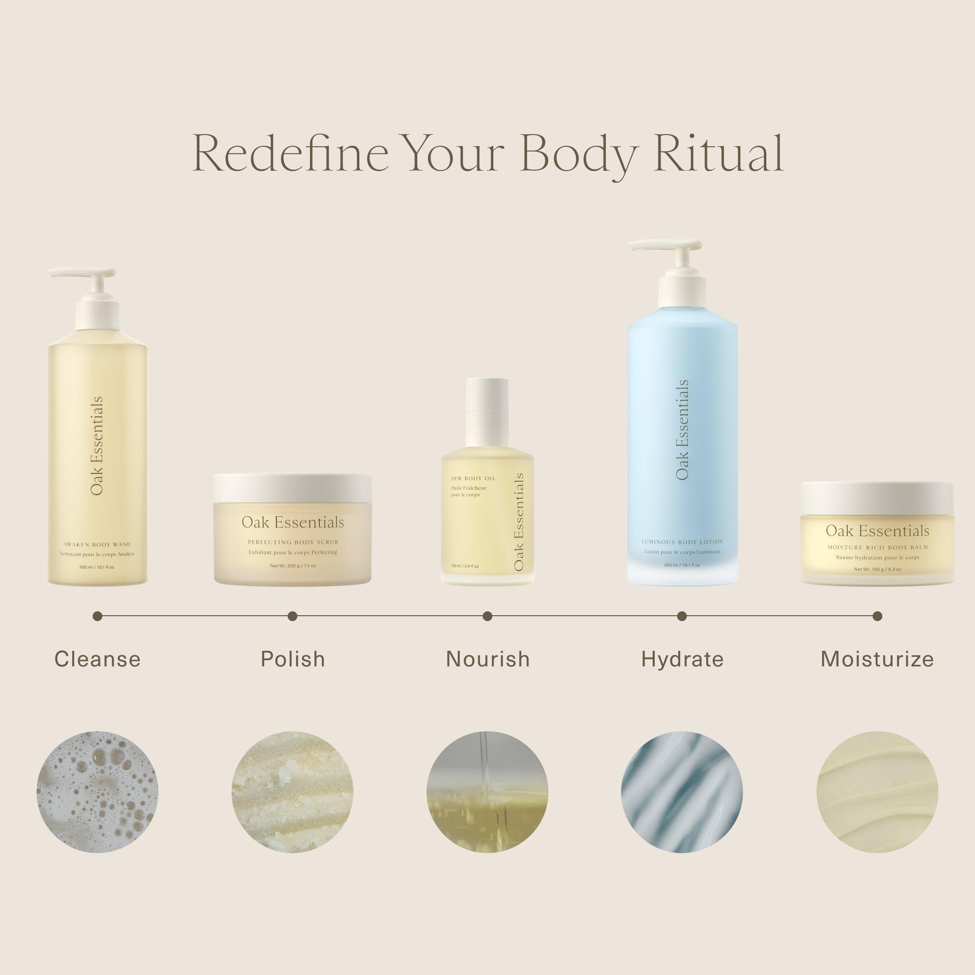 Oak Essentials The Body Routine is an at-home spa experience with five luxurious body care essentials—formulated to deliver skincare-worthy results that smooth and drench skin in hydration from the décolleté down.