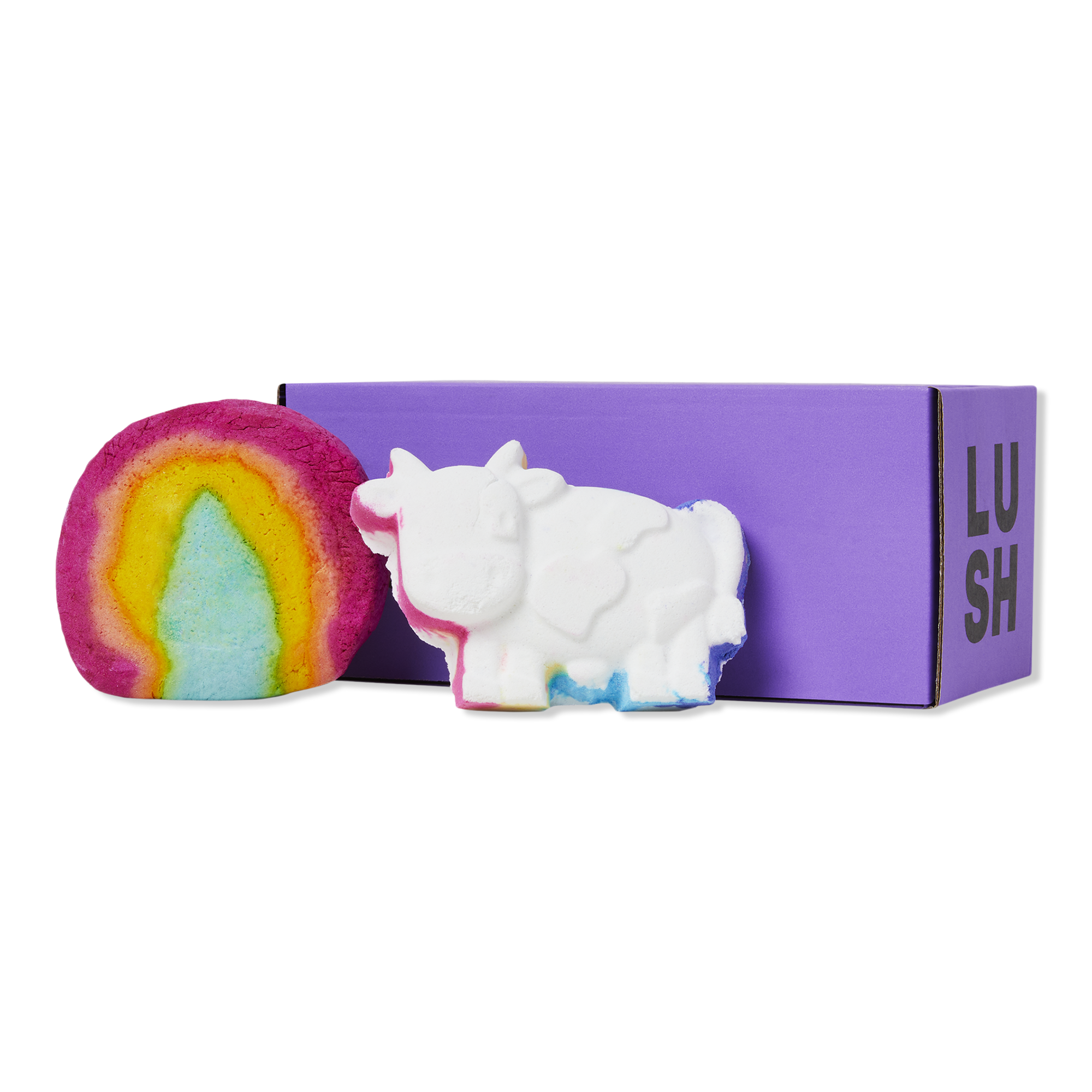 Two joyfully colorful baths await with waves of rainbow fizz and bubbles galore, can be found in Lush's The Cow Jumped Over The Rainbow Bathing Duo.