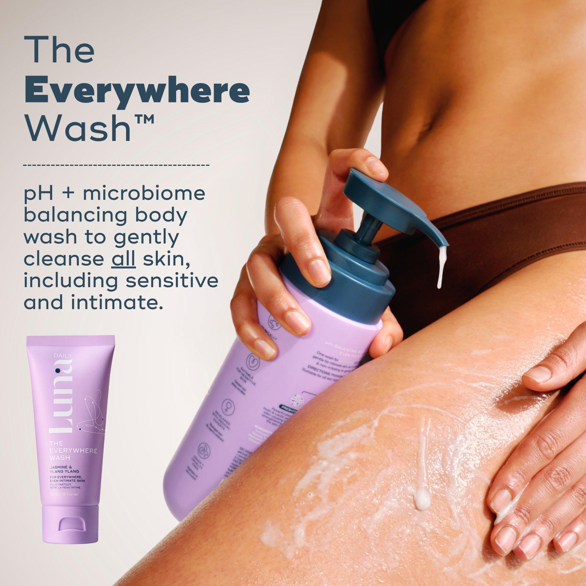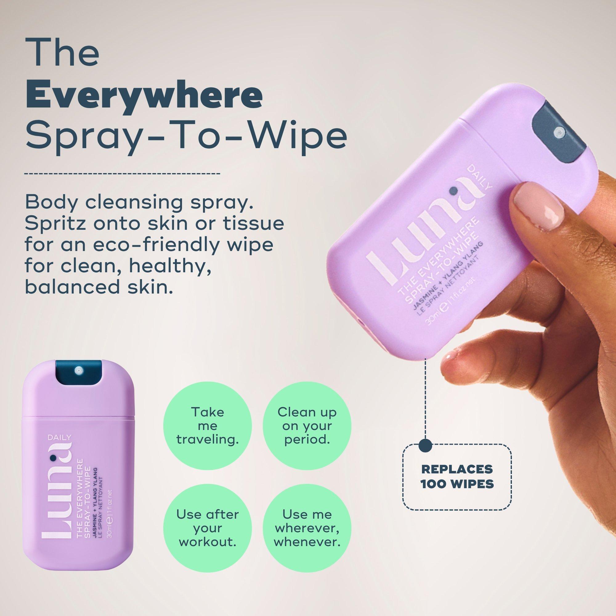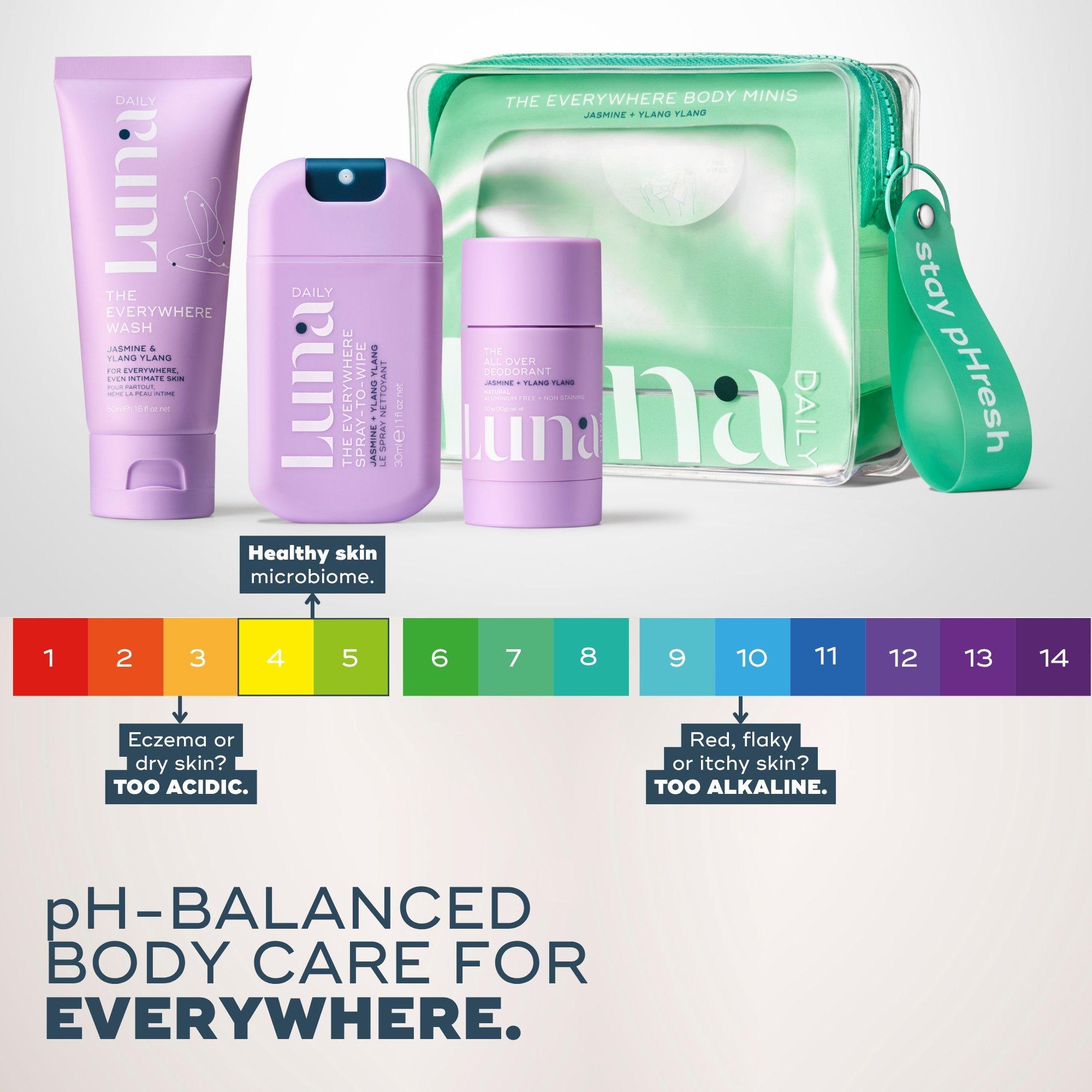 Luna Daily's The Everywhere Body Minis Kit is a best-selling, clinically tested body care routine to balance and nourish skin from head to toe. The kit includes The Hydrating Everywhere WashTM, The Spray-to-Wipe and The All Over DeodorantTM .