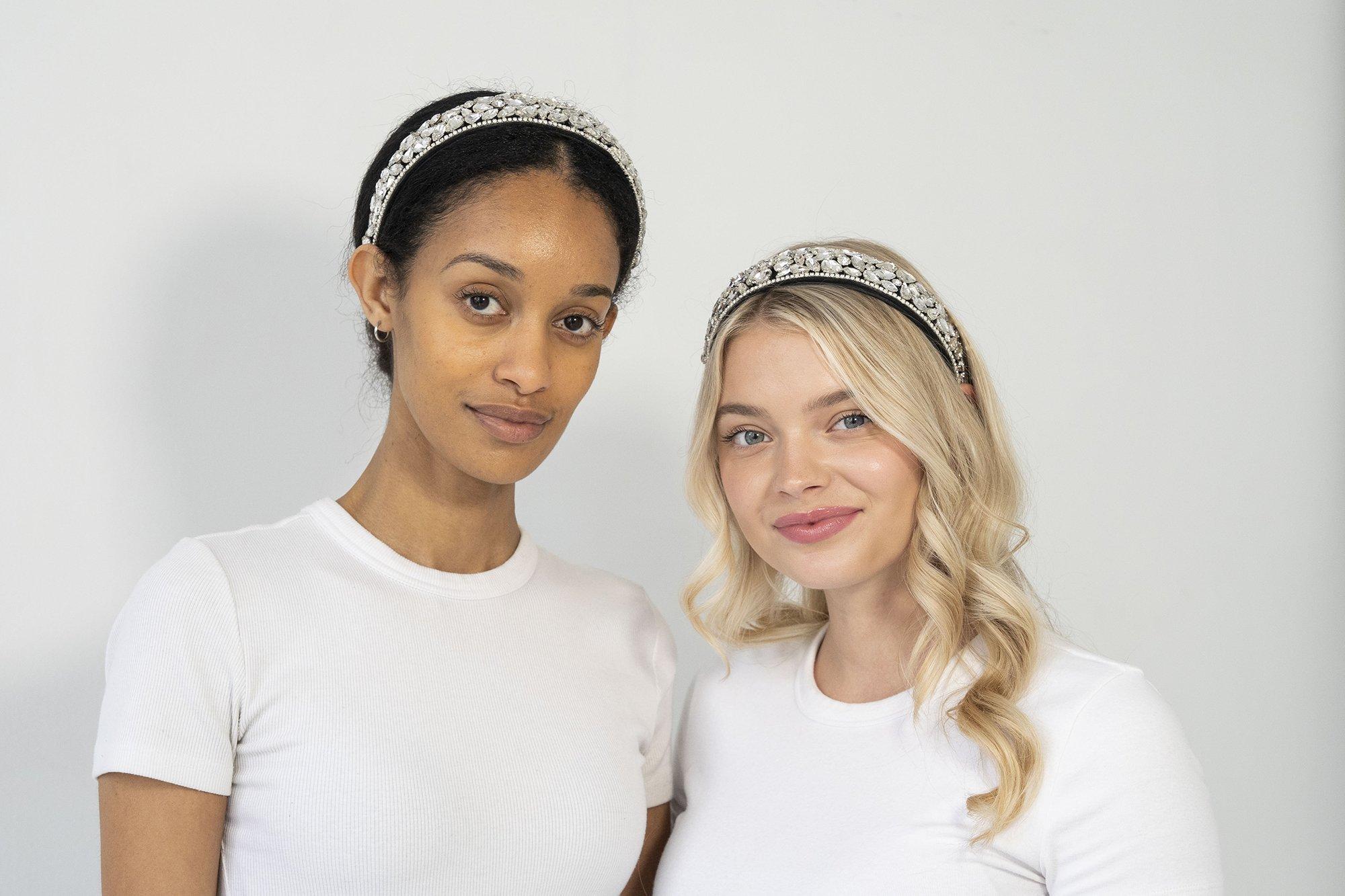 The Faye Teardrop Gemstone Headband by Locks & Mane is a timeless accessory that boasts a rich, black base adorned with exquisite teardrop-shaped diamond jewels.