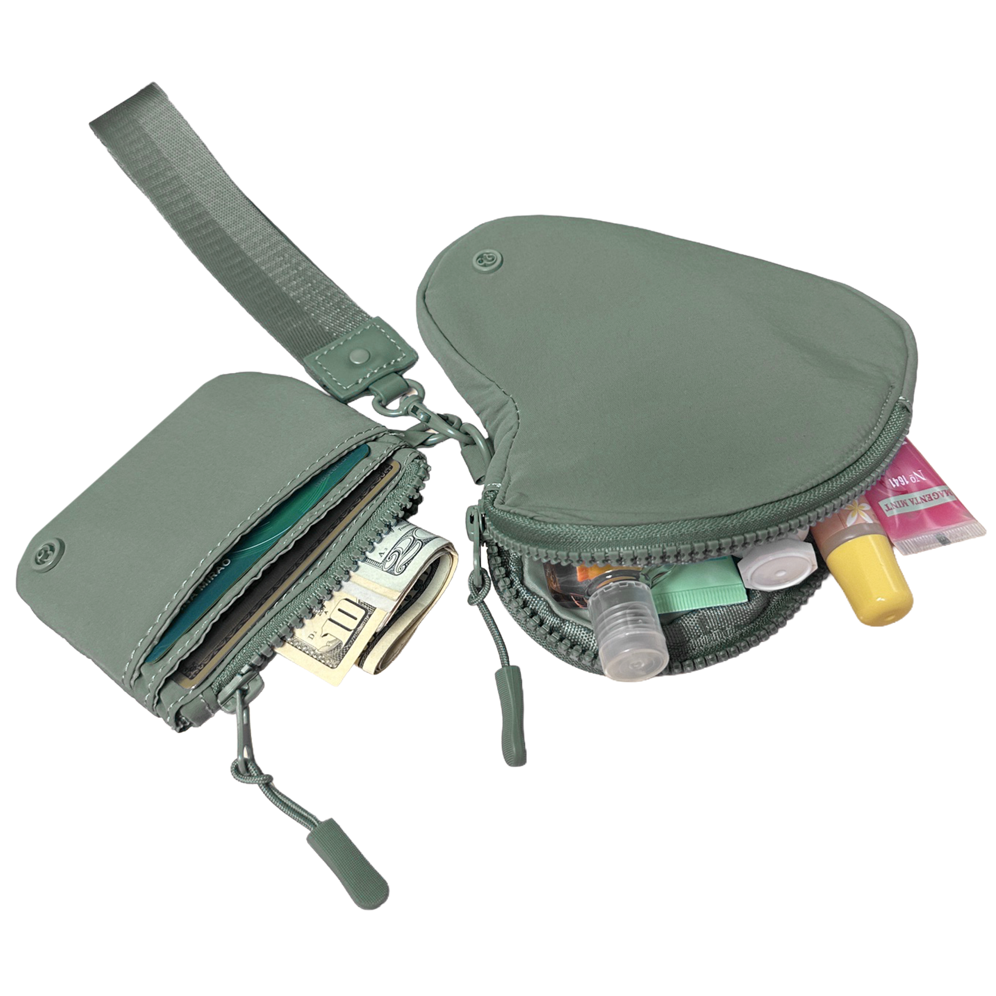 Attach your keys to the wristlet lanyard and secure your cards and ID in the card case. Use the zippered center compartment for coins or small essentials, and stash extras in the heart-shaped pouch. Clip or remove pieces to customize your setup, then slip the wristlet on for easy, hands-free carrying wherever your day takes you.