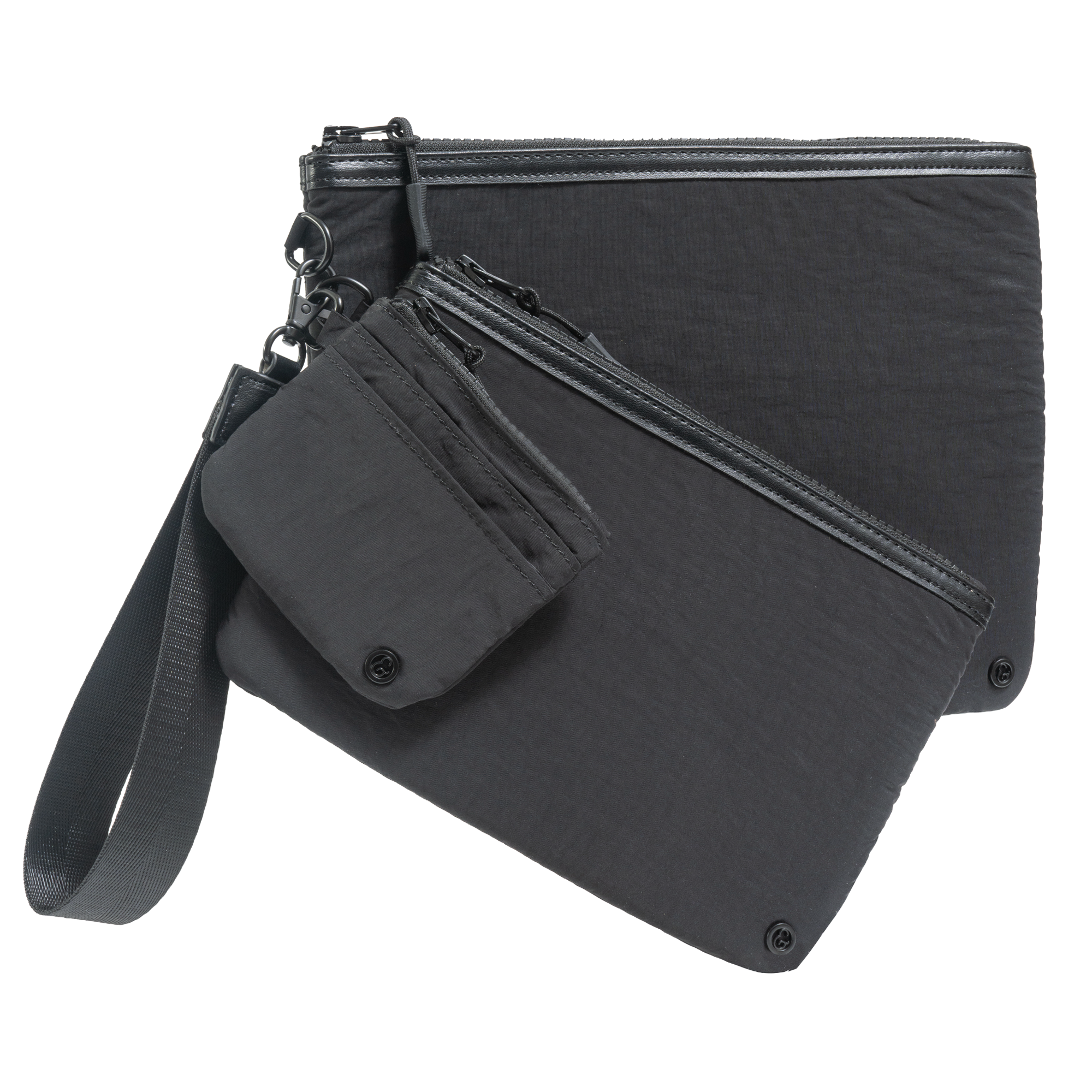 Store your cards and ID in the card case, and use the two zip pouches to organize tech accessories, cash, or other daily essentials—slipping smaller items into the interior mesh pockets for added organization. Attach your keys to the wristlet lanyard, customize by adding or removing pouches as needed, and carry it hands-free for easy, grab-and-go convenience wherever you’re headed.