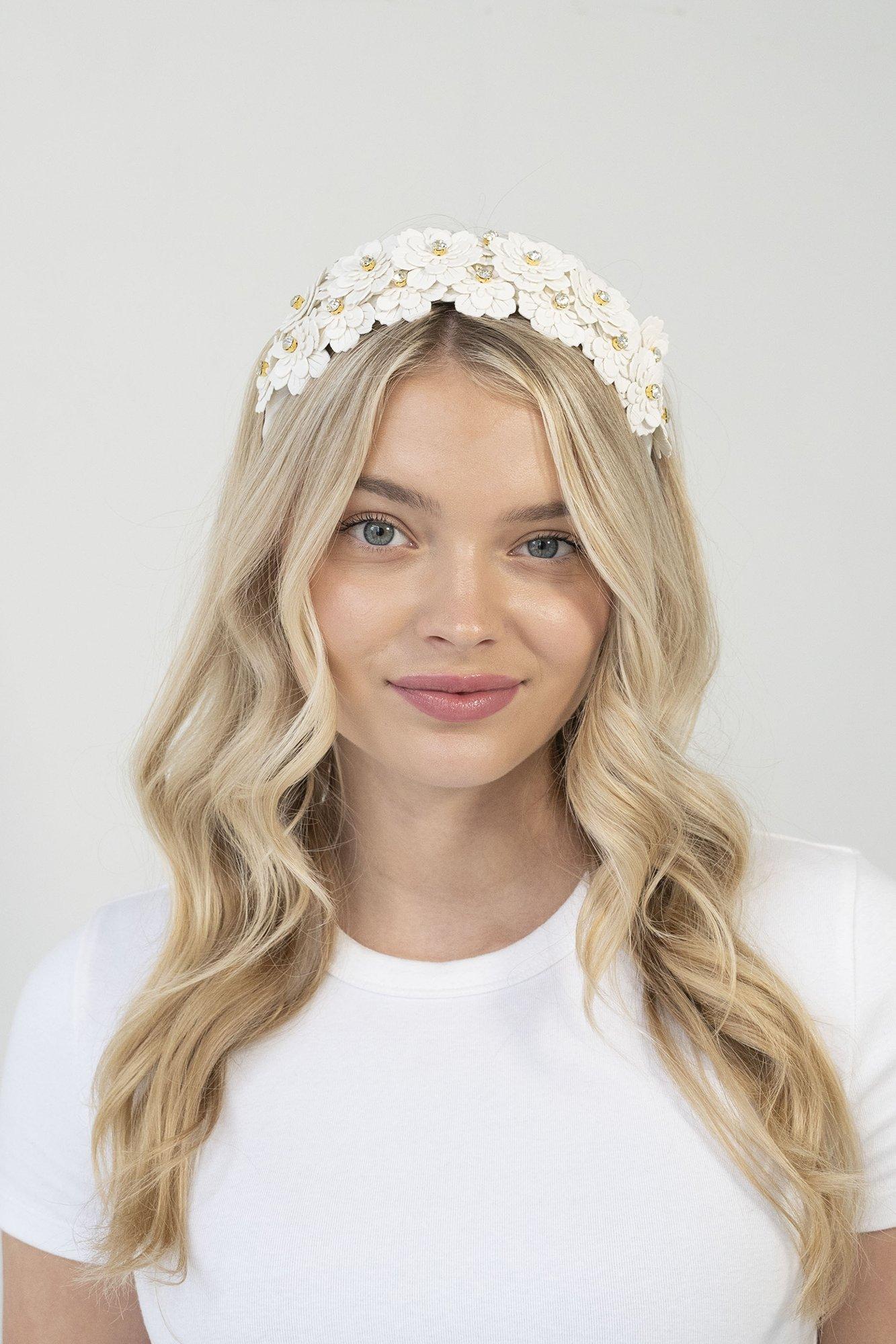 The Lindsay Leather Flower Headband by Locks & Mane is fashioned from rich white fabric and adorned with overlapping faux leather flowers and delicate jewels. Embrace the beauty of nature with this enchanting headband that is sure to turn heads.