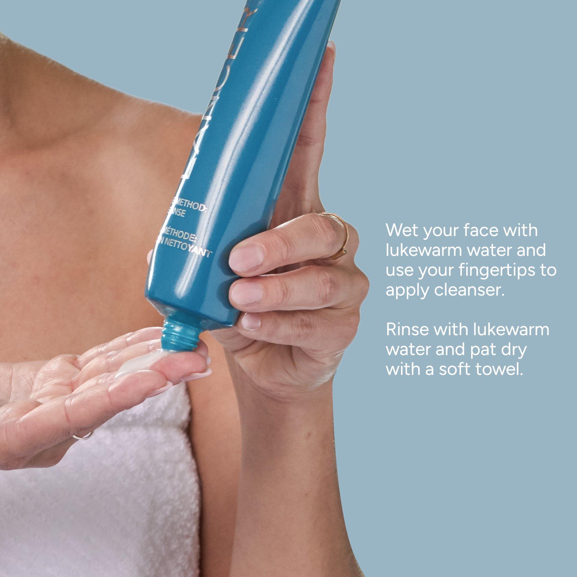 Apply a small amount to damp skin, then gently massage over face, neck and décolleté, avoiding the eye area. Rise thoroughly.