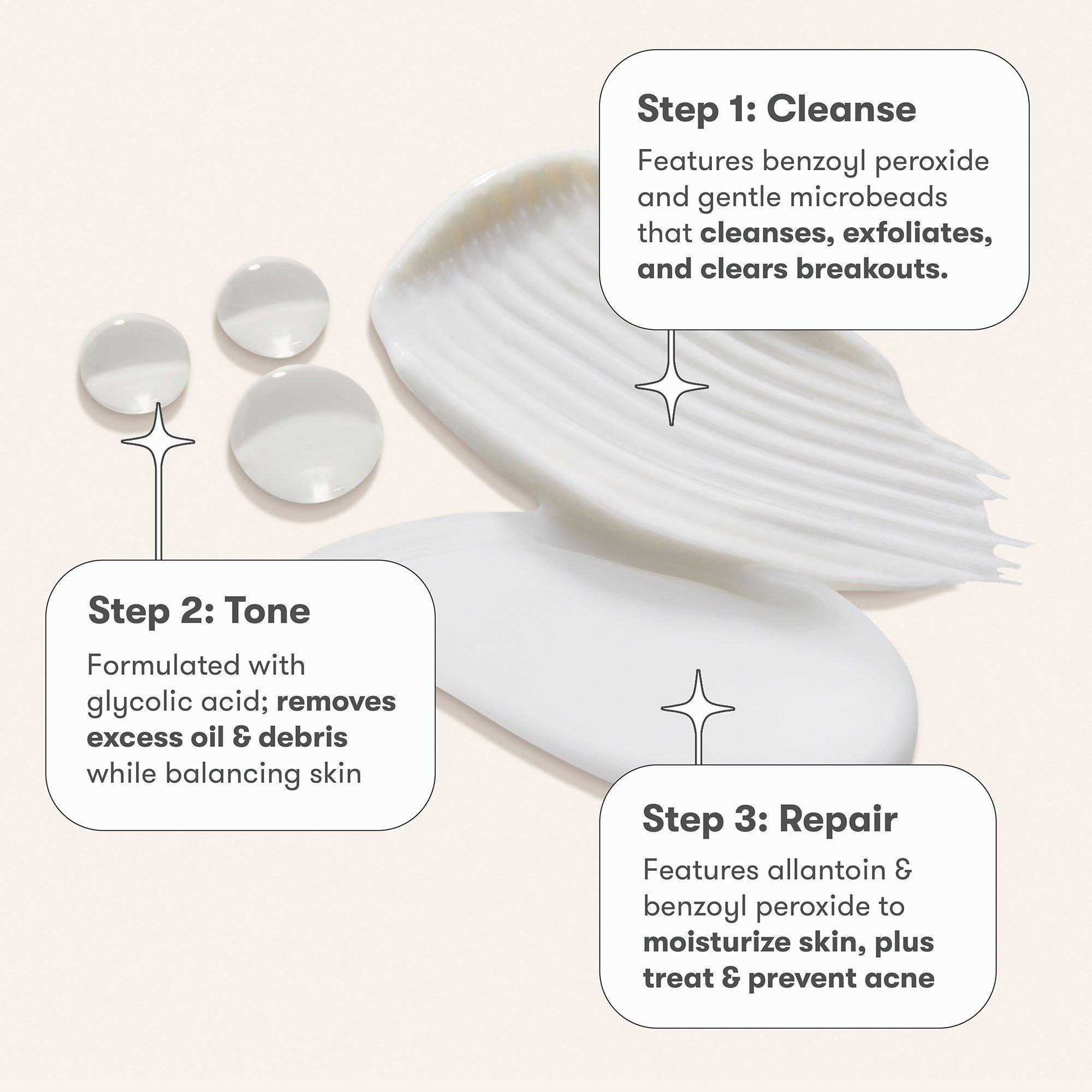 Renewing Cleanser: Apply twice daily, morning and night. Treat your whole face. Apply a small (dime-sized) amount to dampened skin and gently massage with fingertips for 1 to 2 minutes. Rinse thoroughly with warm water. Pat dry and follow with Step 2 (Revitalizing Toner). If bothersome dryness or peeling occurs, reduce application to once a day or every other day. If going outside, use a sunscreen. Revitalizing Toner: Apply to cleansed skin with a cotton ball or pad, morning and night as needed. Allow toner to dry and follow with Step 3. If going outside, use a sunscreen. If irritation or sensitivity develops, discontinue use and consult a doctor. Repairing Treatment: Use morning and night. On clean skin, apply a thin layer to the entire affected area. Allow to dry. Do not rinse off. If bothersome dryness or peeling occurs, reduce application use. If going outside, use a sunscreen. Read product label for full directions and warnings
