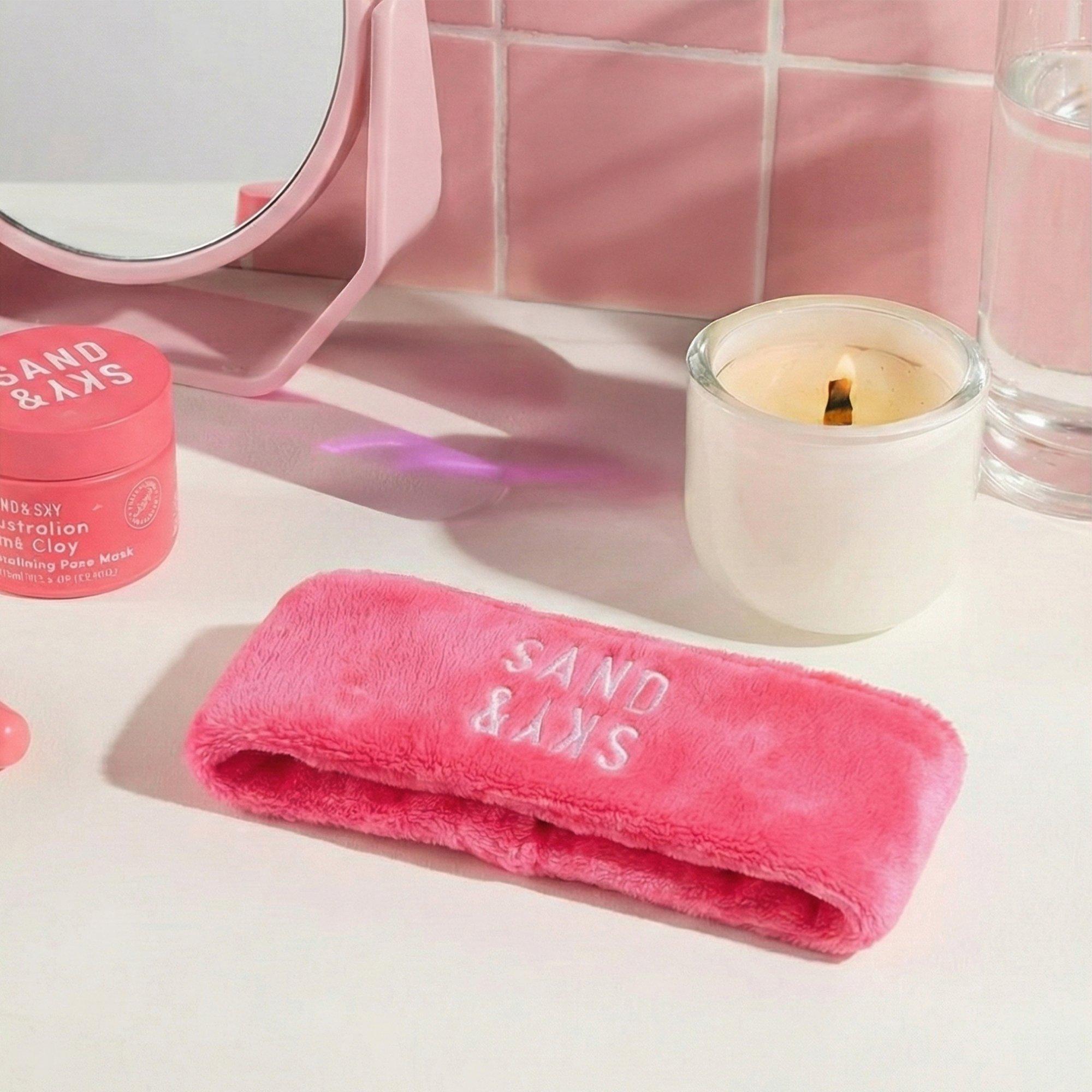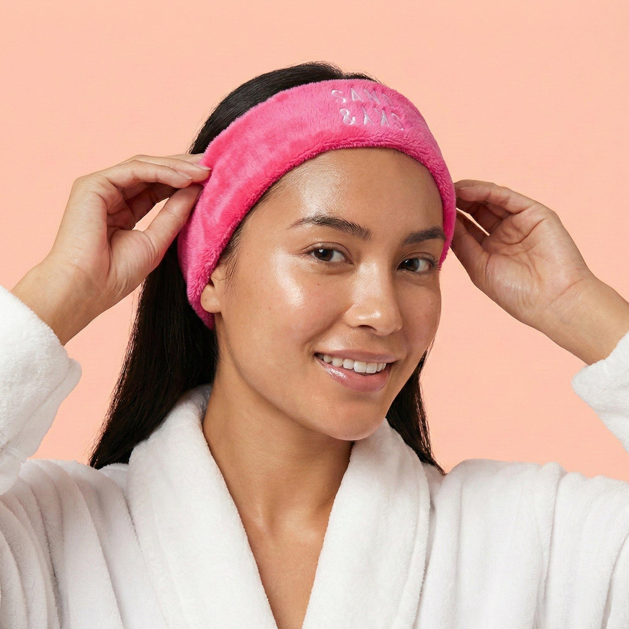 A soft, adjustable headband that keeps hair off your face during your skincare routine. The signature pink design adds a touch of fun to your cleansing and masking prep.