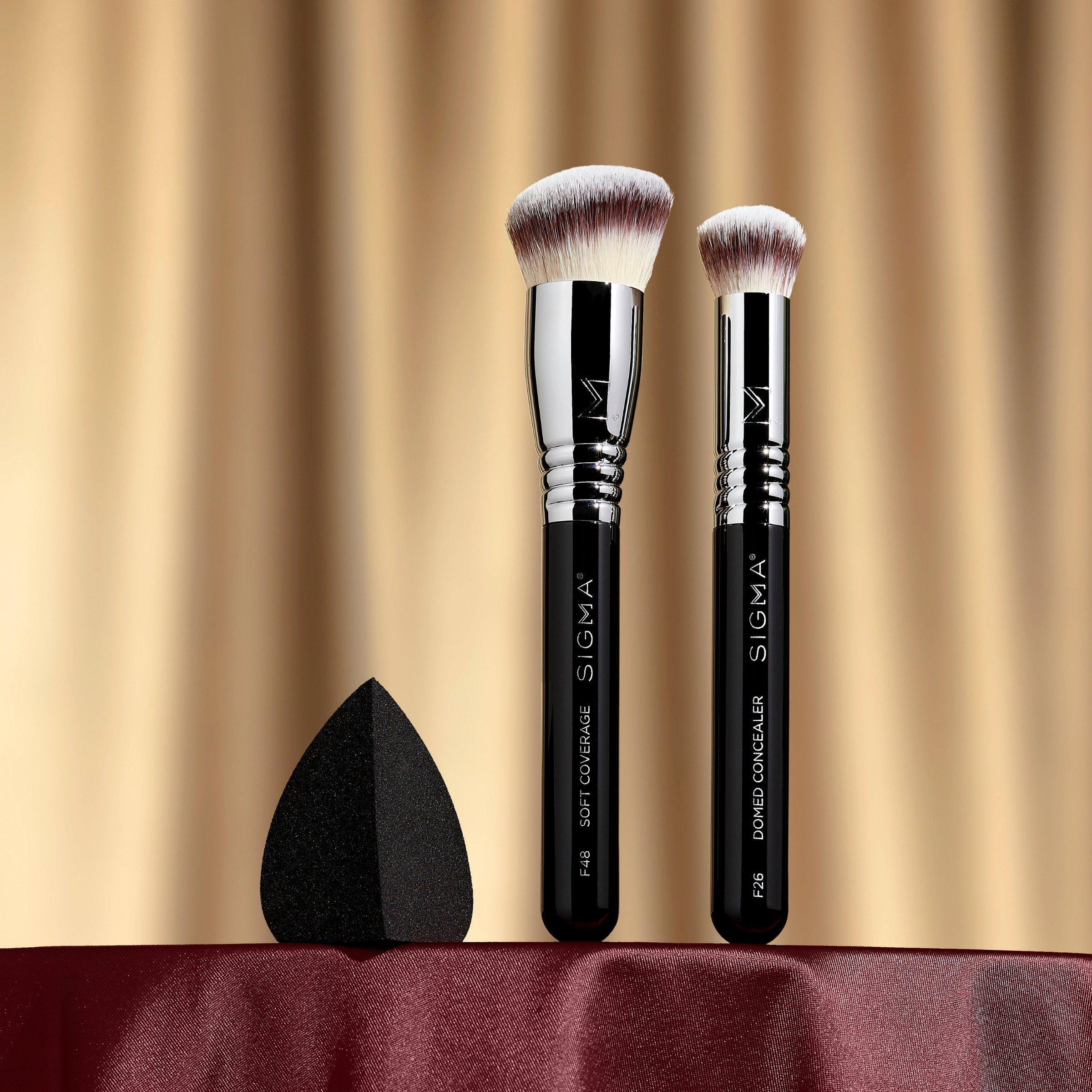 Use the F48 Soft Coverage Brush to apply and blend liquid or cream foundation with smooth, even coverage. The F26 Domed Concealer Brush is ideal for targeting smaller areas like under the eyes or around the nose, helping to blend concealer with precision. For liquids or creams, dampen the 3DHD Blender and bounce it across the skin for an airbrushed, streak-free finish.