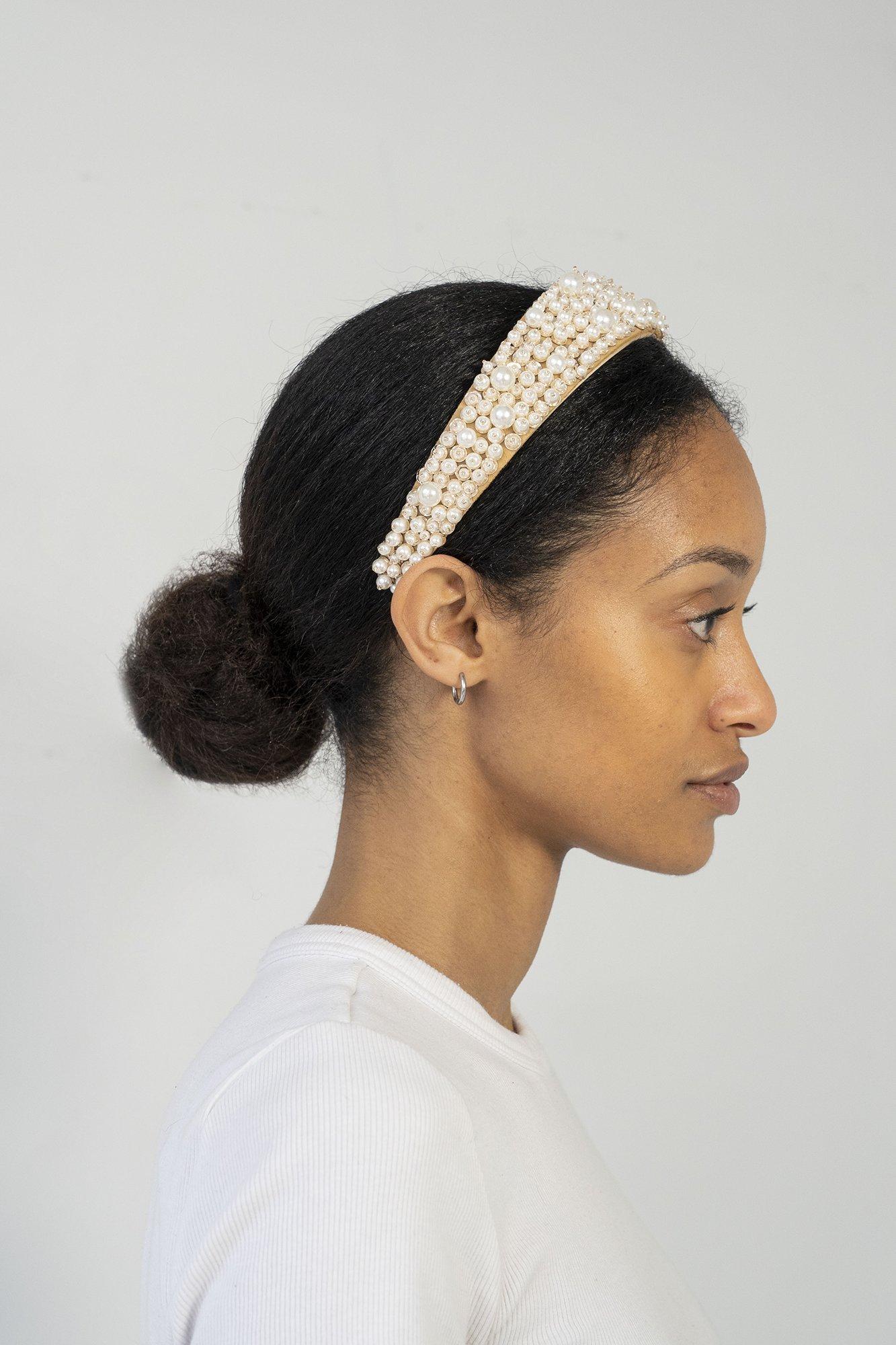 The Sonja Multipearl Headband by Locks & Mane is a luxurious headband covered in white and pale pearls. Each pearl is meticulously hand-placed to create a stunning design. This headband is the perfect choice for effortless styling with a hint of luxury.