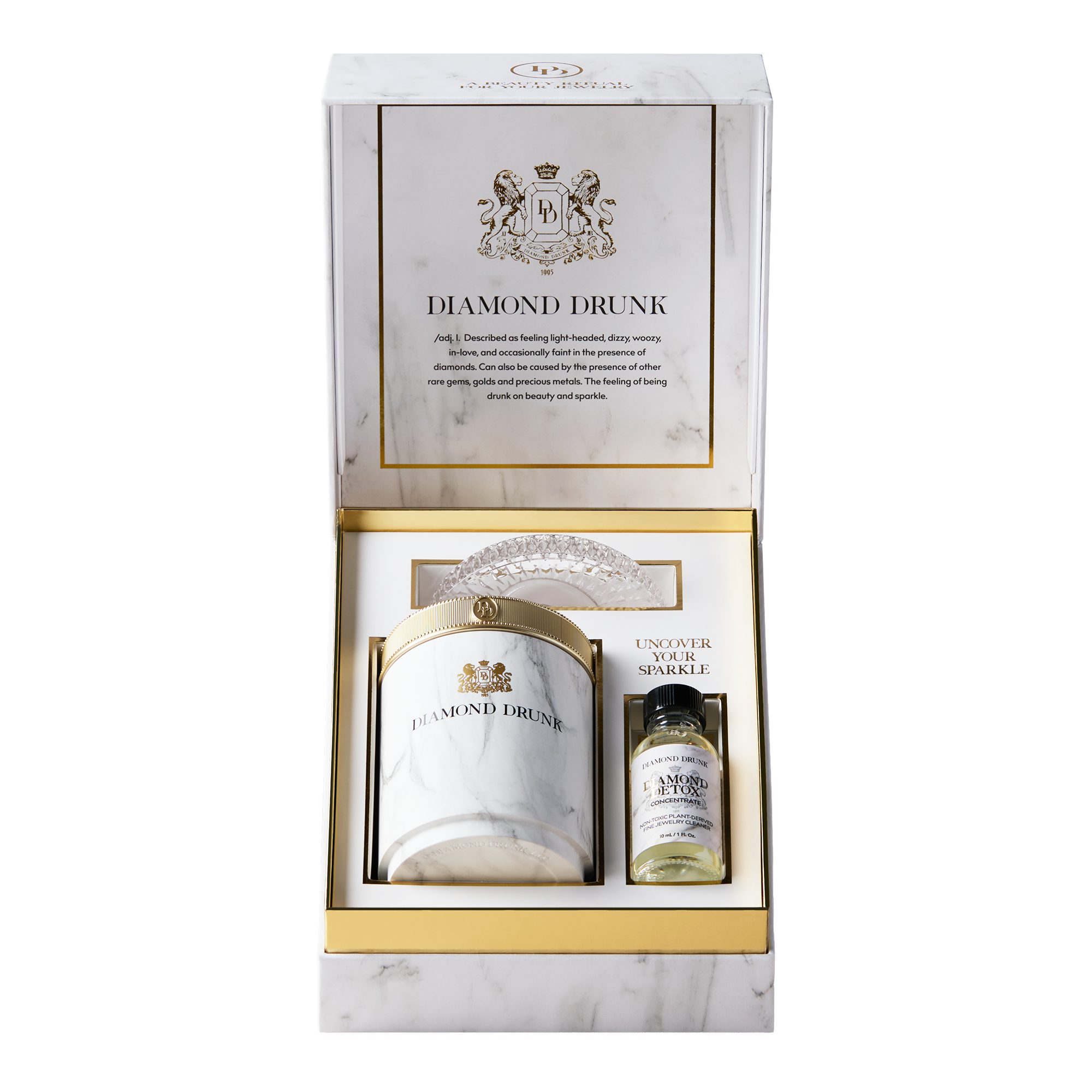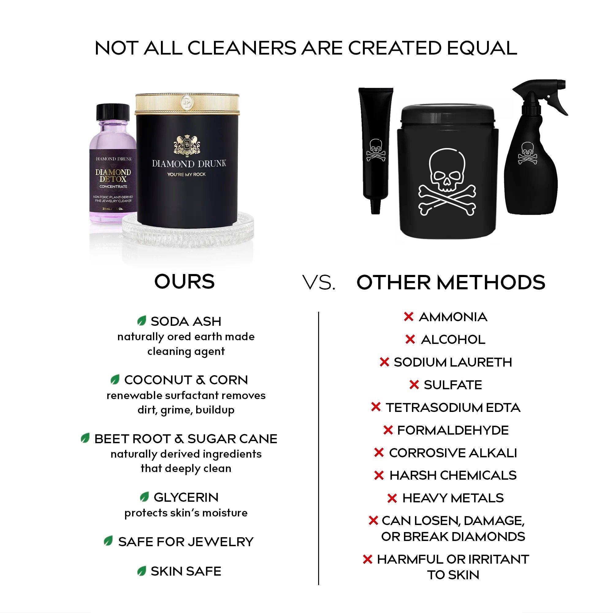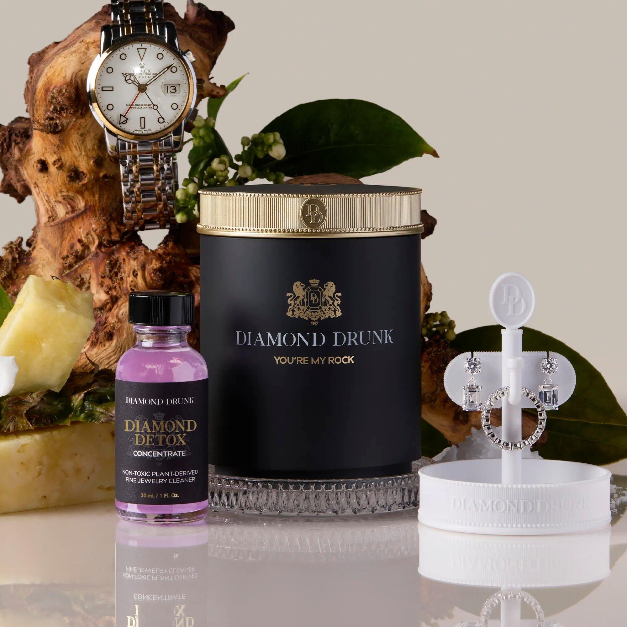 Non-toxic fine jewelry cleaner for diamonds, gold, and platinum. Includes a reusable, refillable vessel, two-month supply of Diamond Detox Concentrate, patented bauble basket, crystalline coaster, and brush.