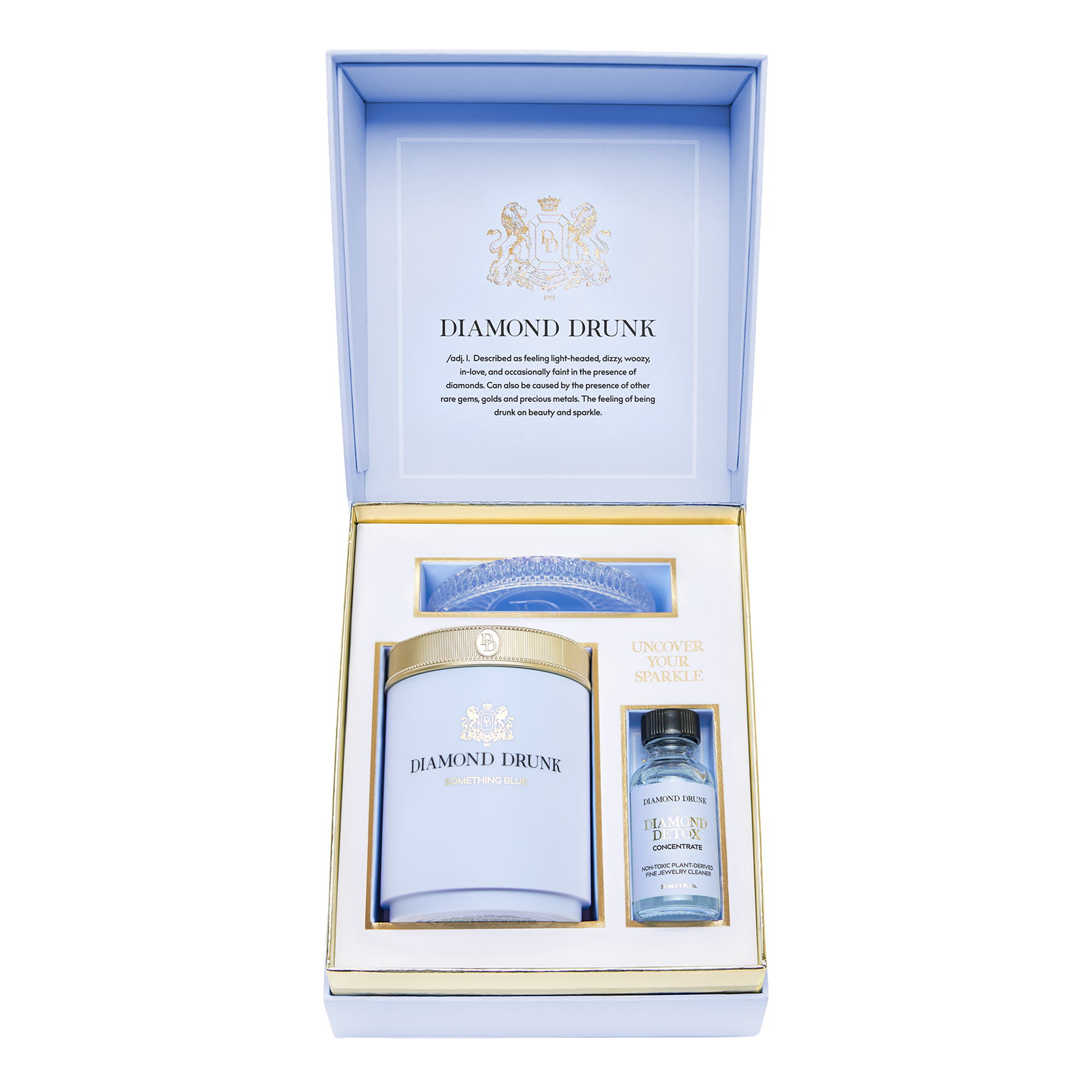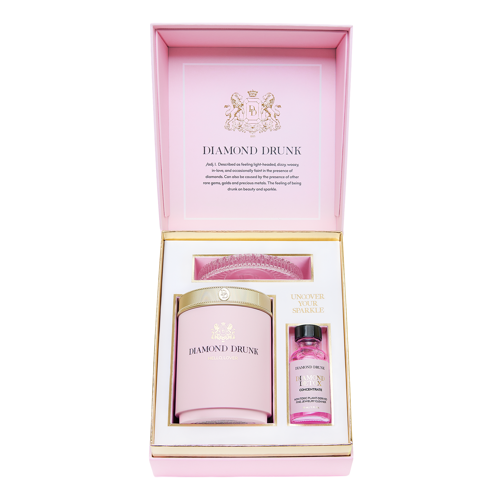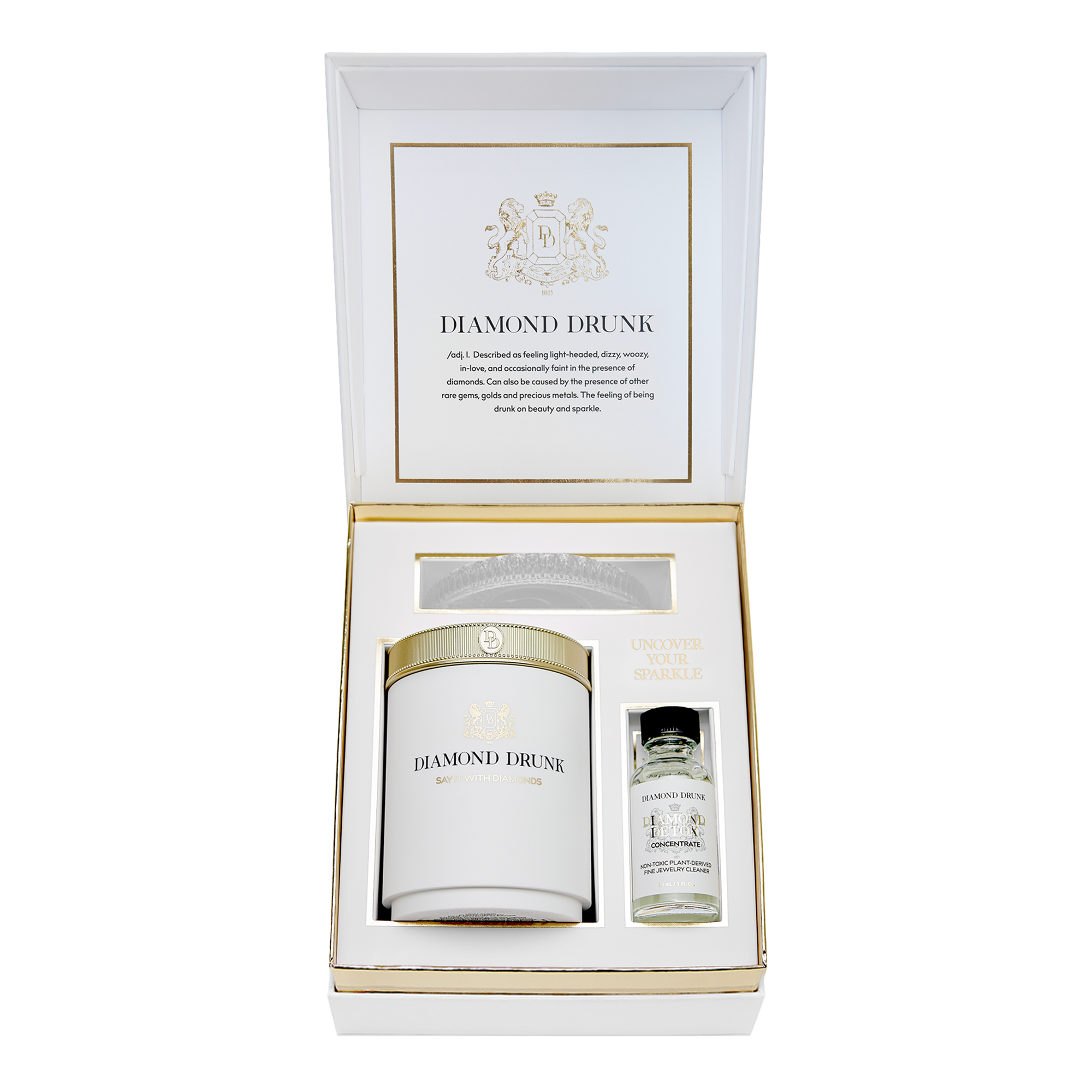 Non-toxic fine jewelry cleaner for diamonds, gold, and platinum. Includes a reusable, refillable vessel, two-month supply of Diamond Detox Concentrate, patented bauble basket, crystalline coaster, and brush.
