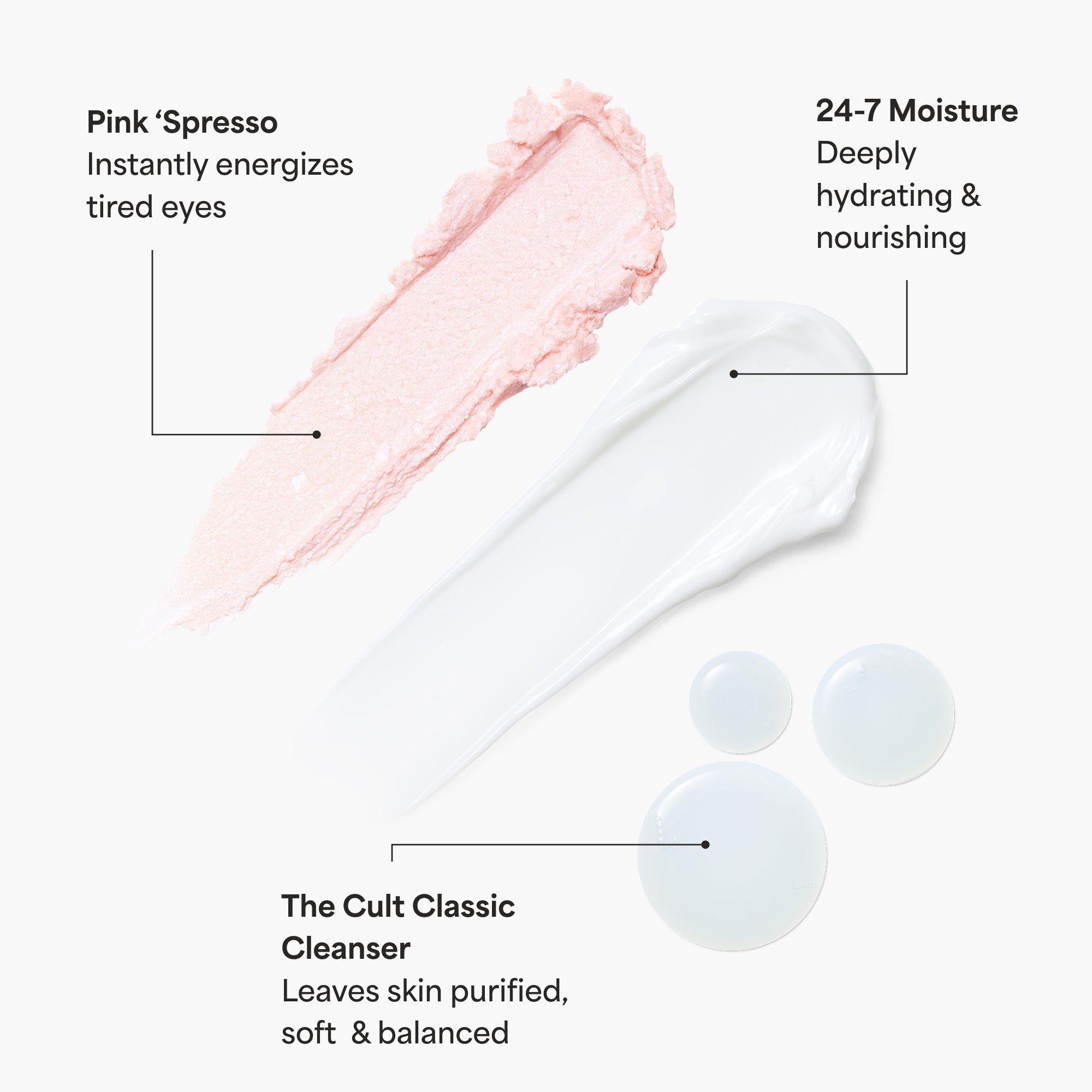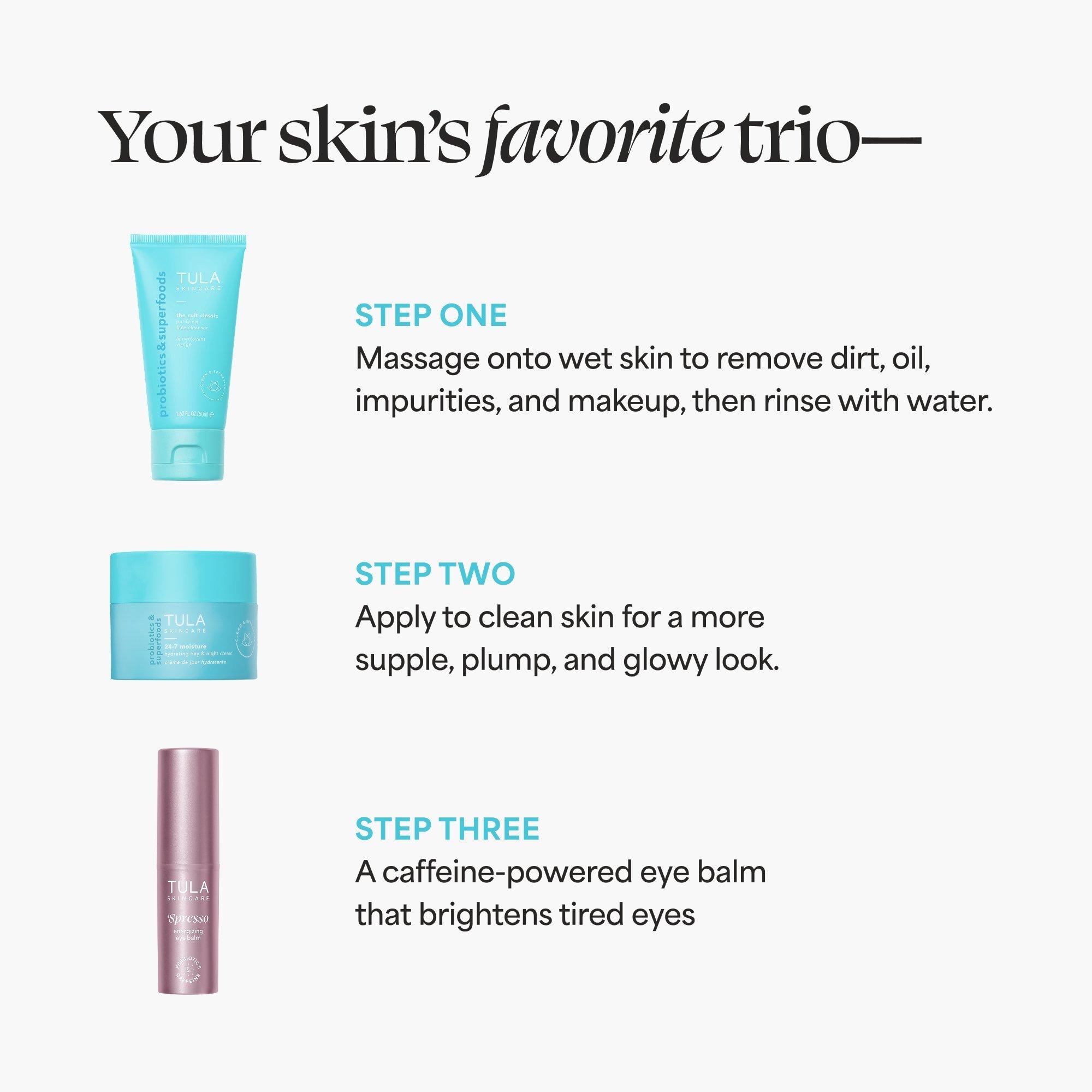 Treat yourself to TULA’s The Treat Trio. This scrumptious value set features the bestselling full-size Pink ‘Spresso Energizing eye balm & two travel-size bestsellers. This kit simplifies your skincare in just 3 steps: cleanse, hydrate, energize. Plus they’re perfectly-sized to use on the fly.