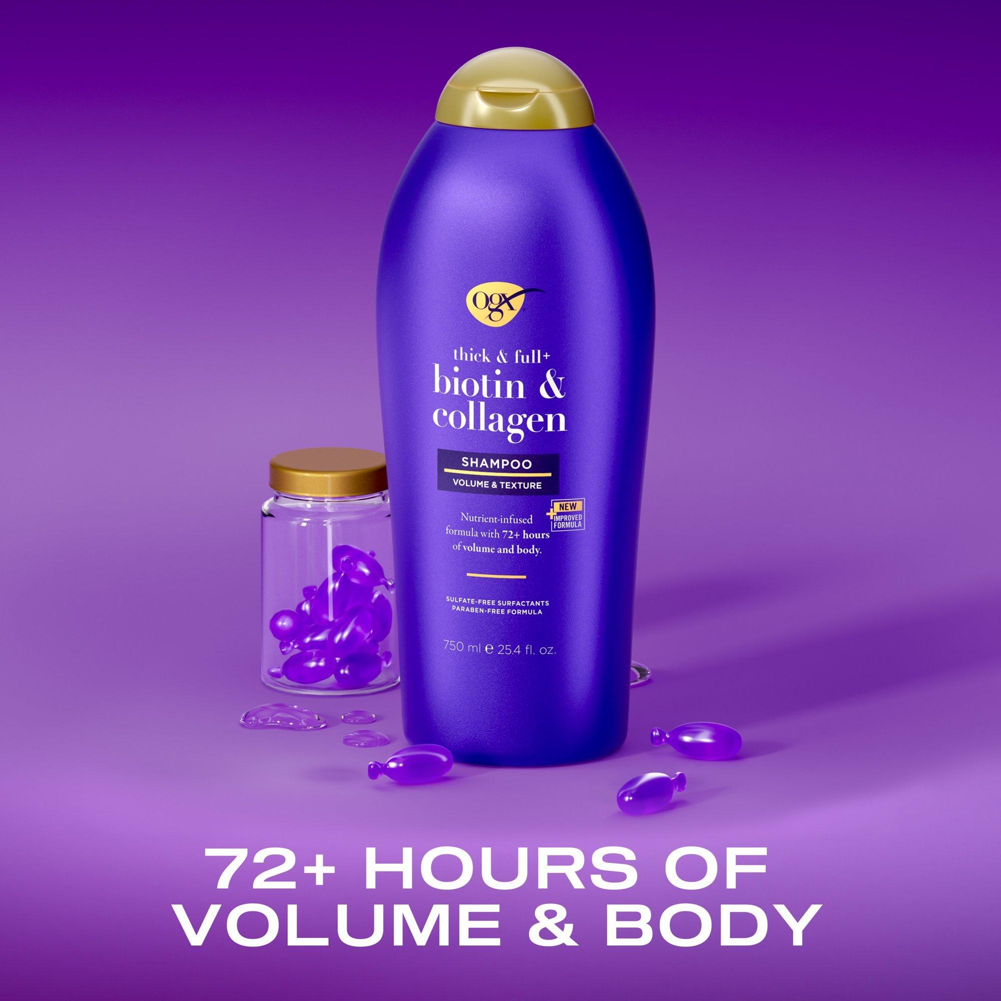 Get 72+ hours of volume & body with OGX Thick & Full + Biotin & Collagen Volumizing Shampoo.