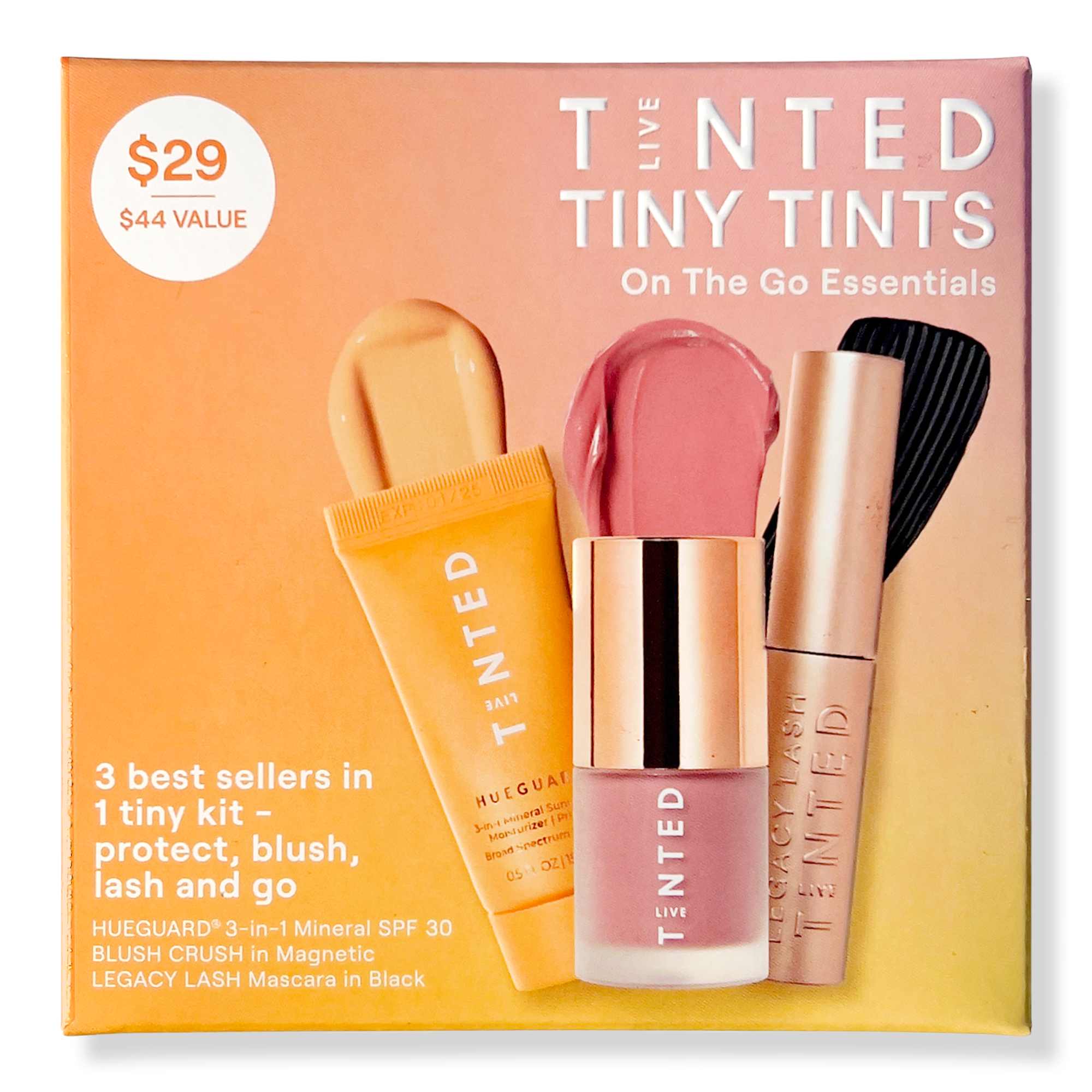 3 Live Tinted bestsellers in 1 mini kit for a radiant daily routine: Hueguard 3-in-1 Mineral Sunscreen (SPF 30, no white cast), Blush Crush liquid blush for all-day flushed cheeks, and Legacy Lash Mascara—a clean mascara-serum hybrid for volume and long-term lash care. Protect, blush, lash, and go!