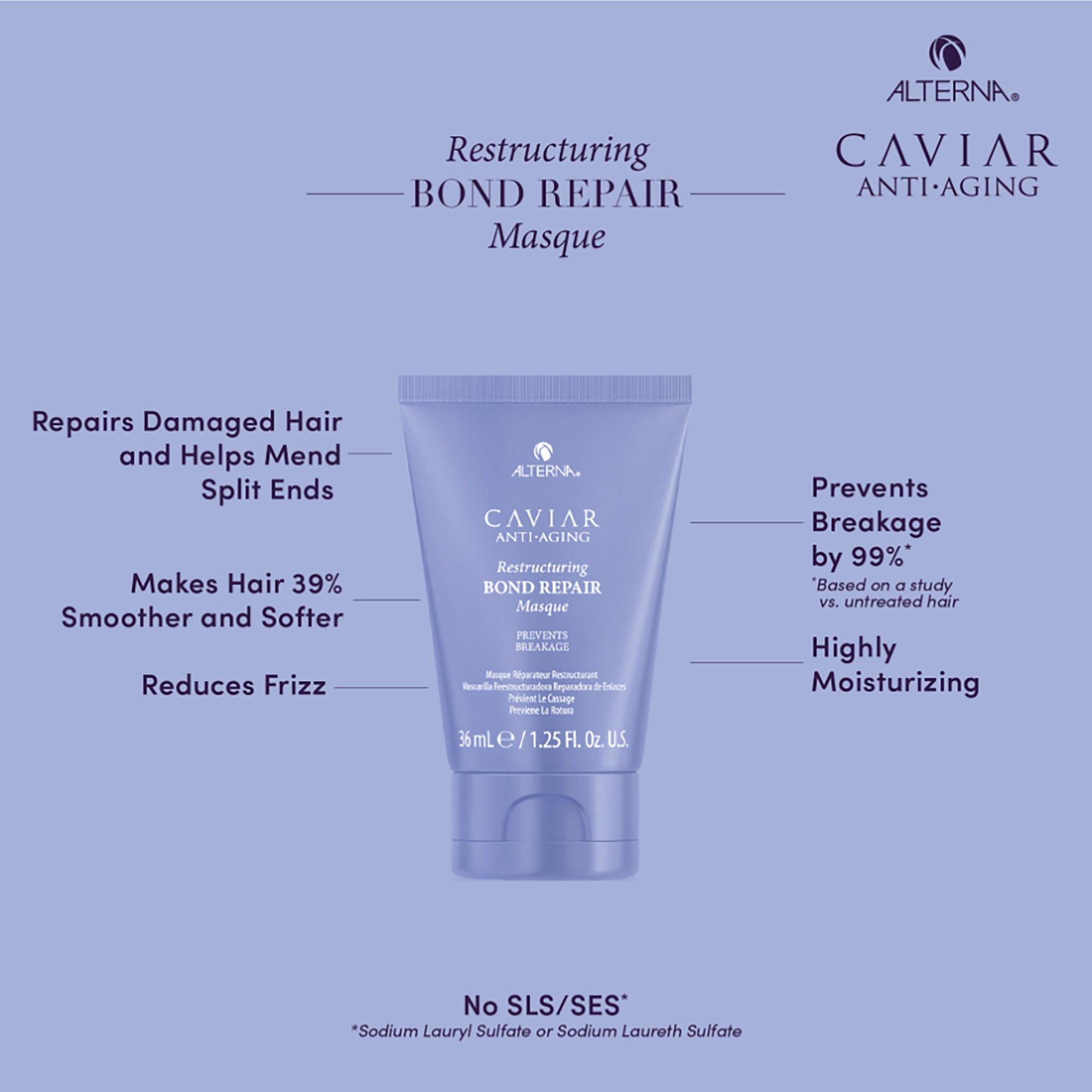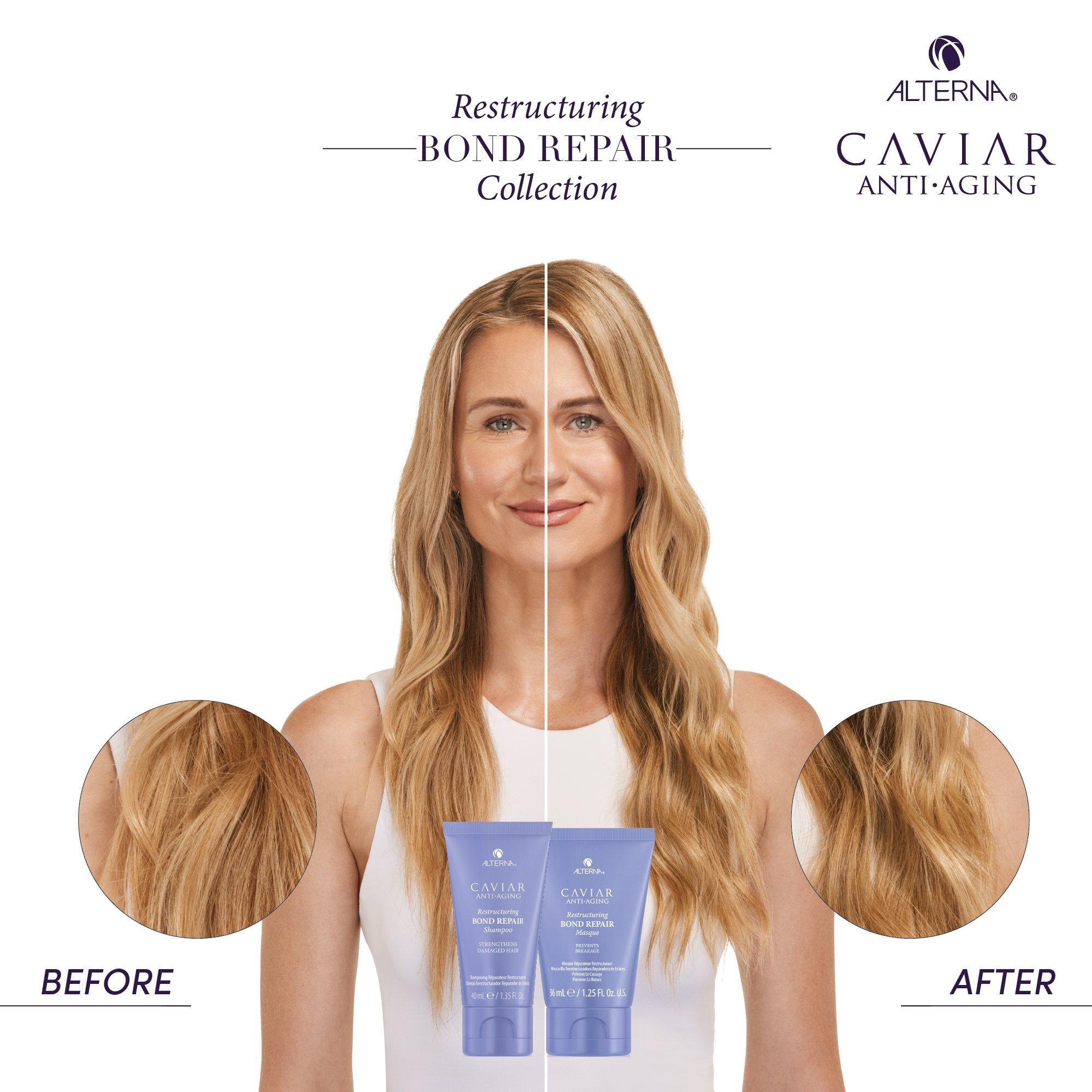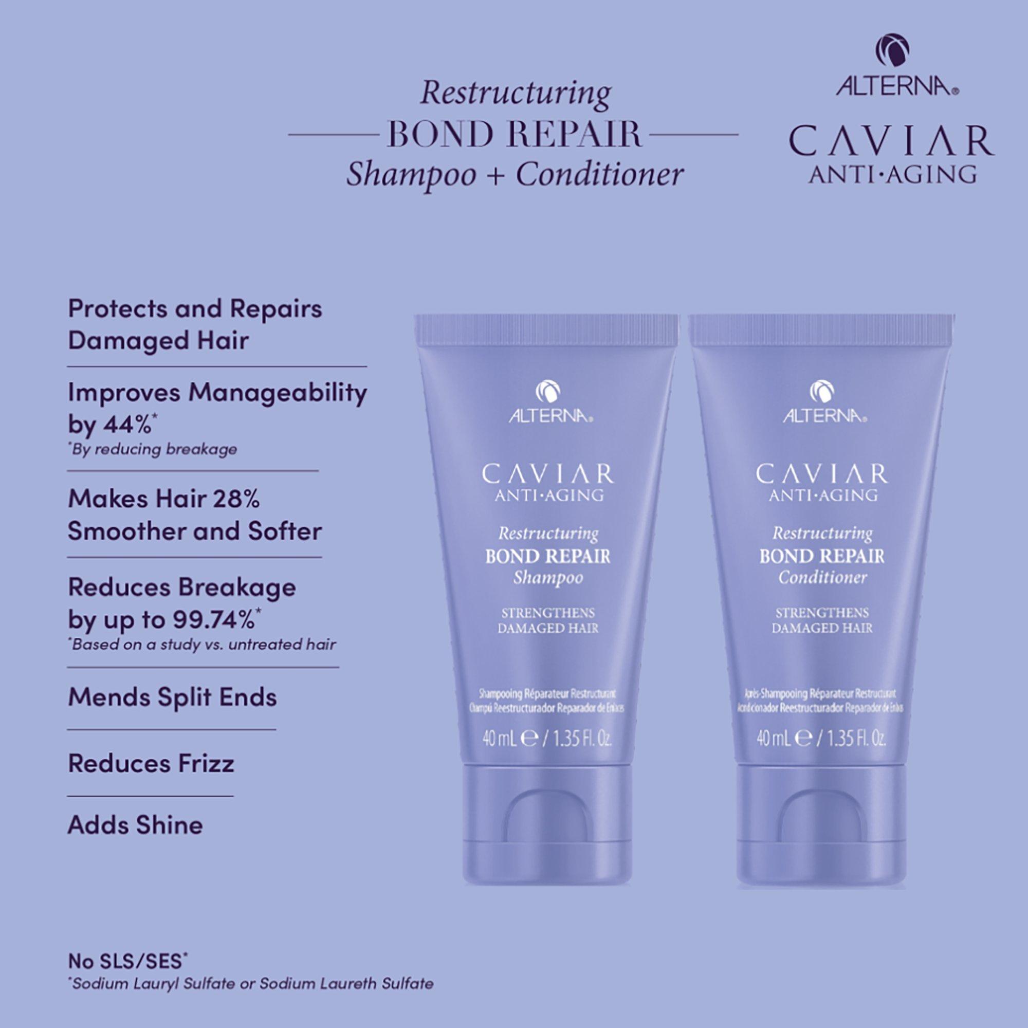 Alterna's Transformational Bond Repair Kit includes a reparative shampoo and conditioner duo that protects and repairs damaged hair, and a moisturizing, reparative treatment masque that reduces breakage and frizz.