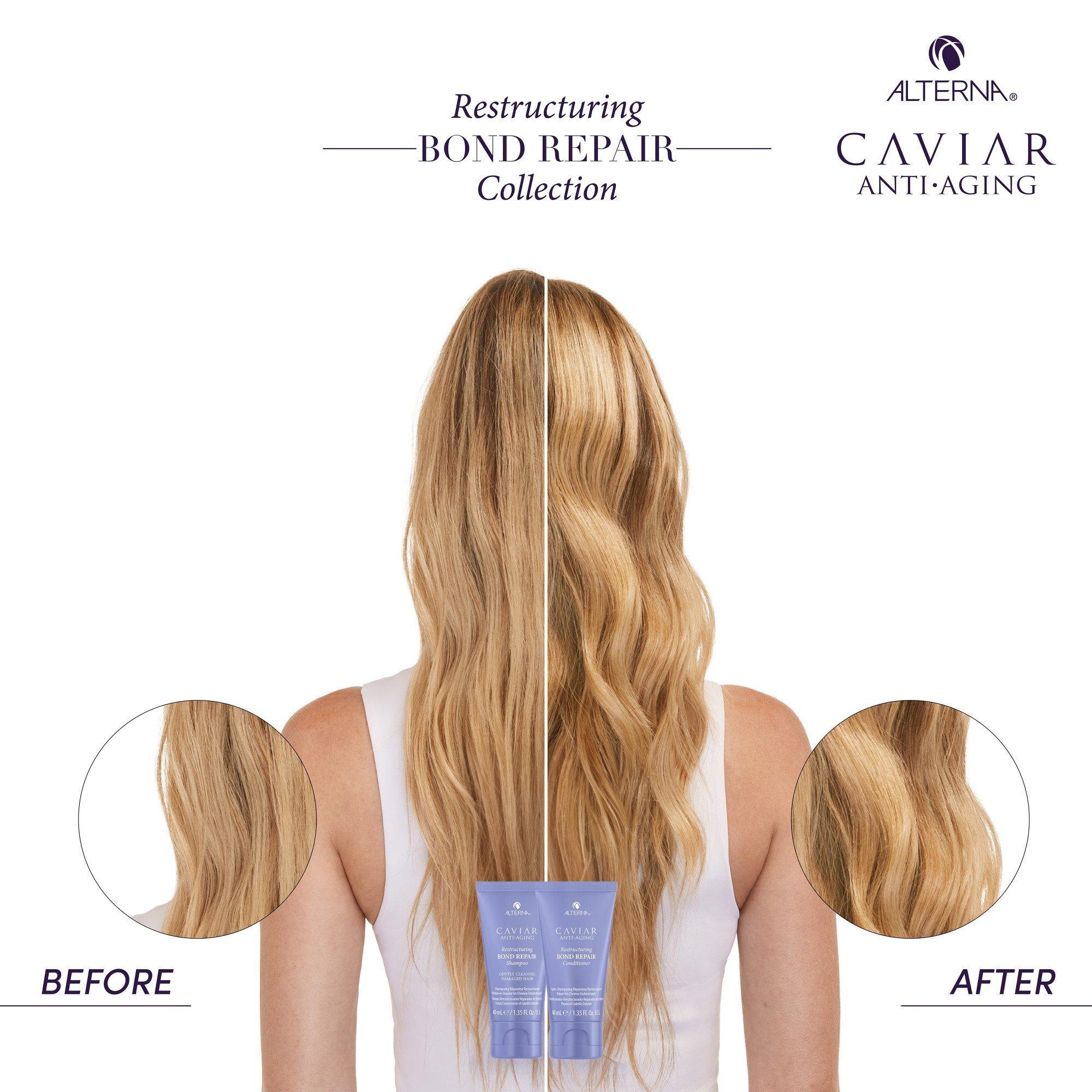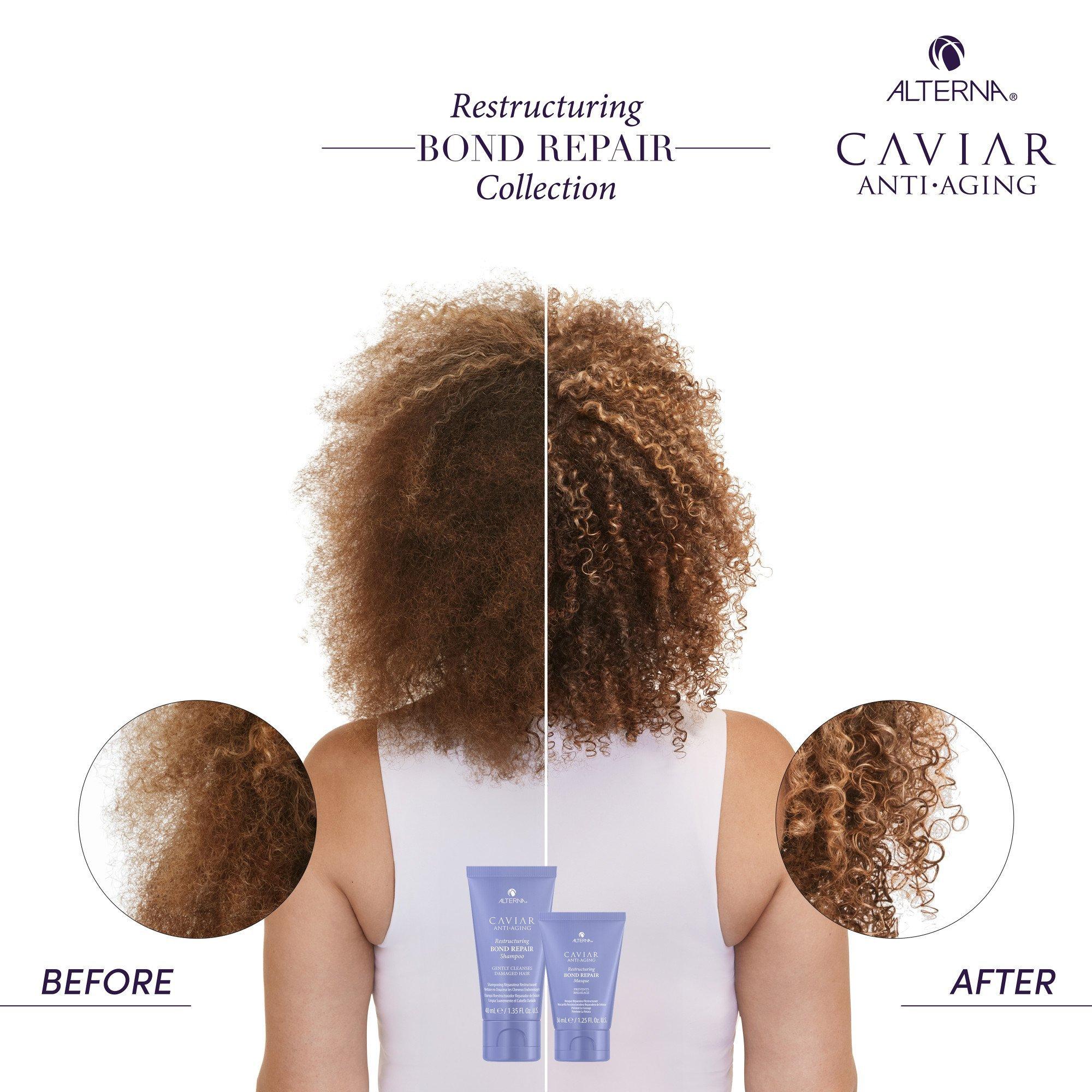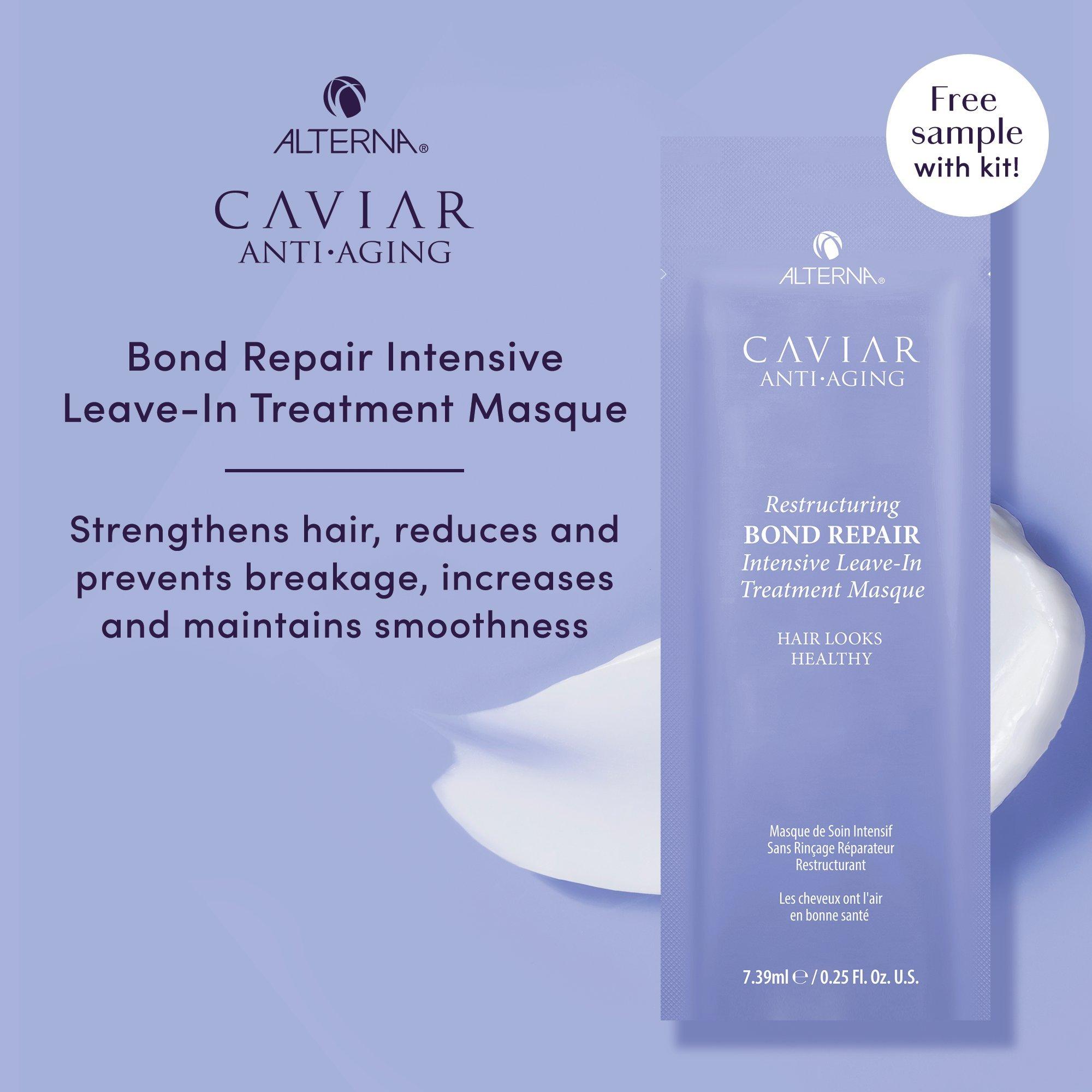 Alterna's Transformational Bond Repair Kit includes a reparative shampoo and conditioner duo that protects and repairs damaged hair, and a moisturizing, reparative treatment masque that reduces breakage and frizz.