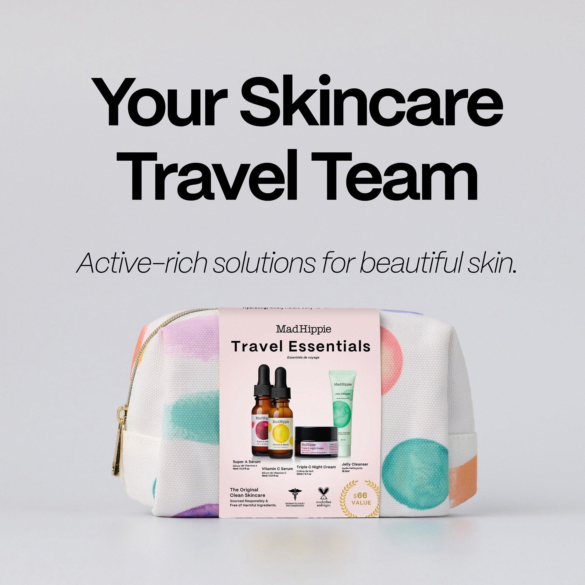 Mad Hippie award-winning, game changing, besties all packed tighter in this Travel Essentials Kit for the ultimate must-have day and night time cleansing/toning/hydrating antioxidant & retinoid routine for amazing skin results. Canvas travel bag is made from 100% recyclable plastics!