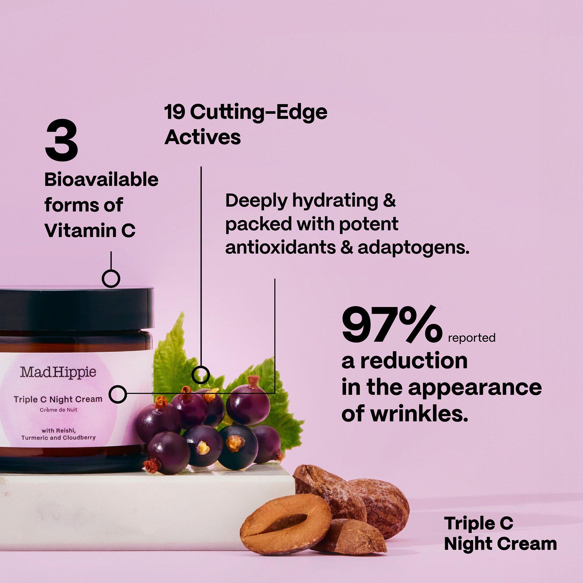 Triple C Night Cream: Gently massage into the skin to ensure actives fully penetrate. Can be worn over the Vitamin C or Vitamin A Serum.