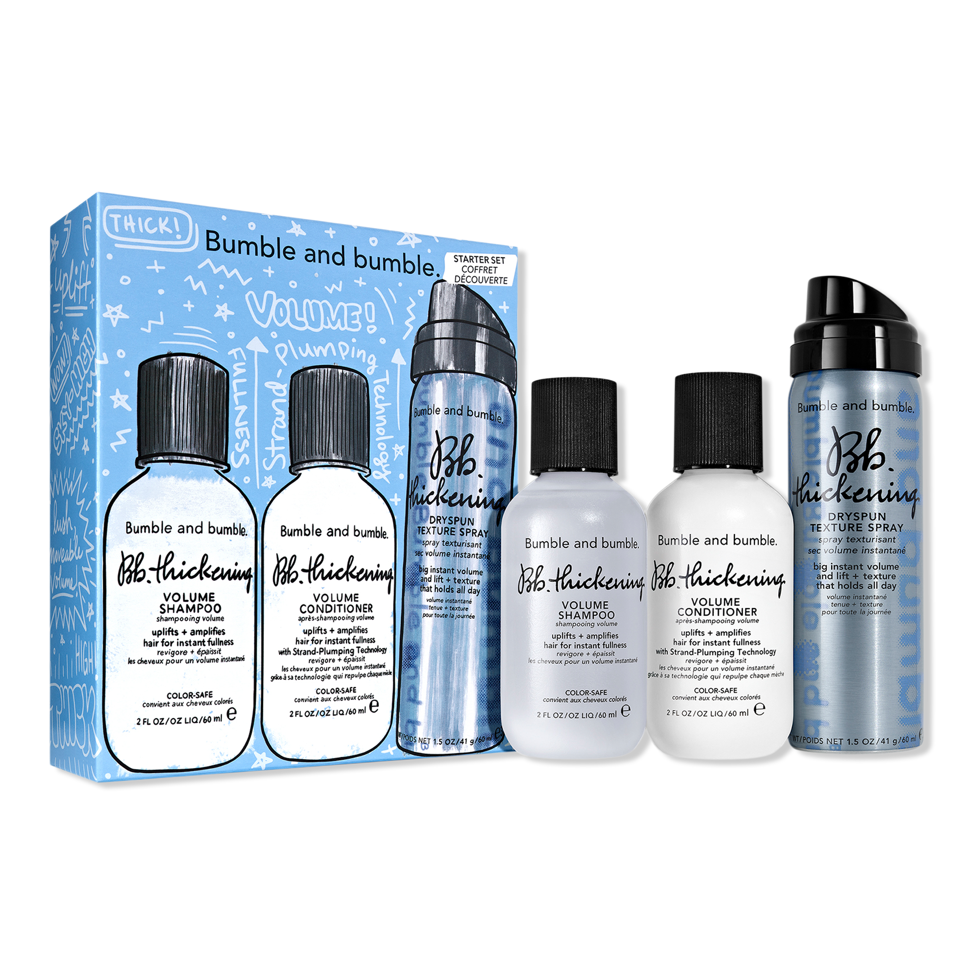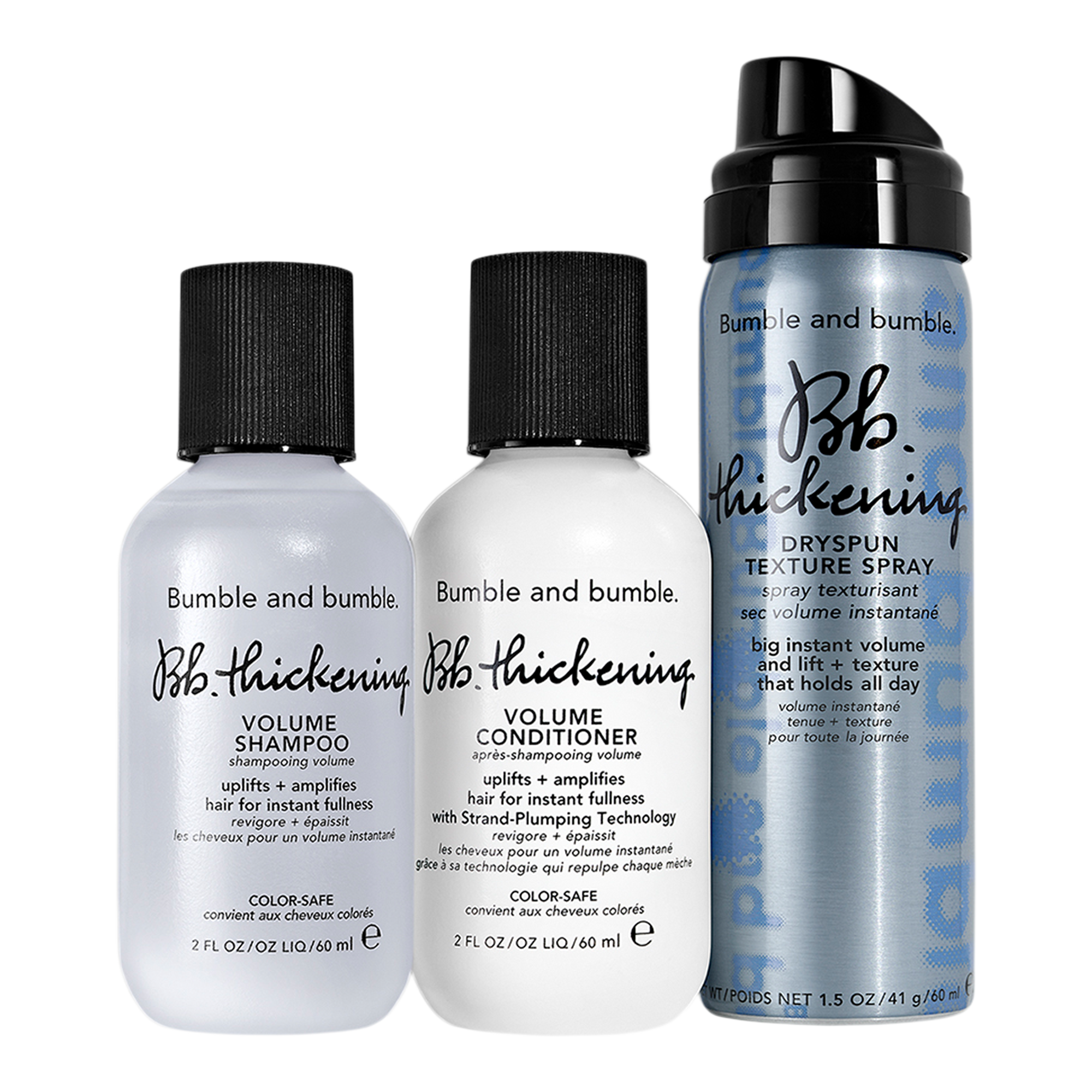 Bumble and bumble's Thickening + Volumizing Hair Set includes three volumizing hair products. Thickening Volume Shampoo uplifts + amplifies while Thickening Volume Conditioner instantly plumps each strand. Thickening Dryspun Texture Spray delivers +40% more volume instantly vs. untreated hair.