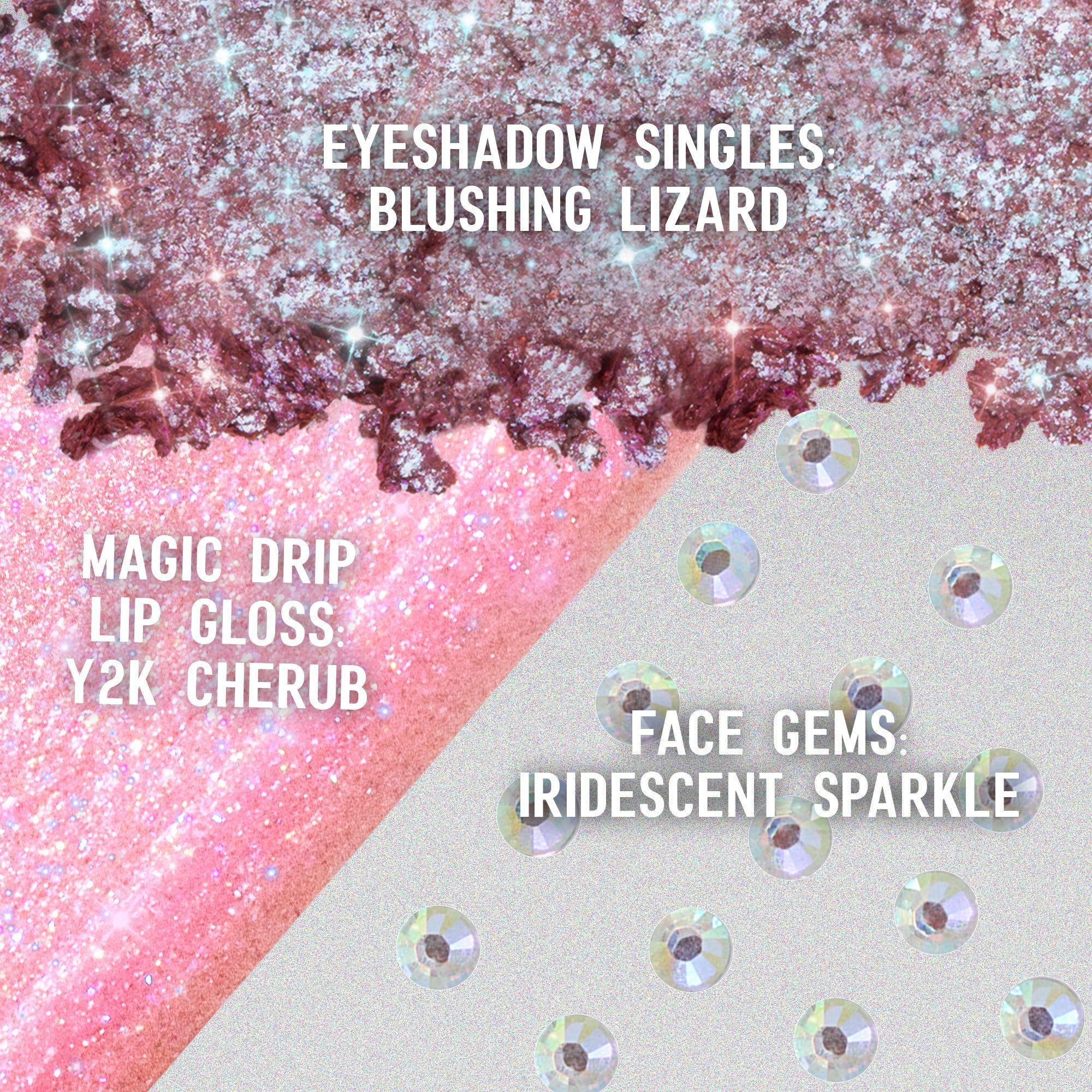 Blushing Lizard Eyeshadow: Calcium Aluminum Borosilicate, Dimethicone/Vinyl Dimethicone Crosspolymer, Silica, Phenyl Trimethicone, Caprylic/Capric Triglyceride, Ethylhexylglycerin, Titanium Dioxide (CI 77891), Iron Oxides (CI 77499), Red 40 (CI 16035), Yellow 5 (CI 19140). Y2K Cherub: Polybutene, Octyldodecanol, Diisostearyl Malate, Polyglyceryl-2 Triisostearate, VP/Hexadecene Copolymer, Calcium Sodium Borosilicate, Silica Dimethyl Silylate, Sorbitan Olivate, Synthetic Fluorphlogopite, Polyethylene, Microcrystalline Wax (Cera Microcristallina/Cire microcristalline), Silica, Tocopheryl Acetate, Tin Oxide, Titanium Dioxide (CI 77891), Red 28 Lake (CI 45410), Yellow 5 Lake (CI 19140).