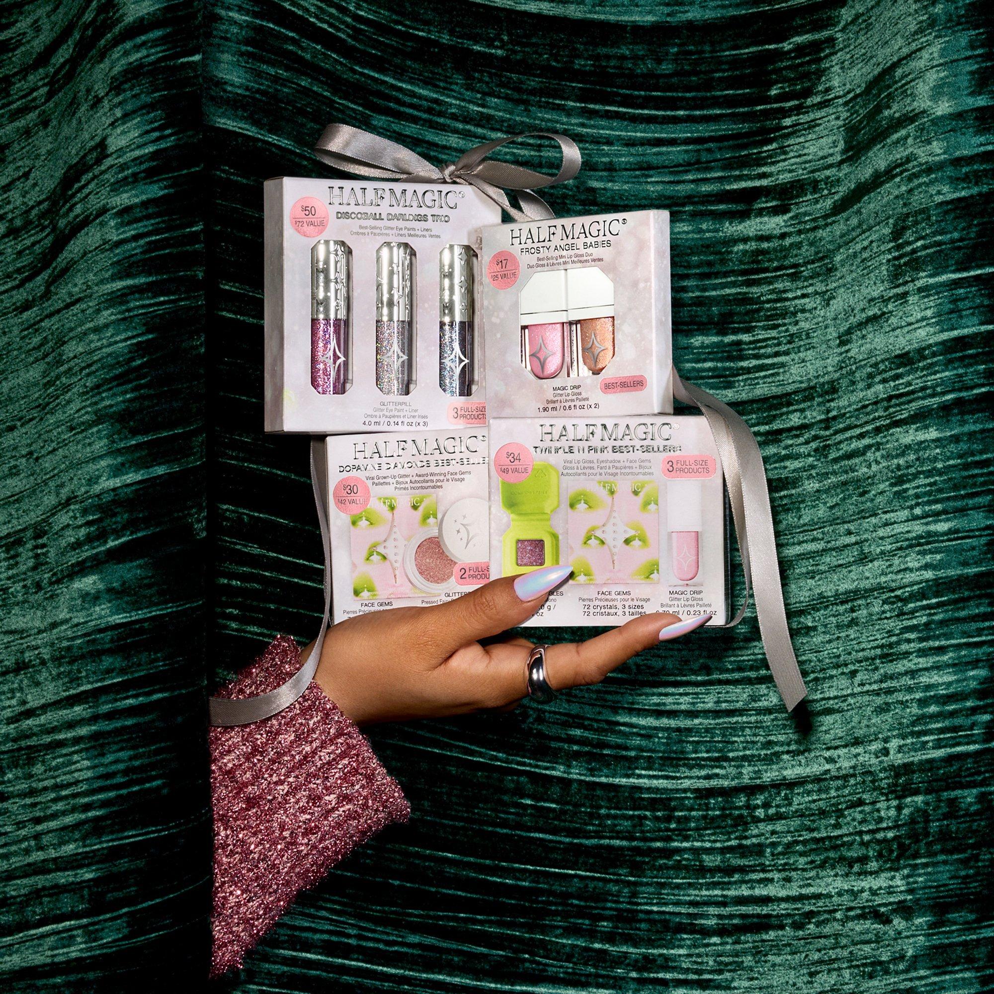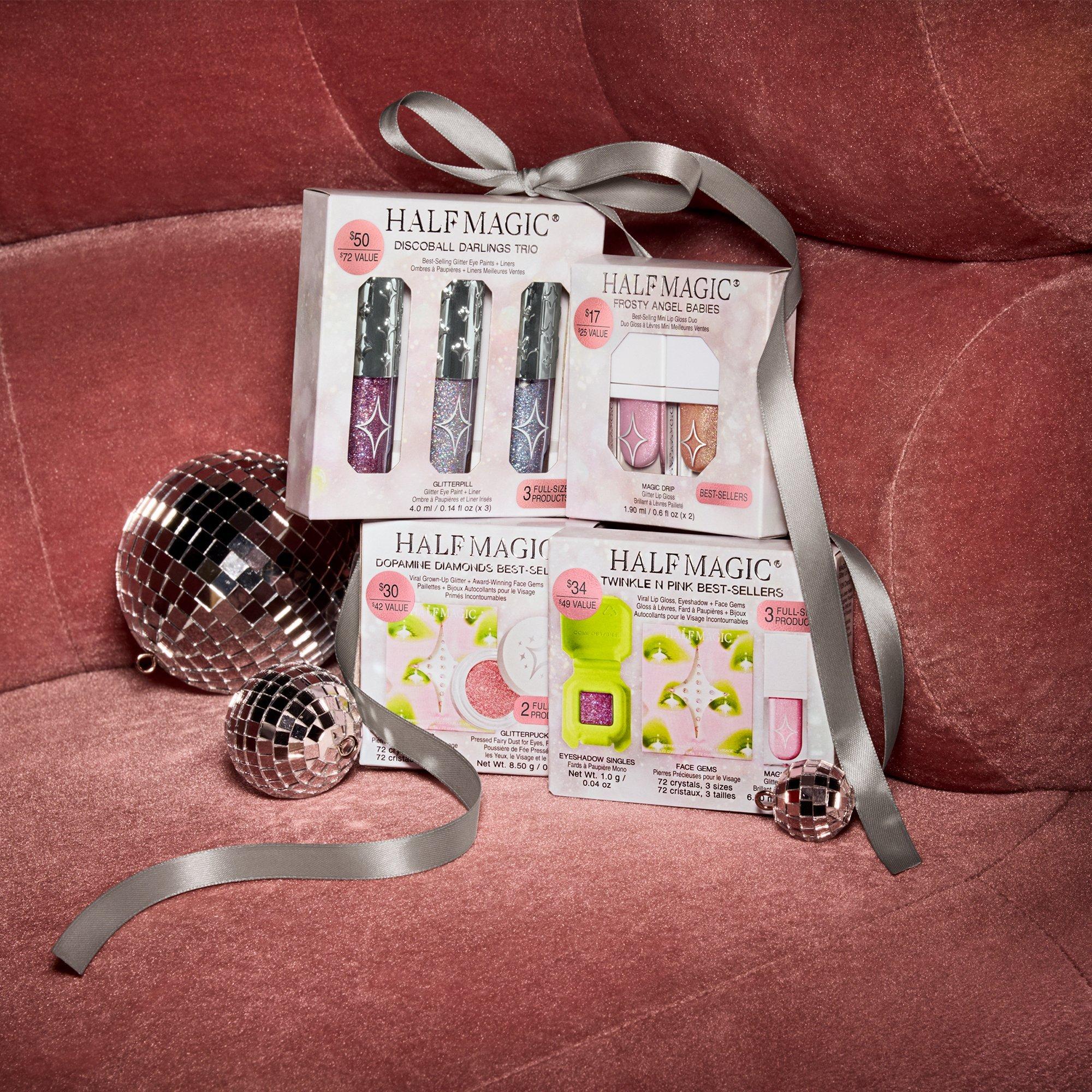 Half Magic's Twinkle N Pink Best-Sellers is the perfect trio for a full-sparkle eye + lip look in three angelic pink hues.