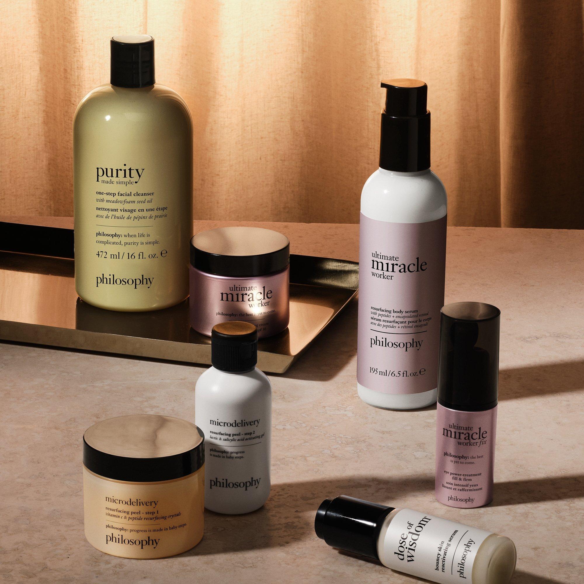 The Philosophy Ultimate Miracle Worker Resurfacing Body Serum is a lightweight serum for the body that absorbs instantly to plump from every angle for a 3D remodeled effect. Clinically proven to immediately double skin’s moisture & reduce crepiness, this body care serum tightens and smooths skin.