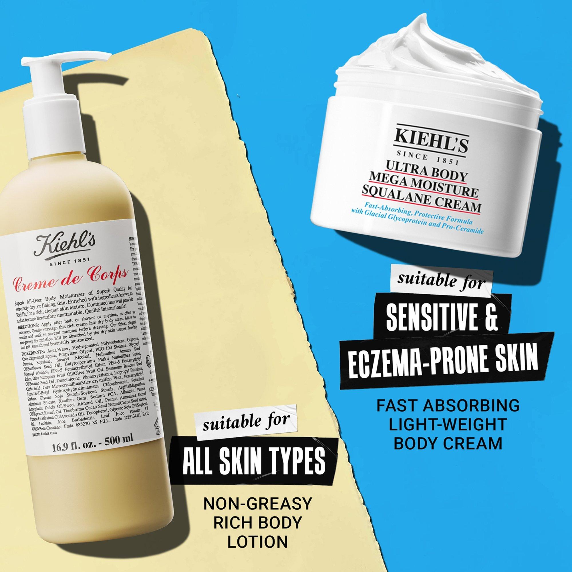 Kiehl's Since 1851 Ultra Body Mega Moisture Squalane Cream is formulated with Squalane and powerful Pro-Ceramides to deeply hydrate skin for up to 3 days, even through showering. Formulated to absorb into skin within 3 seconds for long-lasting hydration and protect against extreme environments.