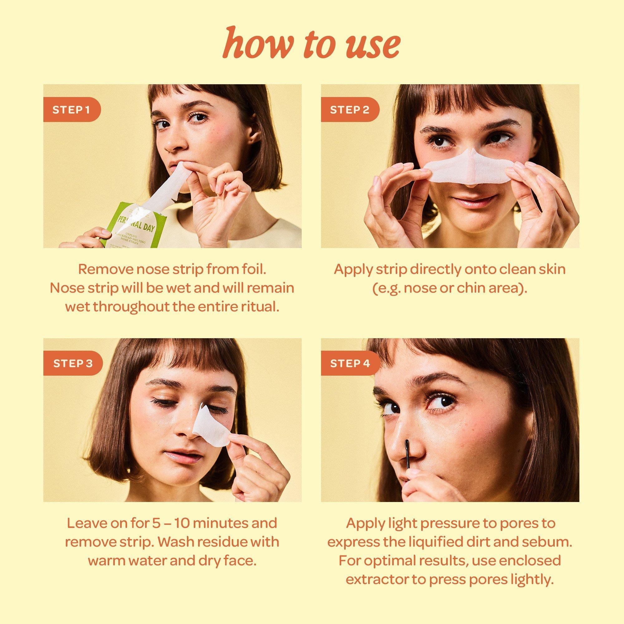 Remove stubborn blackheads without damaging pores. Personal Day Unplug Blackhead-Melting Nose Strips use nanotechnology to bring powerful ingredients deep into pores to melt blackheads. Apply light pressure after wearing the wet strip, and liquified gunk gently leaves pores without rips or tears.