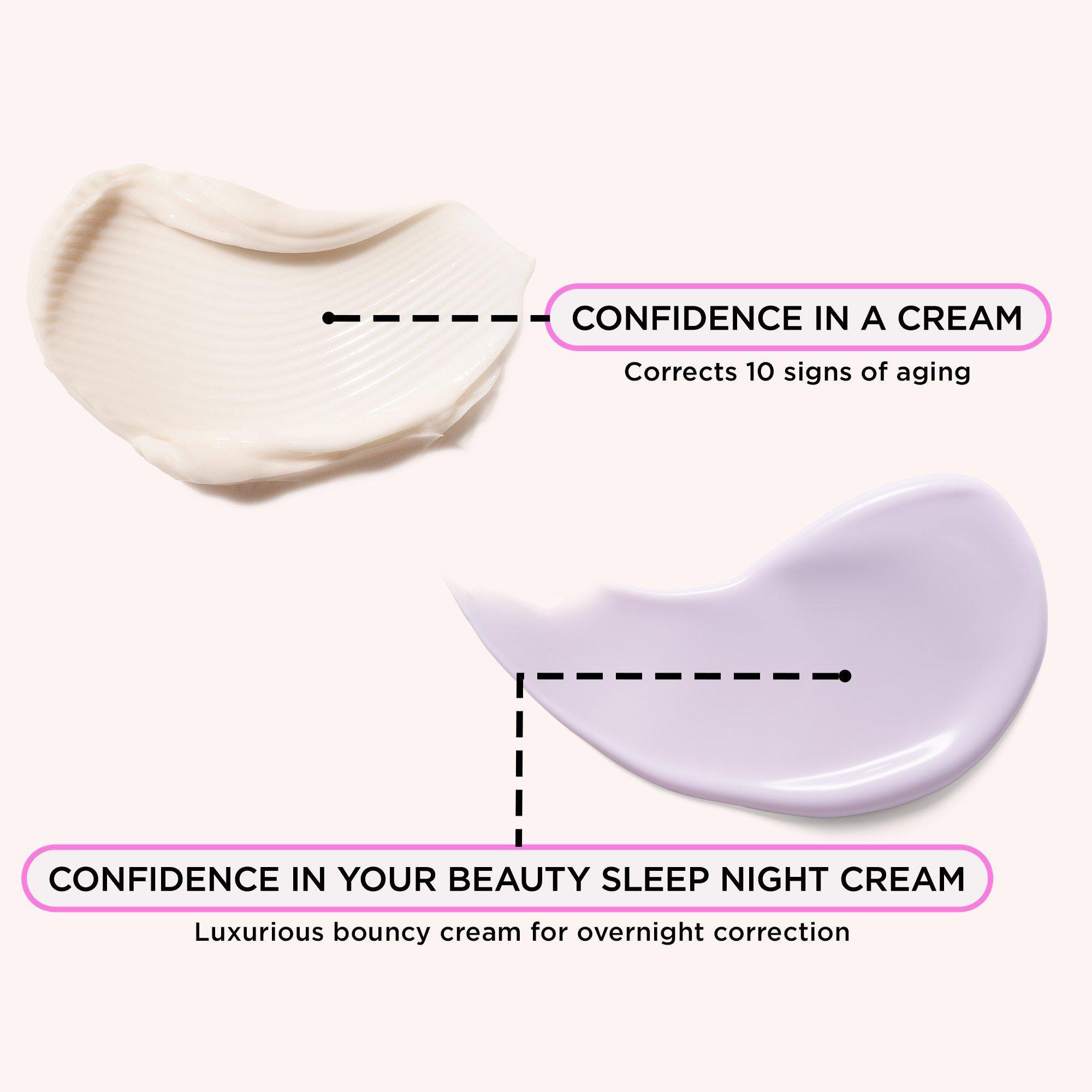 • Unwrap your smoothest, most hydrated skin from day to night with full sizes of our best-selling, hydrating Confidence in a Cream moisturizer to correct 10 signs of aging and rejuvenating Confidence in Your Beauty Sleep Night Cream.
