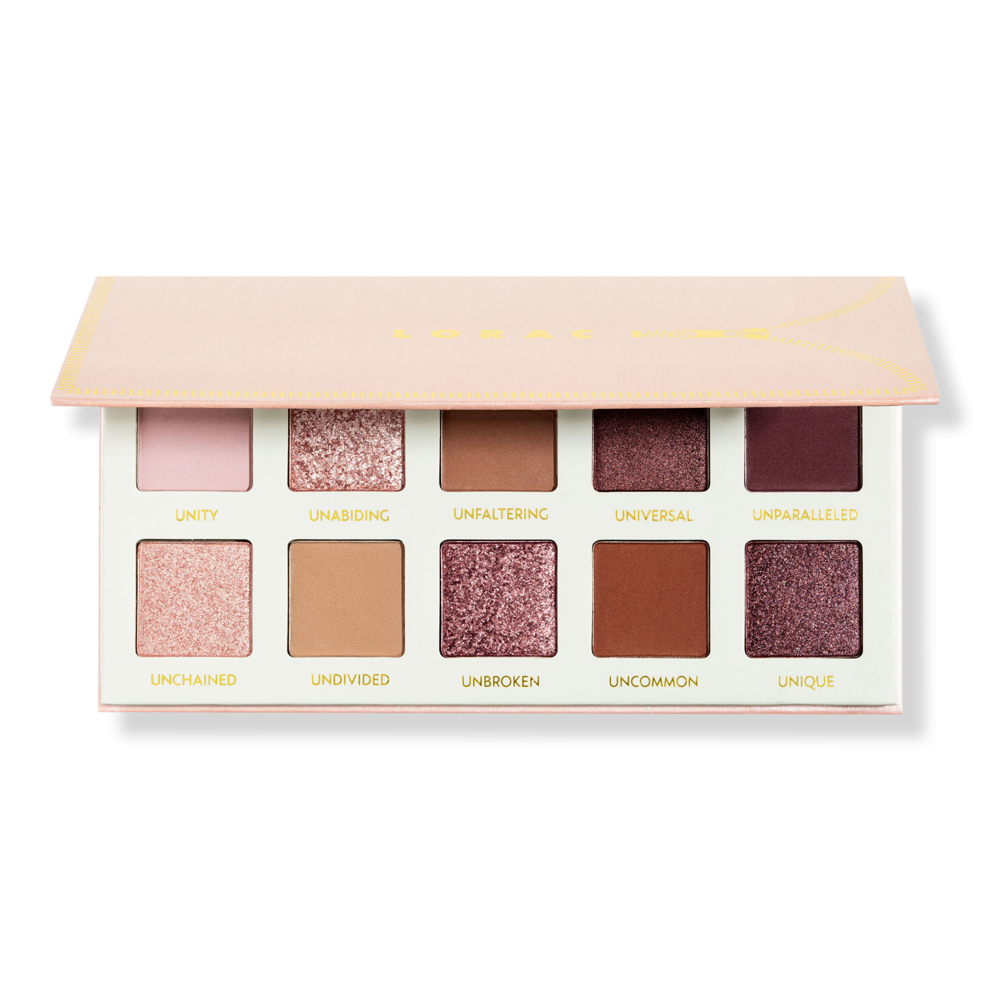 • Bottom Row: Unchained (shimmering ivory pearl), Undivided (matte light beige), Unbroken (sparkling rose gold), Uncommon (matte pink coral), Unique (shimmering mauve)