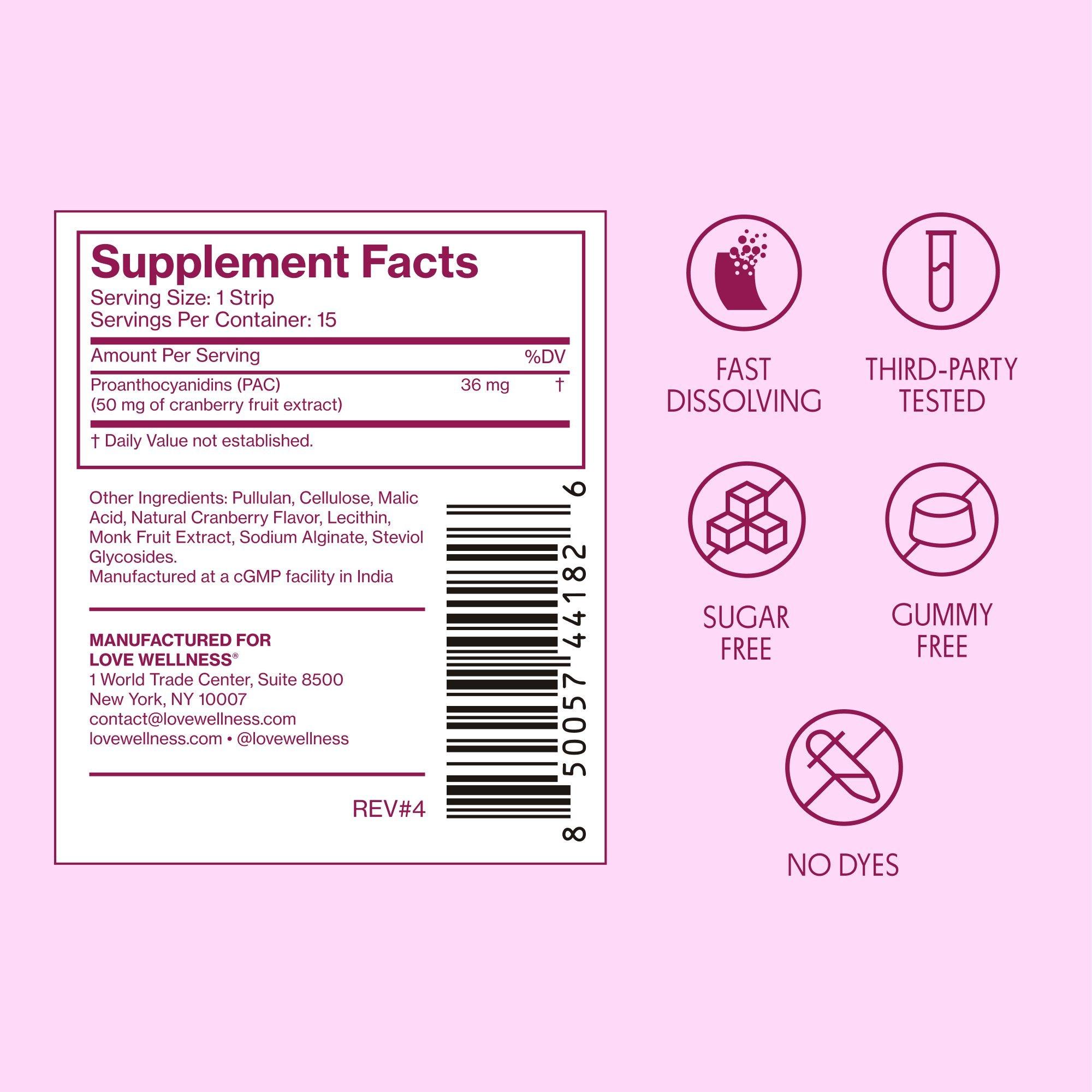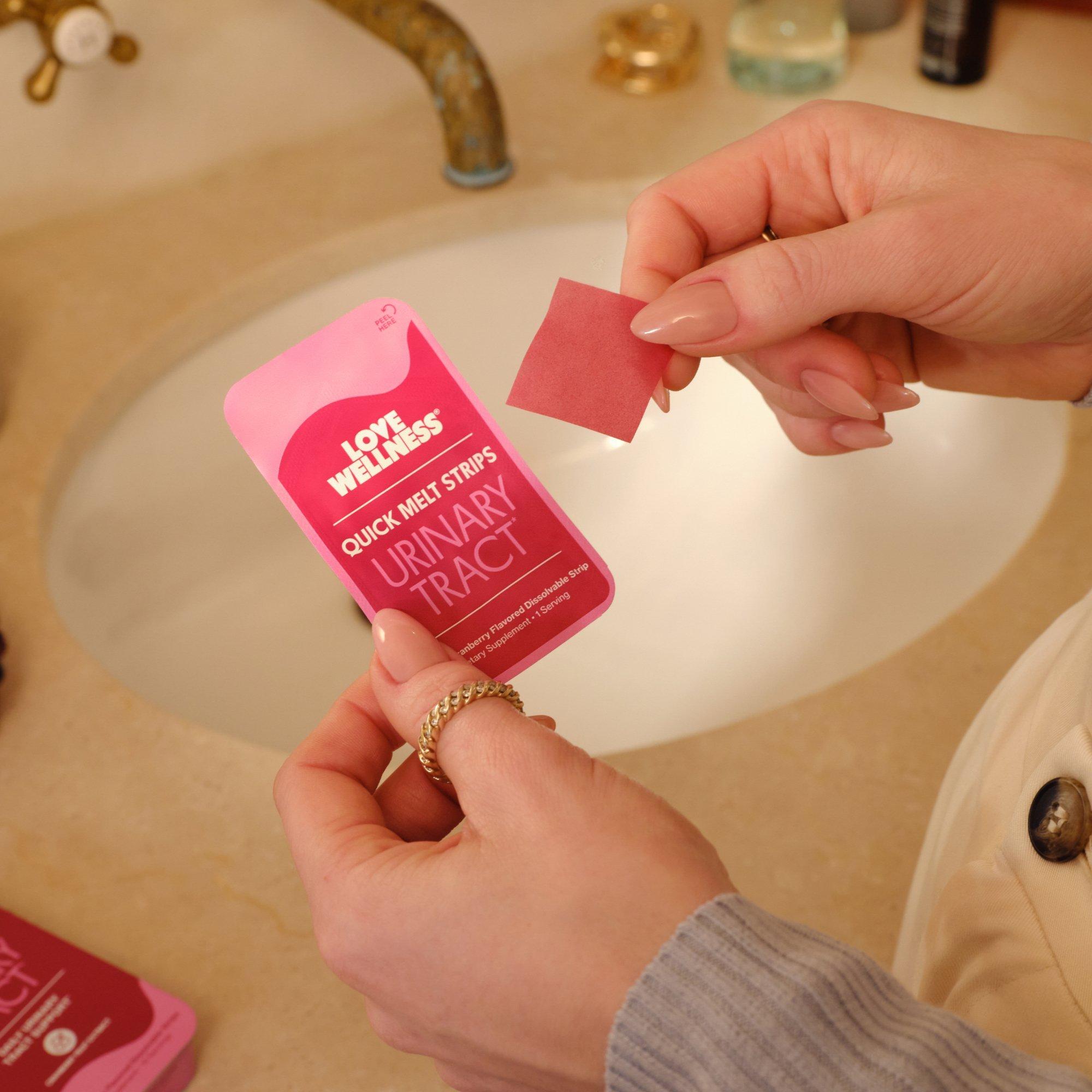 Love Wellness Urinary Tract Quick Melt Strips are fast dissolving, cranberry-flavored strips designed to support urinary tract and bladder health. These convenient strips melt on your tongue for easy, on-the-go support, anytime, anywhere.*